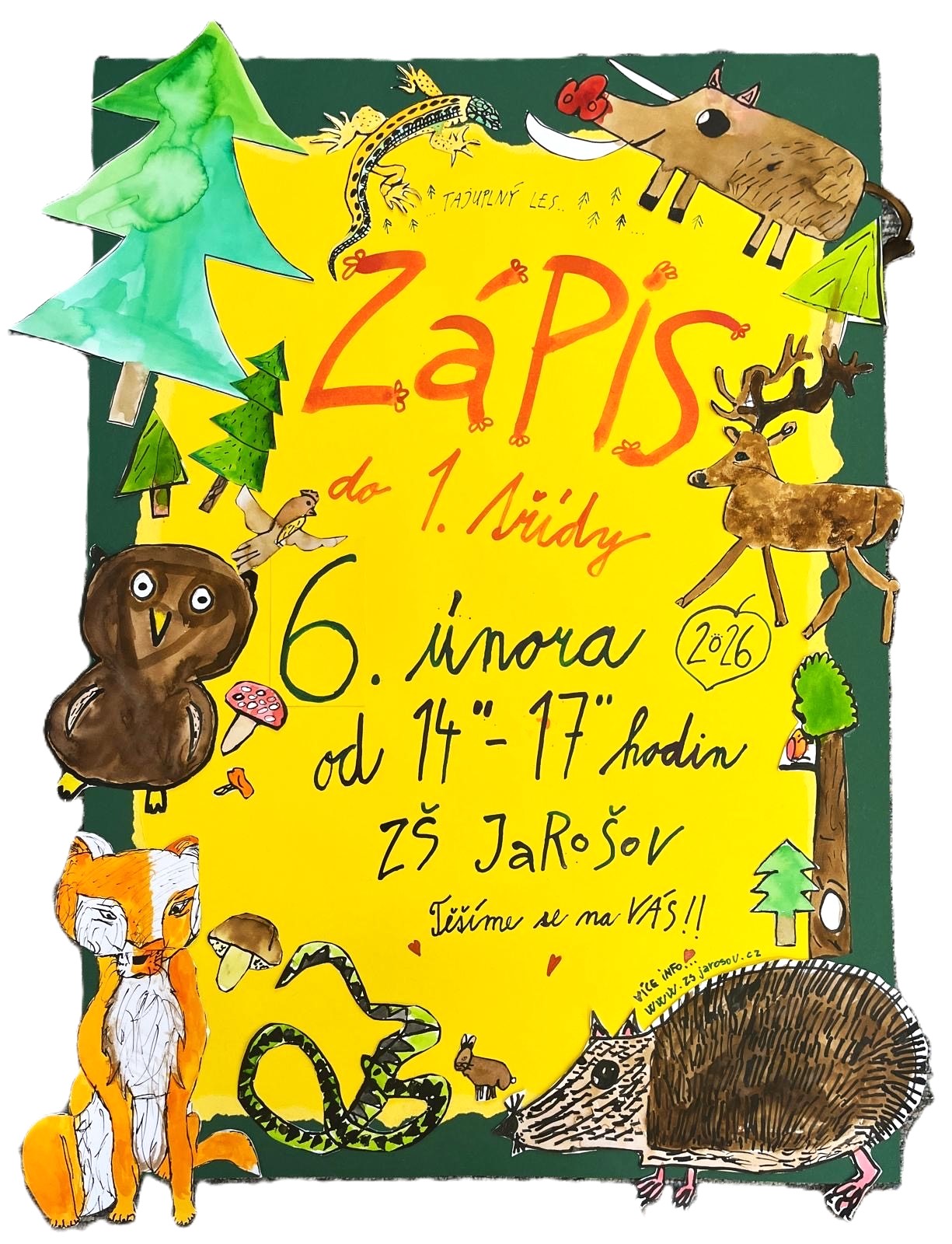 Vážení rodiče, srdečně Vás a Vaše děti zveme v pátek 6. února 2026 od 14 do 17 hodin na procházku „Tajuplným lesem“, který bude letos hlavním tématem zápisu do 1. ročníku naší školy.