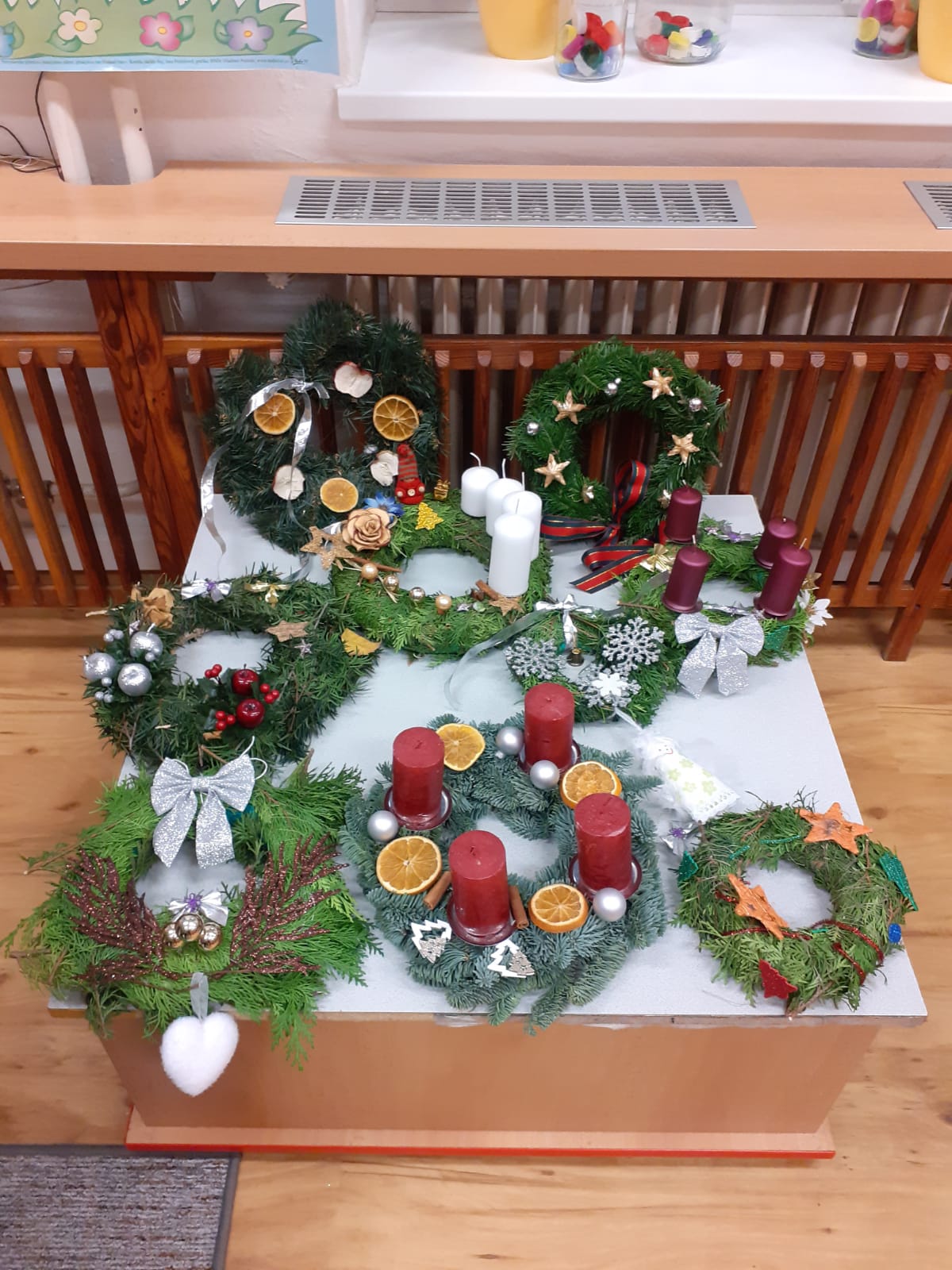 Druhákům se moc povedly adventní věnečky. Jsou určeny na stůl nebo k zavěšení na dveře.
