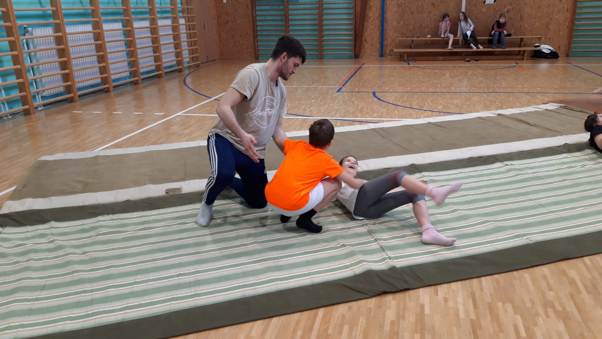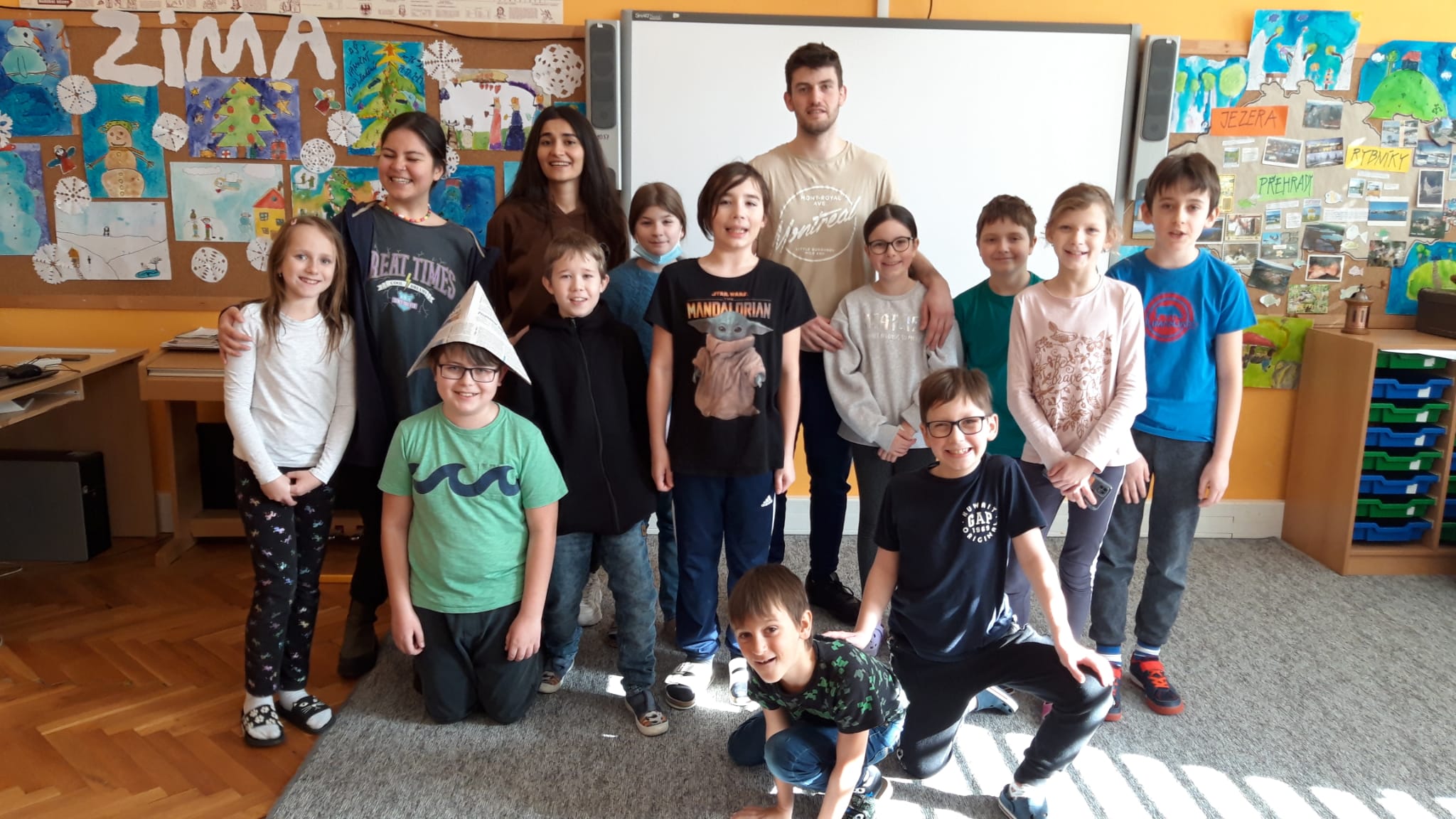 Pravidelně k nám dochází slečny Ekin (původem z Turecka) a Arzu (pocházející z Azerbajdžánu), které jsou na stáži v agentuře Akropolis. Našim dětem se věnují část hodiny, kdy hrají hry a soutěže či zpívají písničky - vše samozřejmě v angličtině. Máme tak možnost si vyzkoušet praktický jazyk v komunikaci s cizinci. Měli jsme též potěšení z několika návštěv Španěla Santiaga, který s dětmi procvičil judo disciplínu v rámci hodin tělesné výchovy. Santi bohužel příští týden odjíždí za lákavou pracovní nabídkou do Irska, tak jsme rádi, že jsme měli možnost jej alespoň krátce poznat. Přejeme mu hodně zdaru a děkujeme:-)