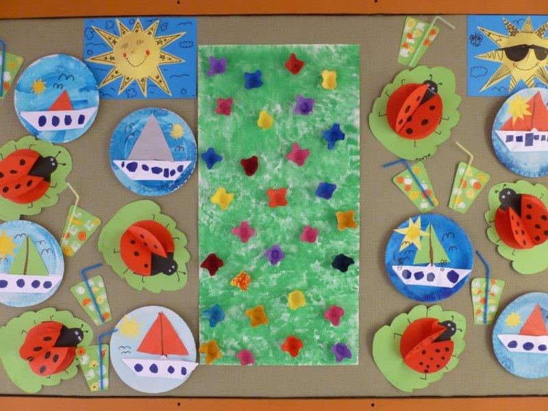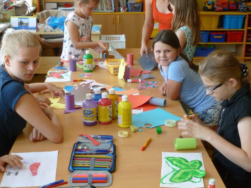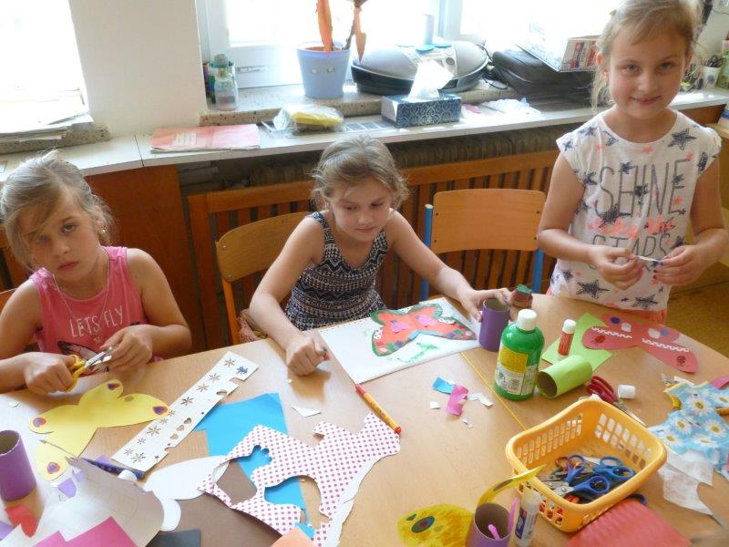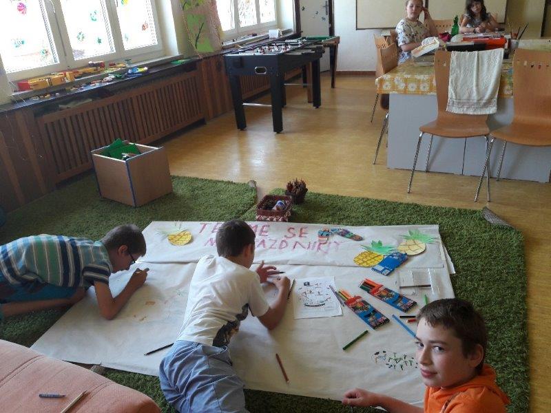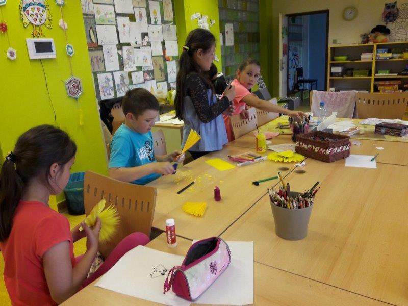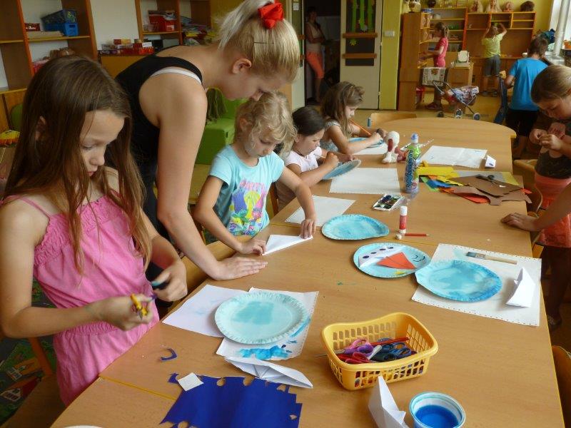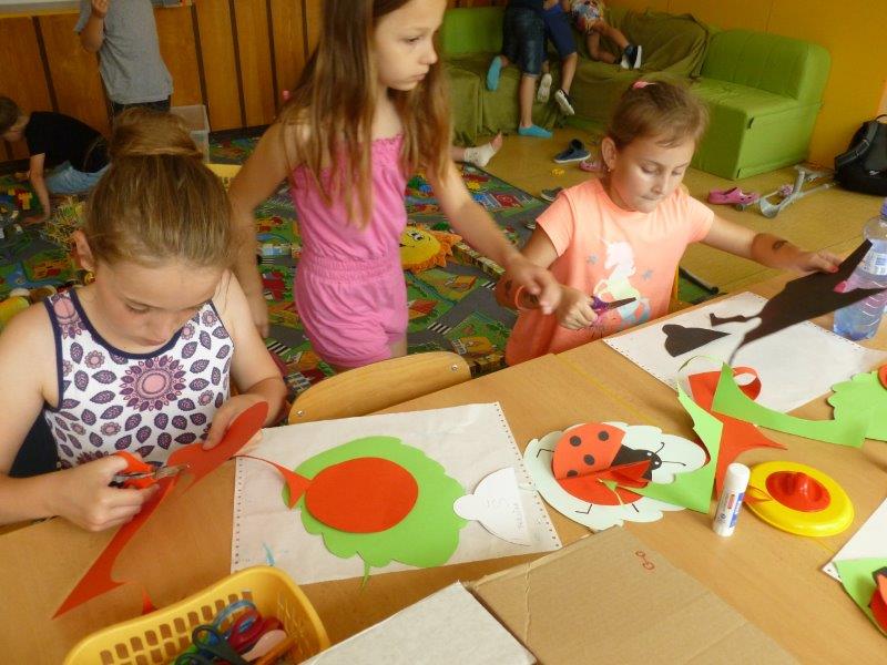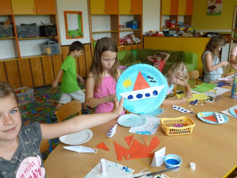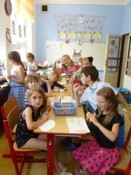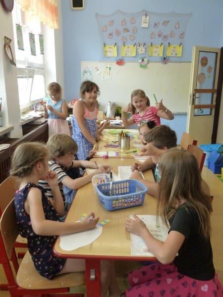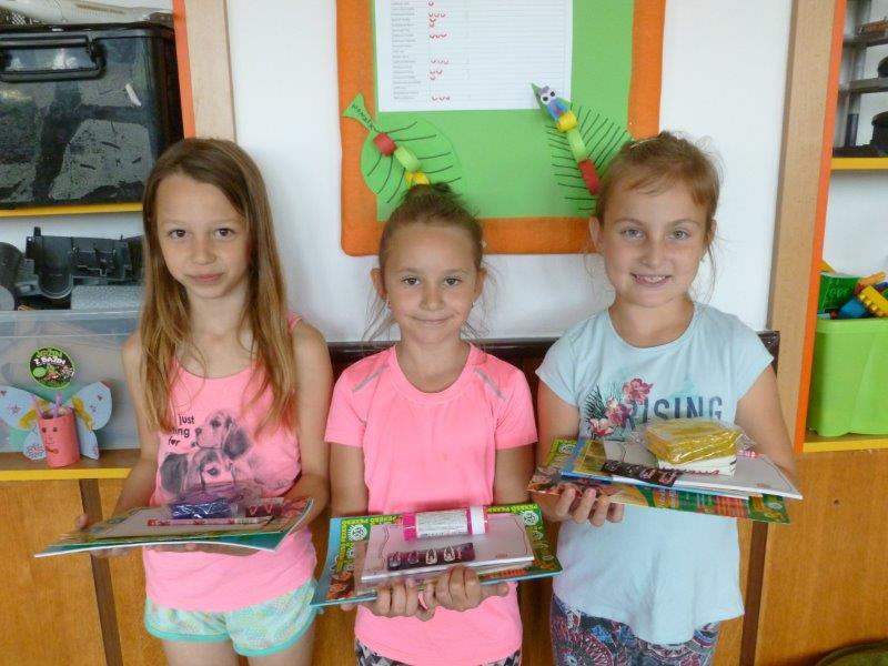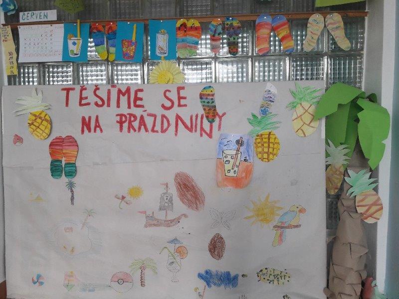 Například slunečnice, vážky, papírové modely plavek, motýlky, lodičky na tácku, berušky. Naše těšení na prázdniny jsme přenesli na společný plakát. A další dobrodružství již čekalo ve škole v přírodě. Děti, které z různých důvodů na tuto školu neodjely, docházely do školy a družiny. Zde společně vytvořily koláž - moře s námořníky, lodě směřující k pokladu. Spoustu času jsme pobývali venku, sportovali a hráli si. Družinku jsme si stihli připravit na prázdninový odpočinek. Pěvecký kroužek ovšem nezahálel a začal již nácvik programu na zářijové zahájení. Také jsme odměnili výherkyně soutěže ve sběru úsměvů - Vendu, Emmu a Terku - šikulkám blahopřejeme. A to je pro dnešek skutečně vše, další kapitola je dopsaná.