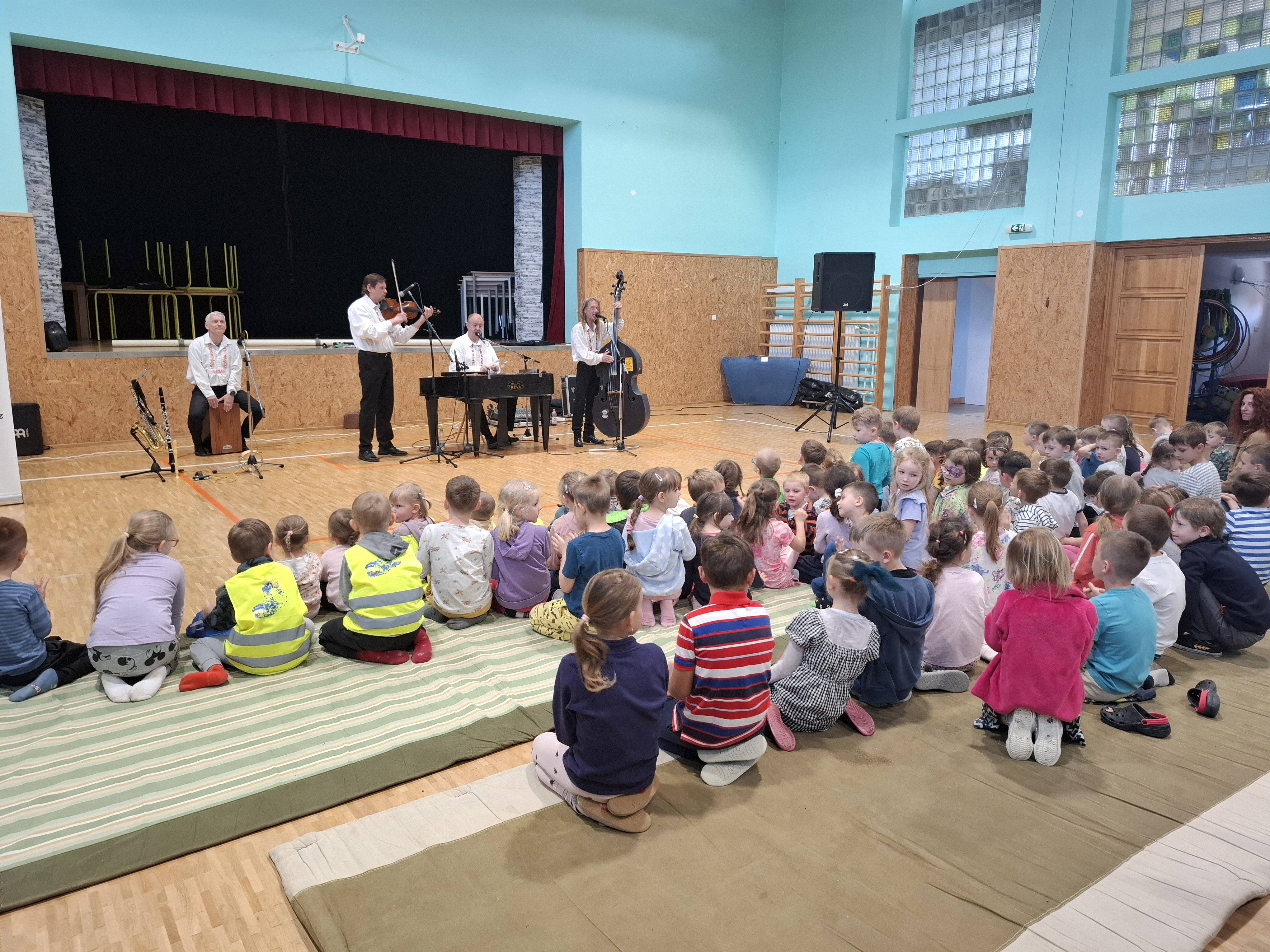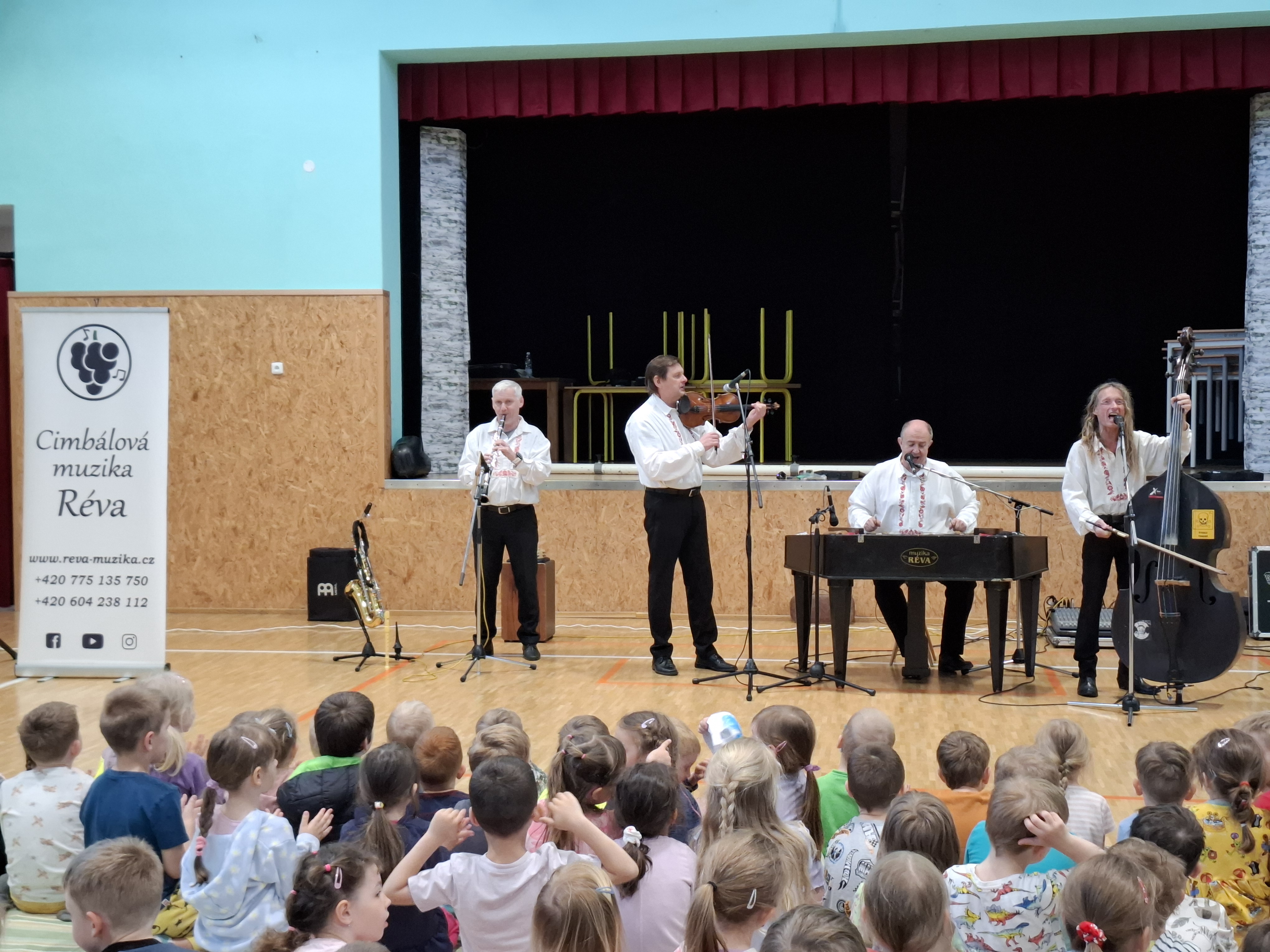 Jazz, klasickou hudbu, filmové melodie, lidové písničky, a dokonce i rock, to všechno nám v úterý 29. 4. 2025 zahrála Cimbálová muzika Réva s typickými lidovými nástroji. Děti si koncert moc užily a rády se přidaly do zpěvu písní.