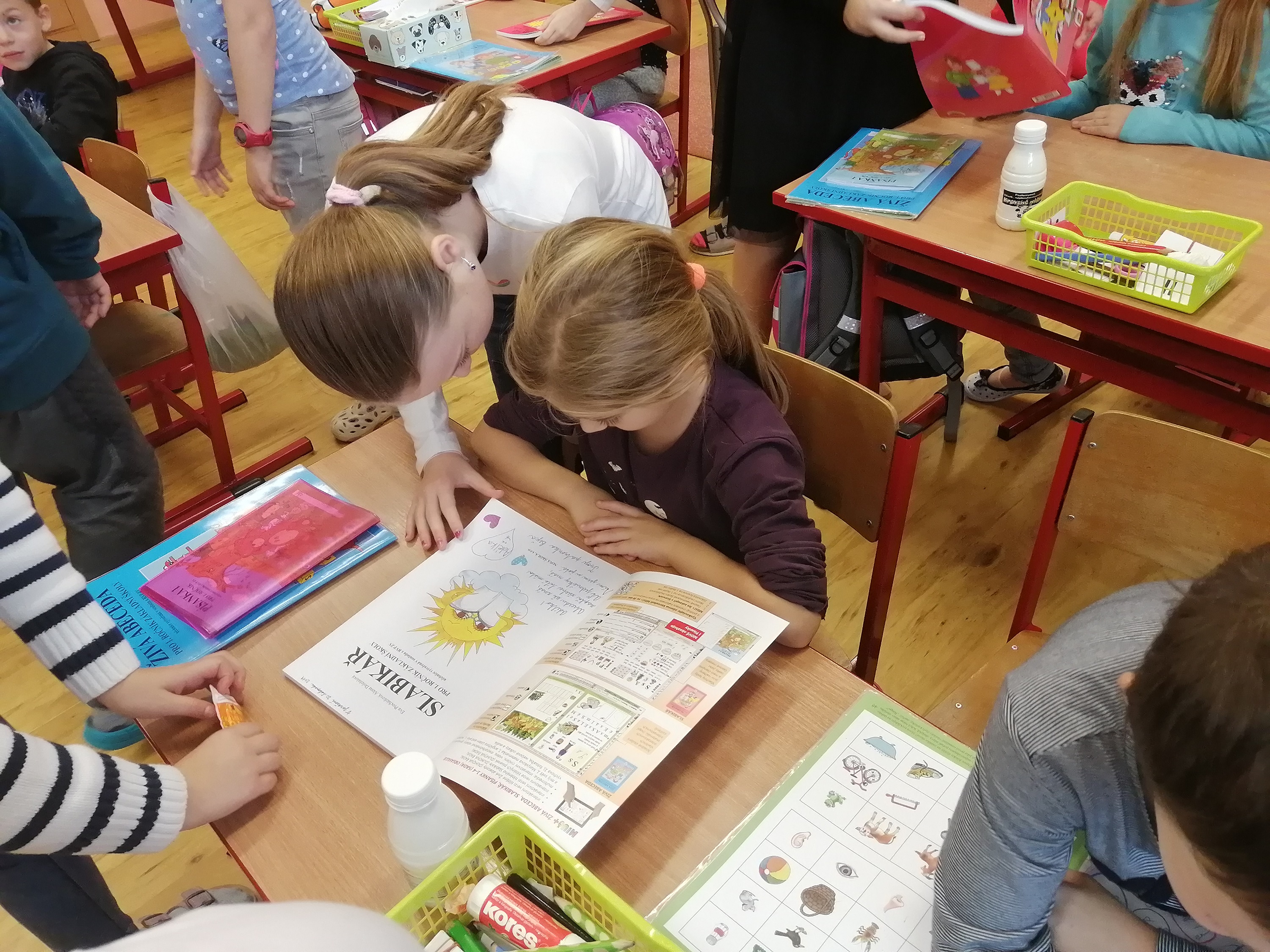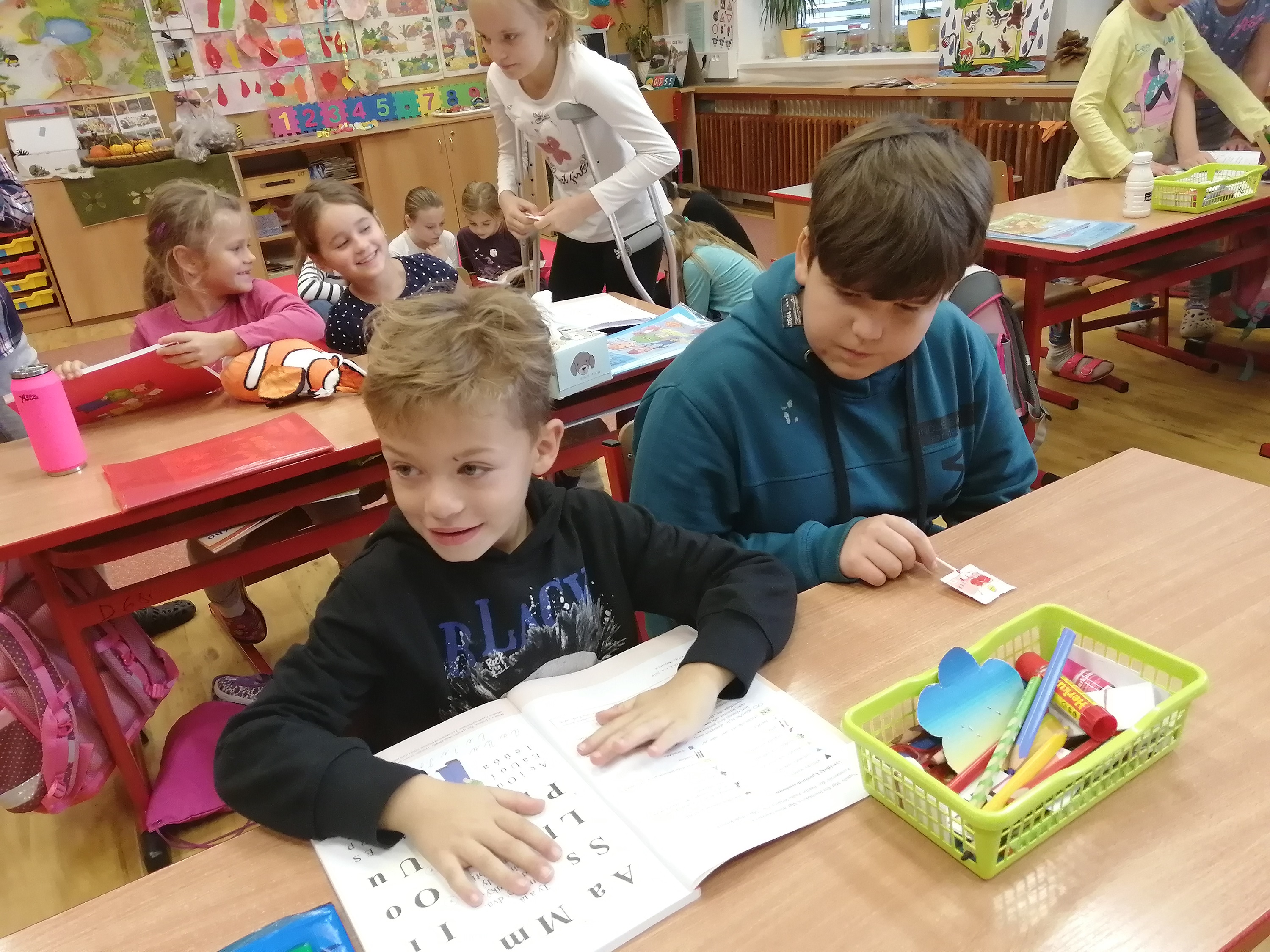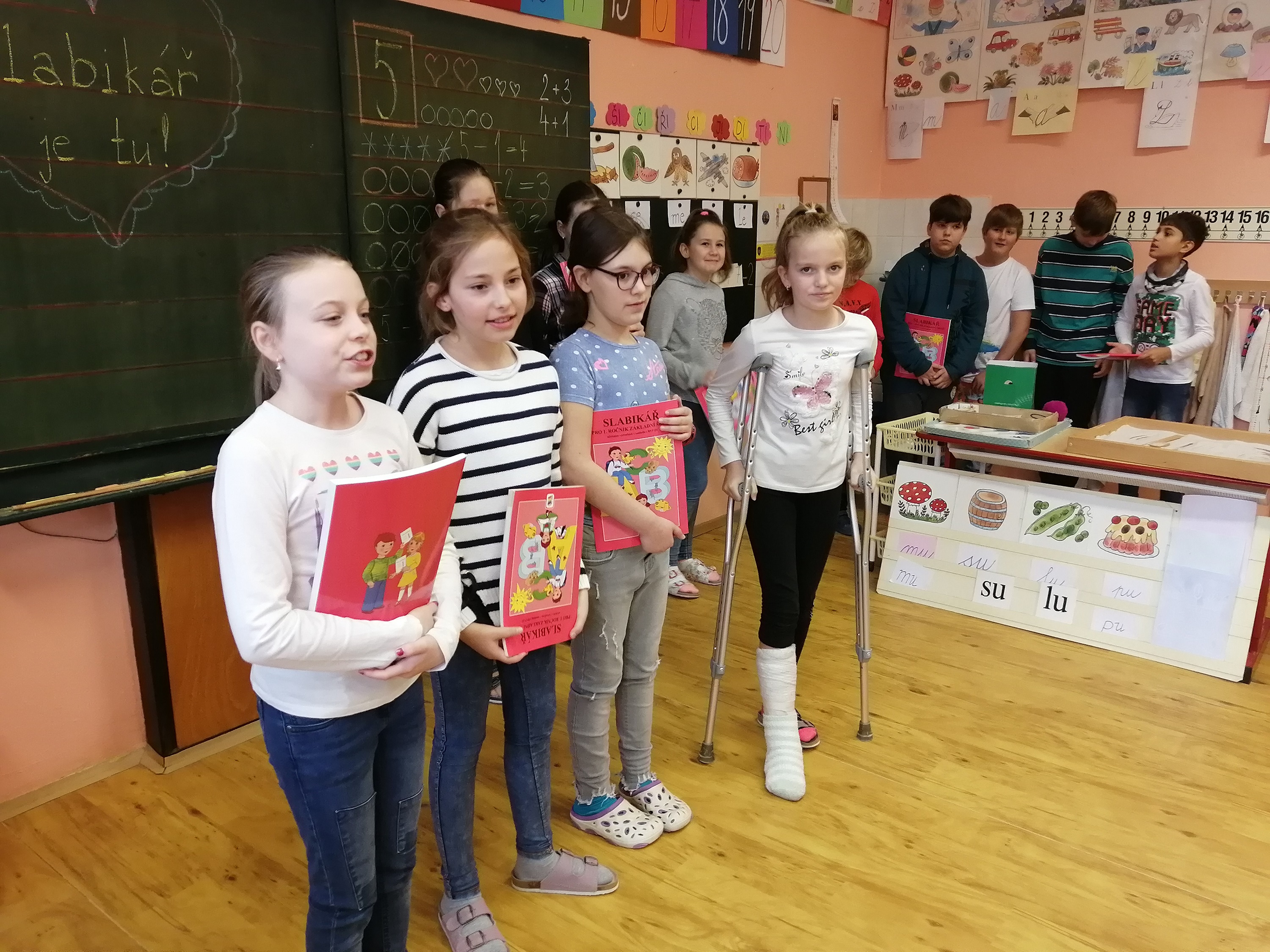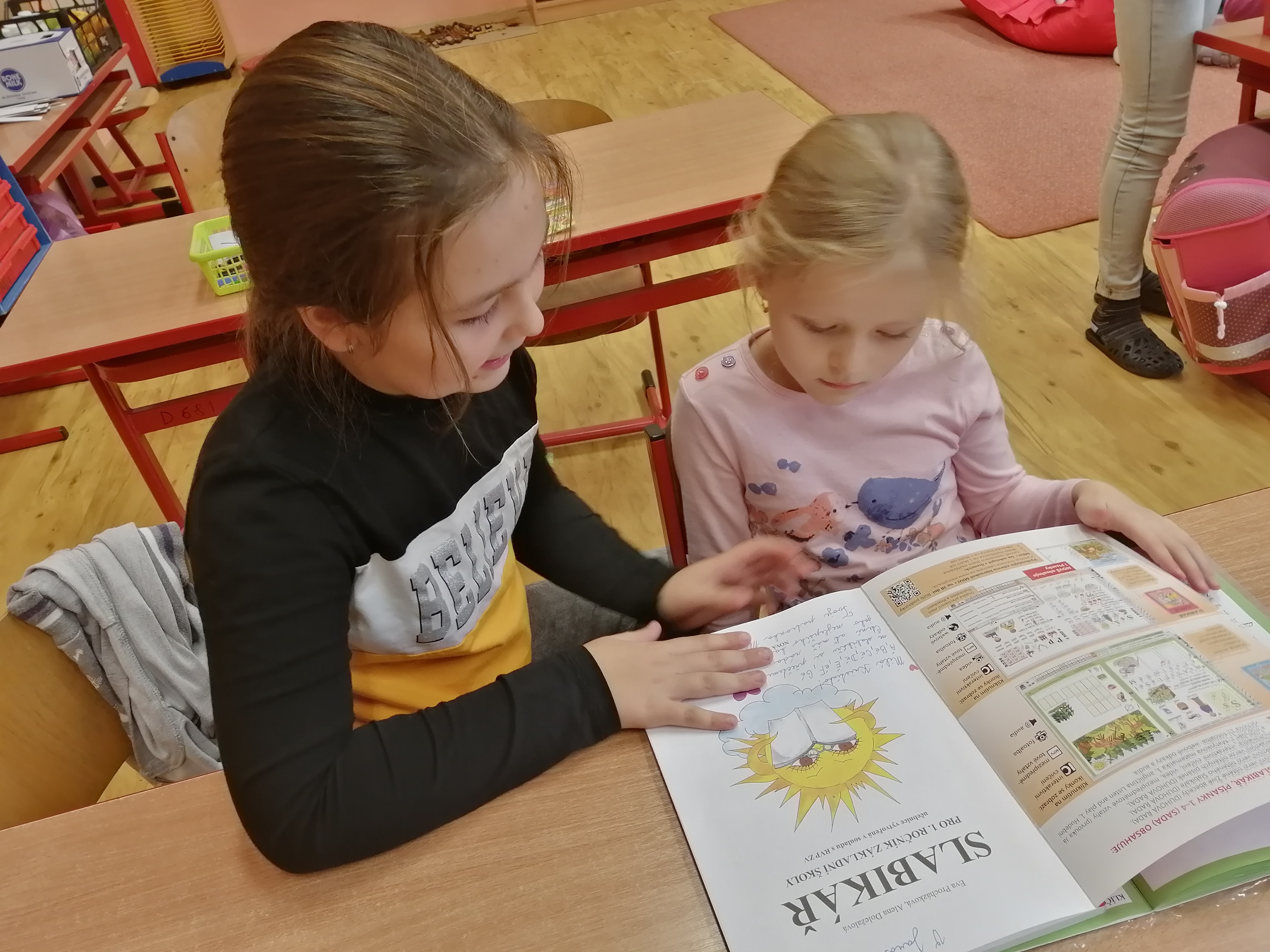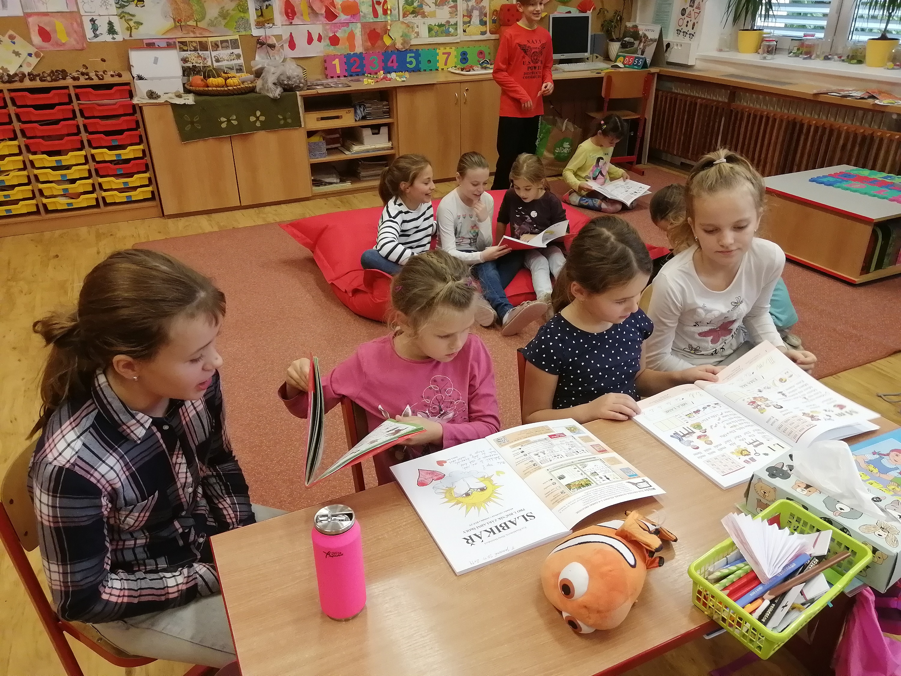 Živou abecedu už mají prváčci v malíku. Dnes měli opravdu významný den. Jejich velcí patroni, páťáci, jim přinesli dáreček - slabikář s milým překvapením. A celou hodinu si spolu četli!