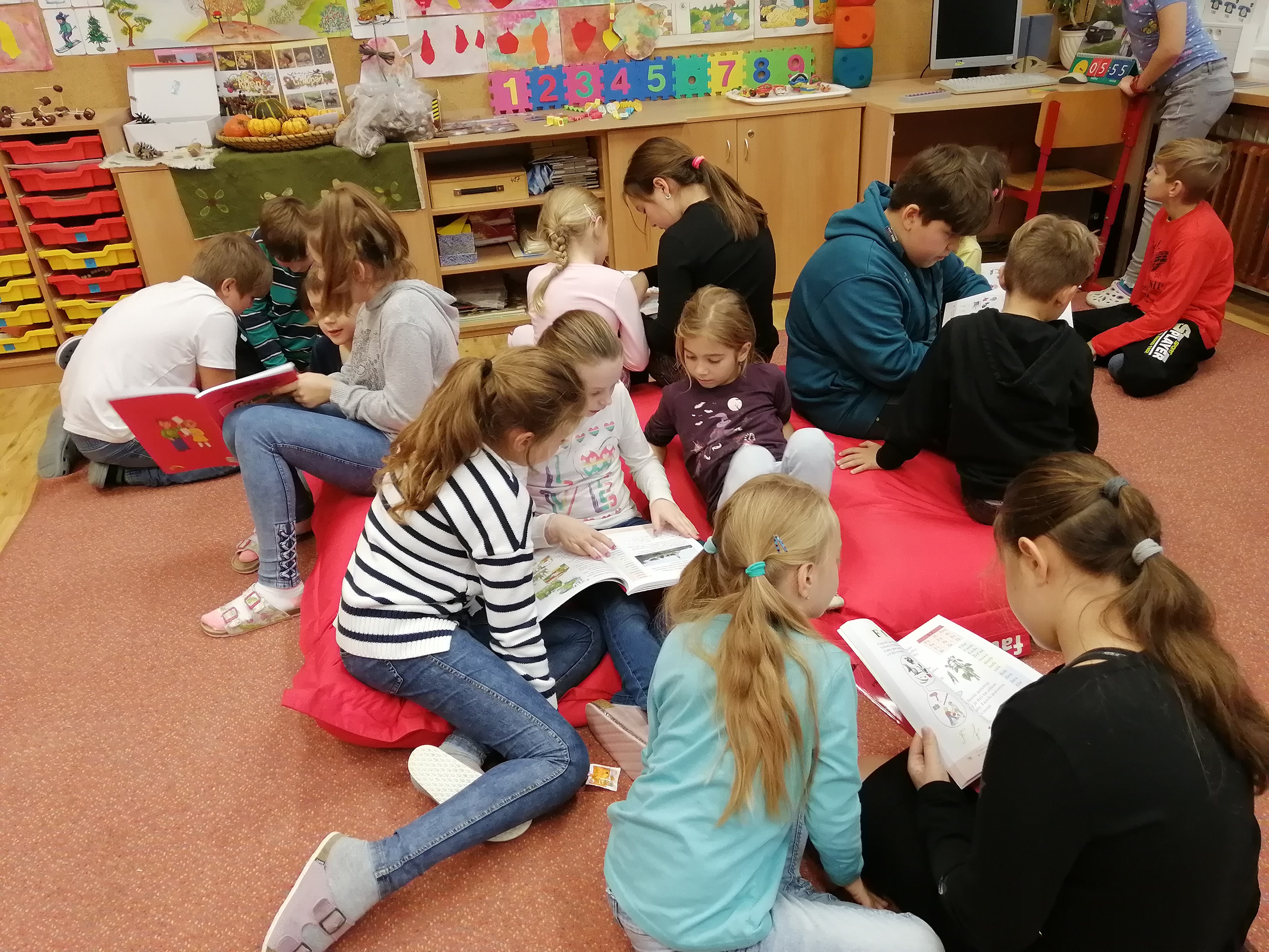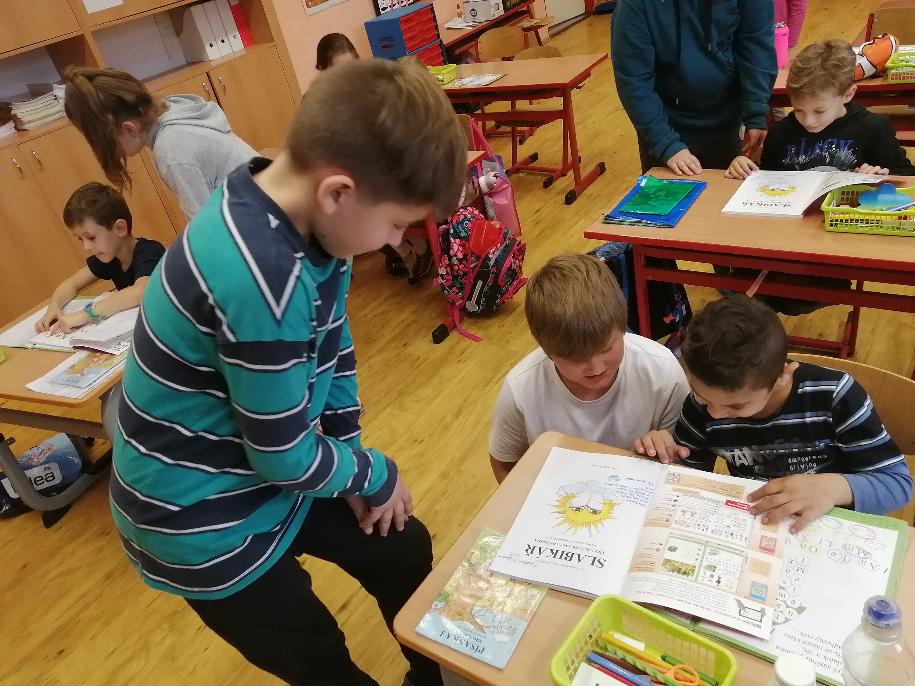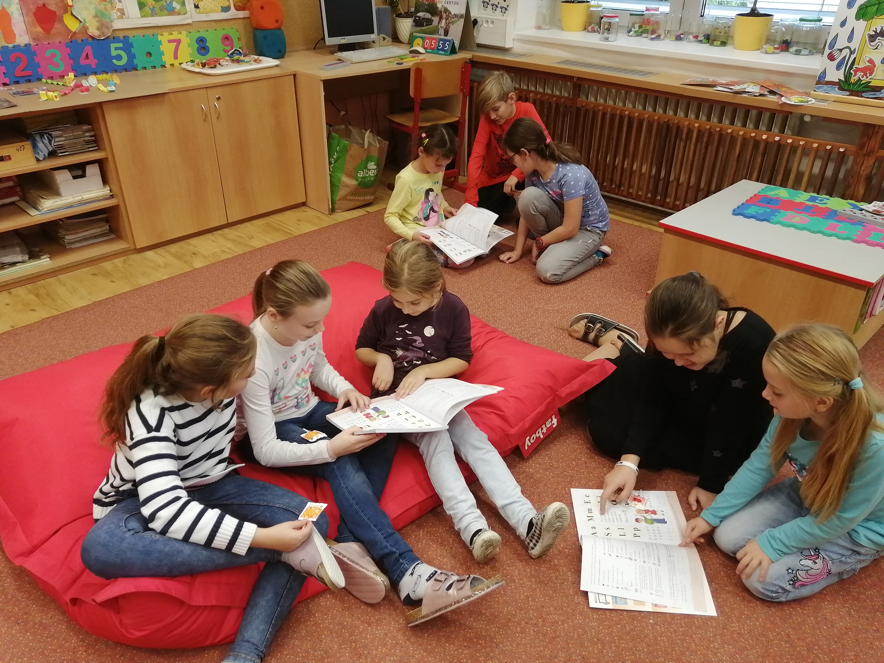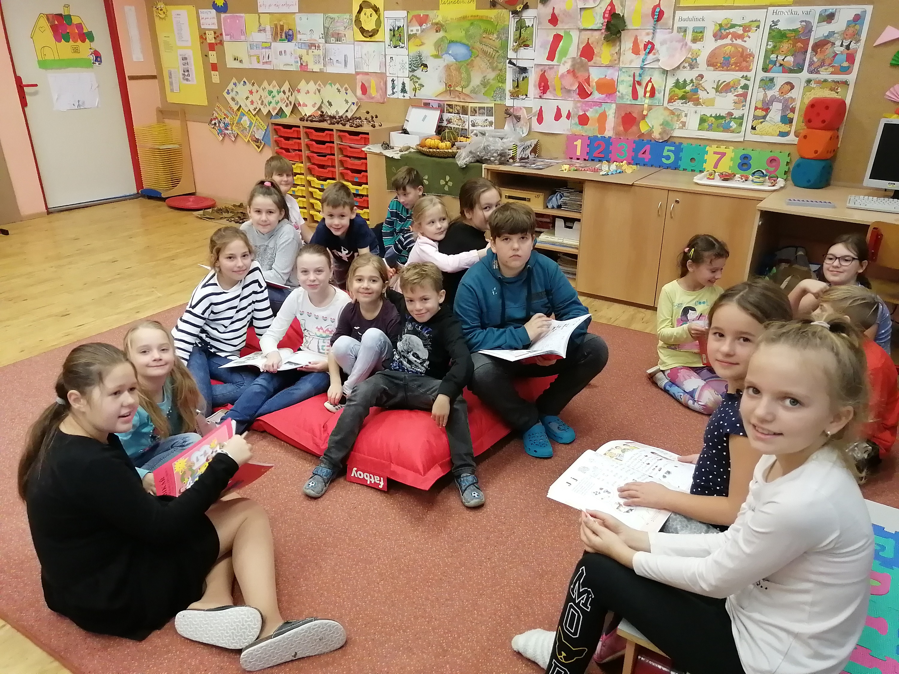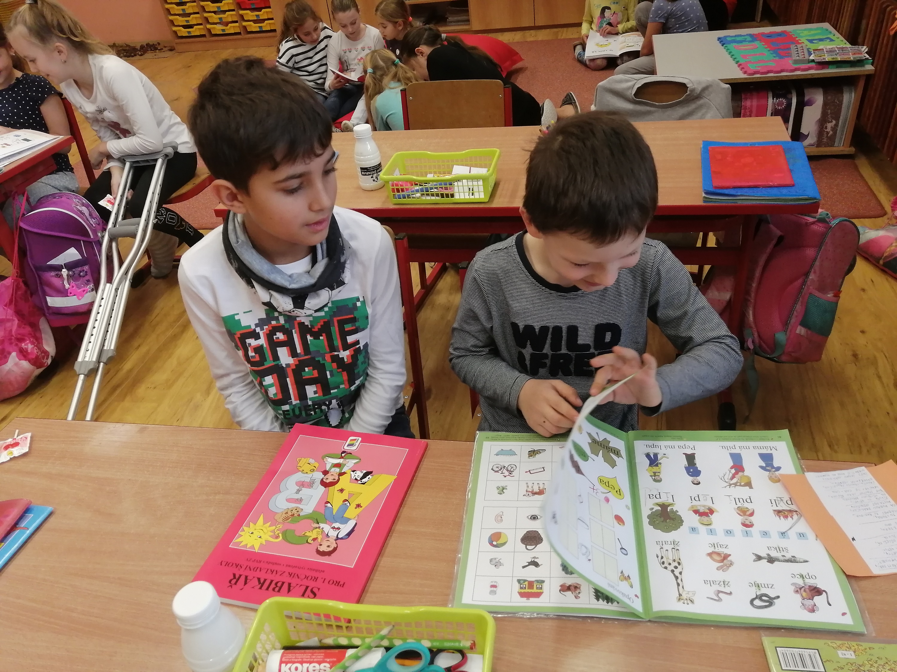 Živou abecedu už mají prváčci v malíku. Dnes měli opravdu významný den. Jejich velcí patroni, páťáci, jim přinesli dáreček - slabikář s milým překvapením. A celou hodinu si spolu četli!