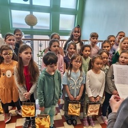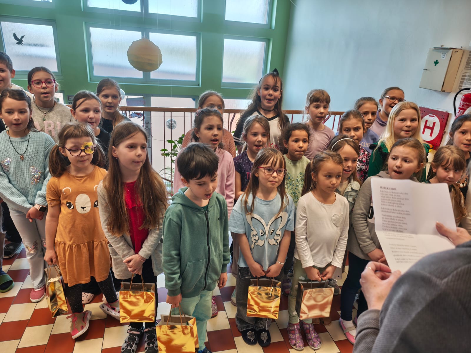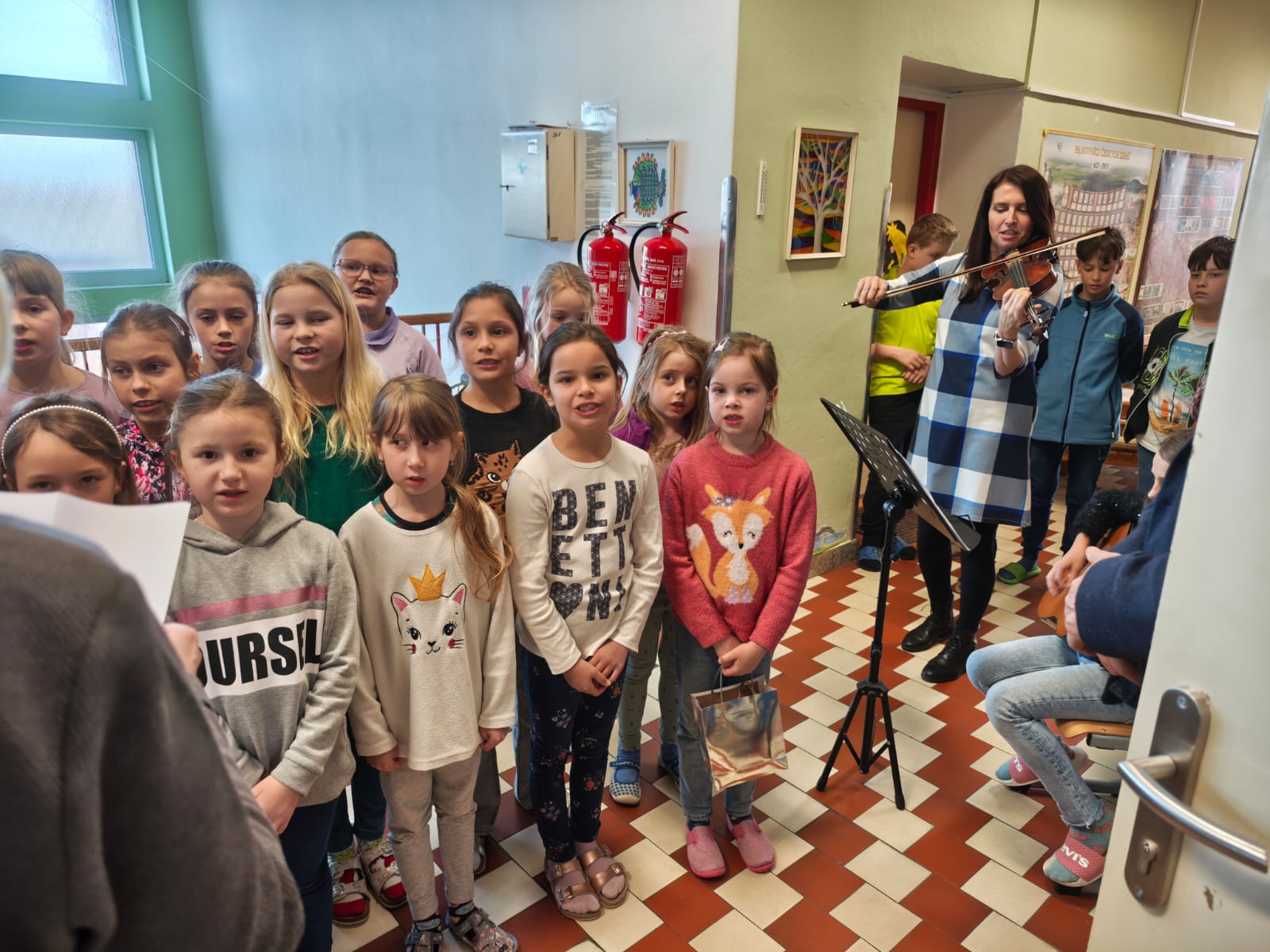 Pěvecký kroužek pod vedením paní vychovatelky Ivy Zemanové za doprovodu paní učitelky Anny Jurečkové, paní asistentky Veroniky Waidingerové a žákyně Adriany Štajnarové popřál všem našim zaměstnancům k jejich svátku. Jak? Přece zpěvem. Tak vše nejlepší a děkujeme za krásný dáreček od Spolku rodičů při ZŠ Jarošov.