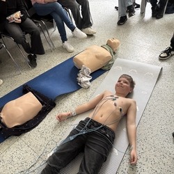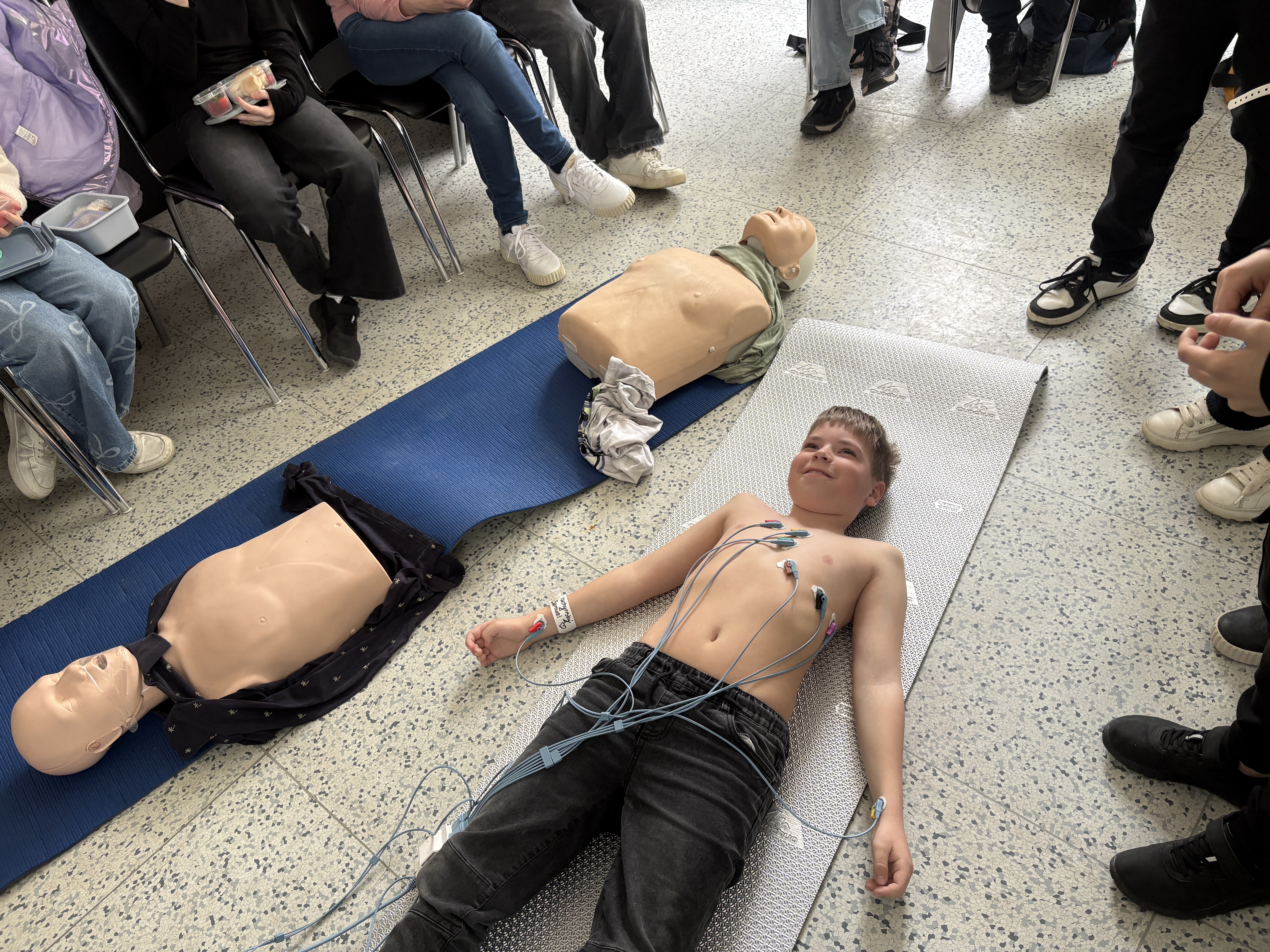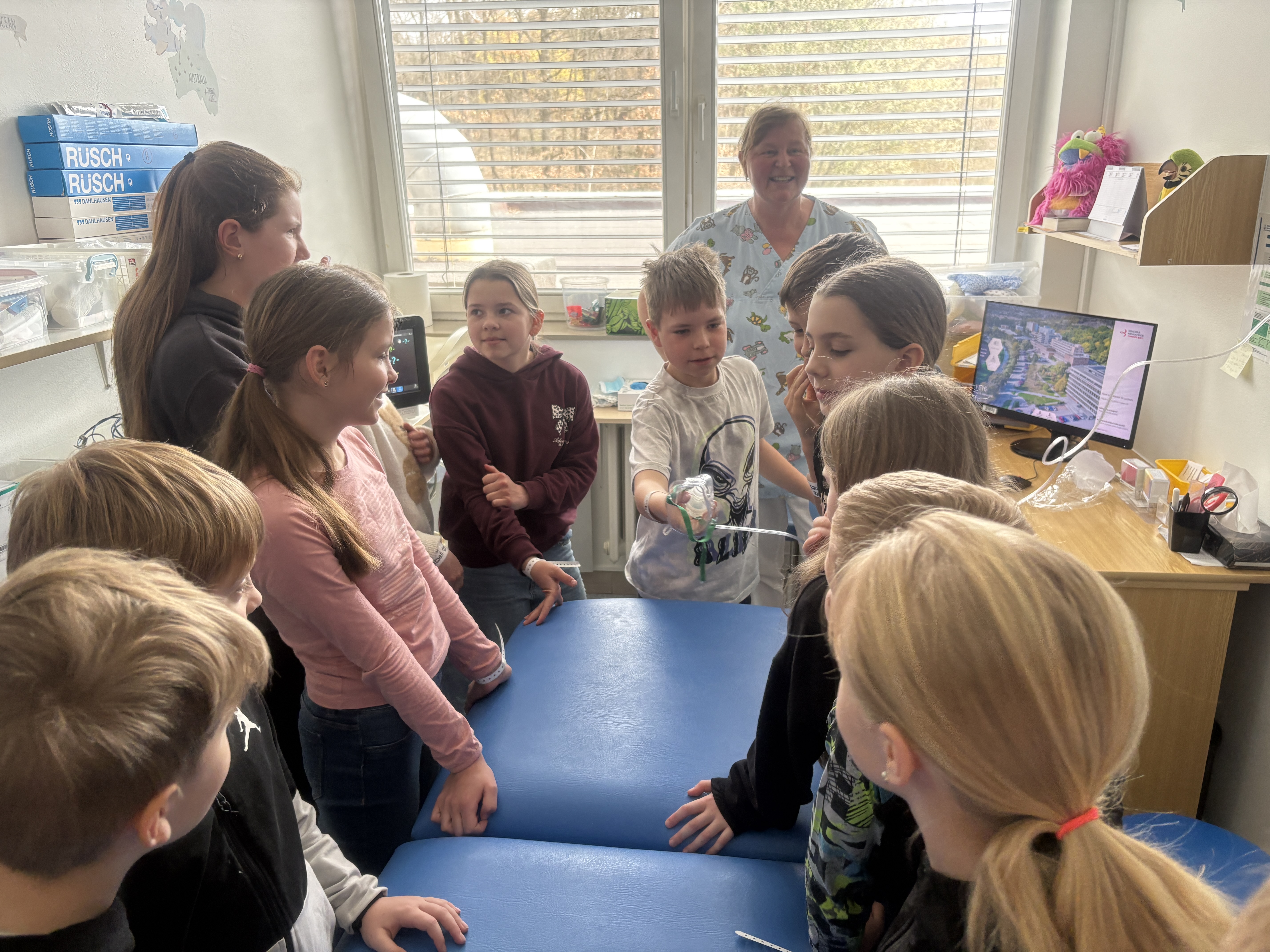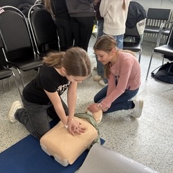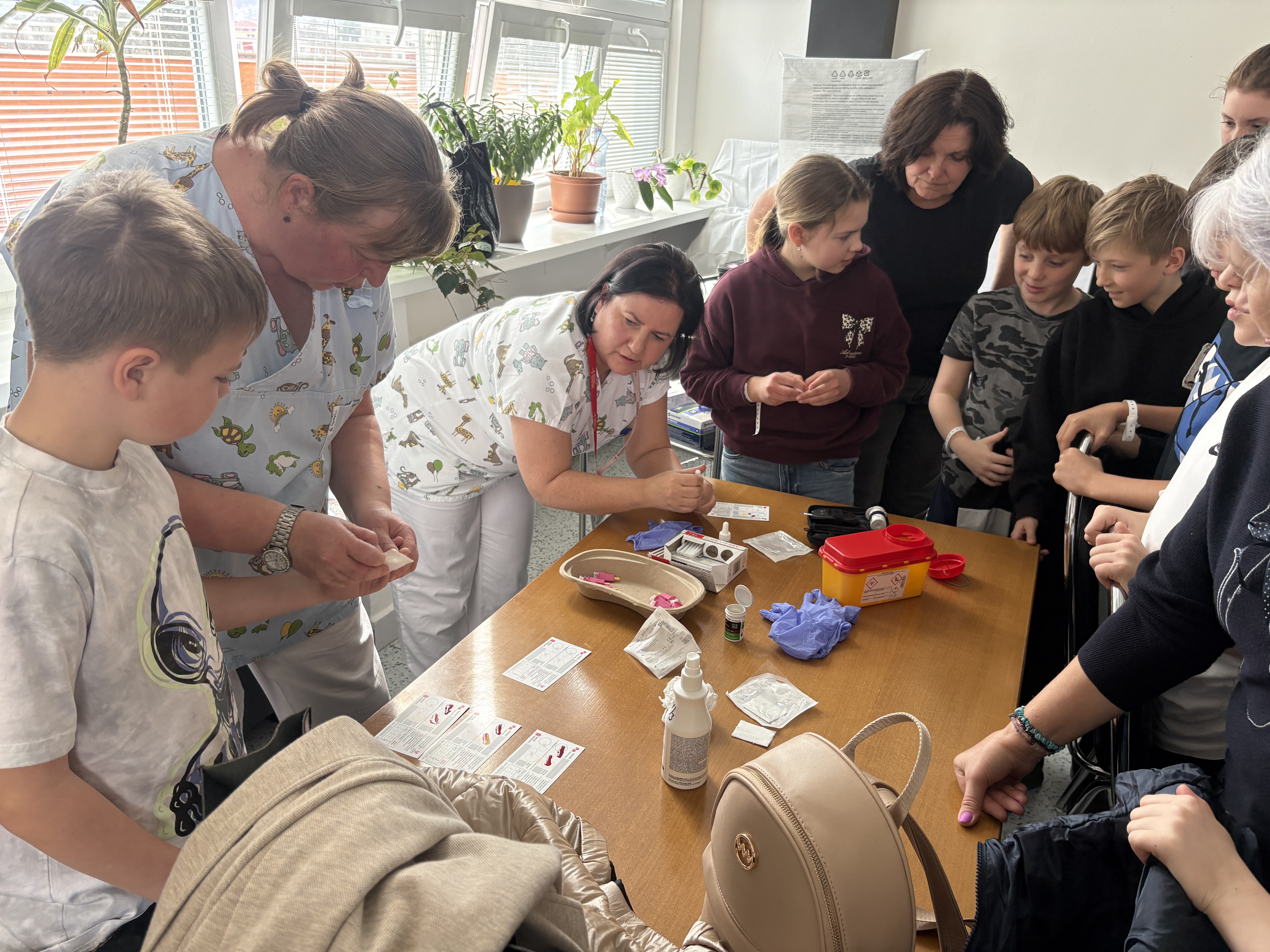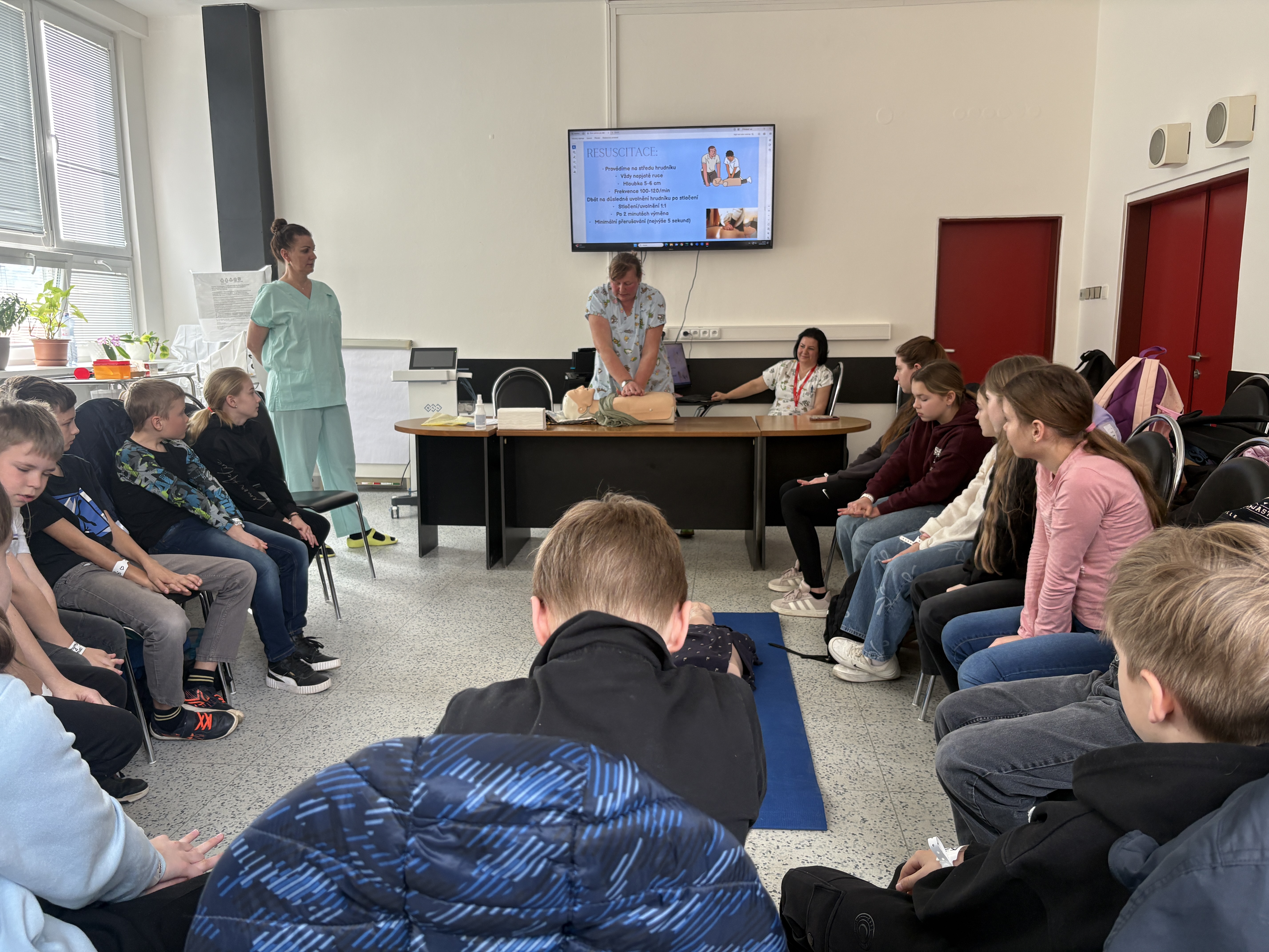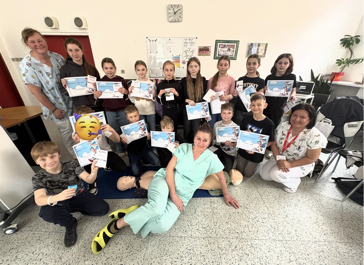 Hned u vchodu nás přivítala vrchní sestra a ta nás zavedla do celkem zajímavé místnosti. Byl to přednáškový sál. Tři sestřičky si pro nás připravily zajímavou prezentaci s poutavým povídáním o první pomoci. Nejenomže jsme se toho moc dozvěděli, ale hlavně jsme si mohli všechno prakticky vyzkoušet. Resuscitaci jsme prováděli na dvou figurínách. Jeden z nás měl odvahu si nechat natočit EKG. Téměř všichni jsme si nechali z kapky krve změřit hladinu cukru a orientačně určit krevní skupinu. Poté jsme se šli podívat na oddělení větších dětí a na jednotku intenzivní péče. Sestřičky nám ukázaly, co všechno se děje na vyšetřovně při příjmu k hospitalizaci. Říkaly, že jsme moc hodní a aktivní, a tak jsme obdrželi diplomy a malou odměnu.