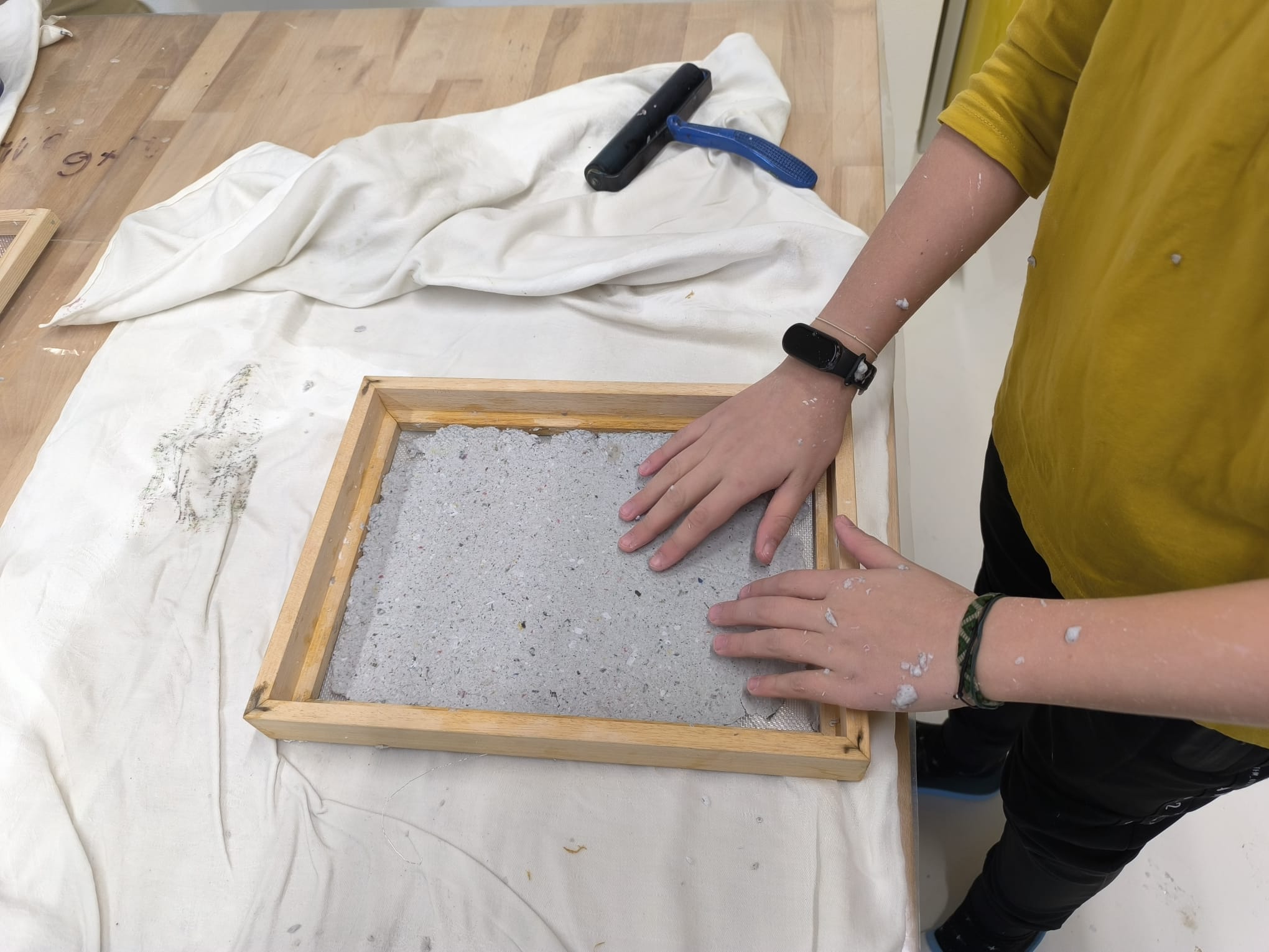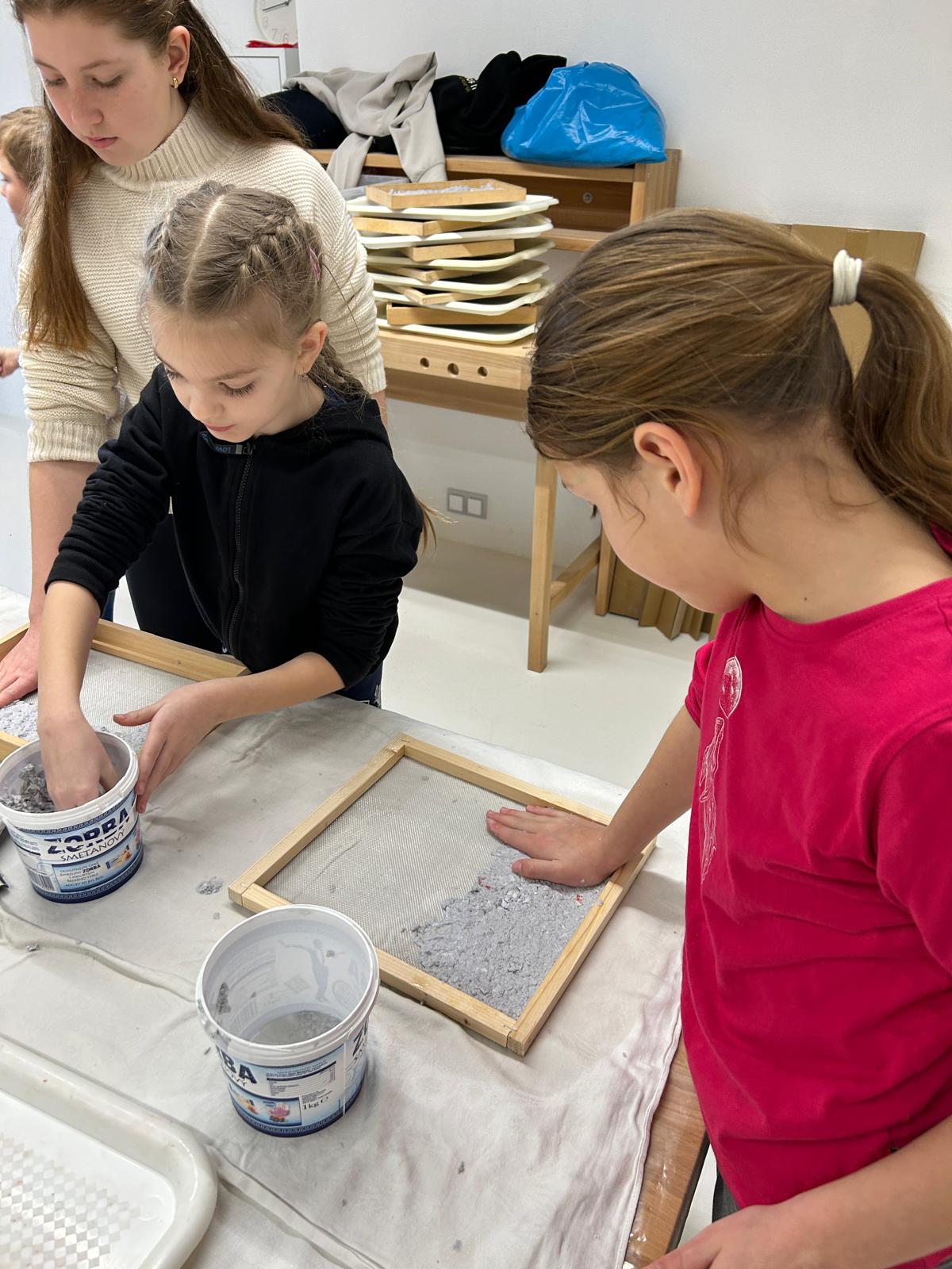 První pololetí školního roku jsme zakončili recyklací starého papíru. Nejdříve jsme ho natrhali na kousky, potom rozmočili ve vodě, pomocí mixéru z něj vytvořili kaši a tu nanášeli na síta upevněná v rámečcích. Po usušení vznikly nové, jedinečné kusy ručně vyrobených papírů. Už se těšíme, na jejich další využití.