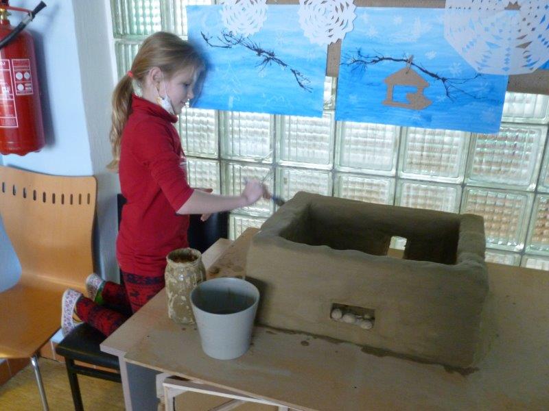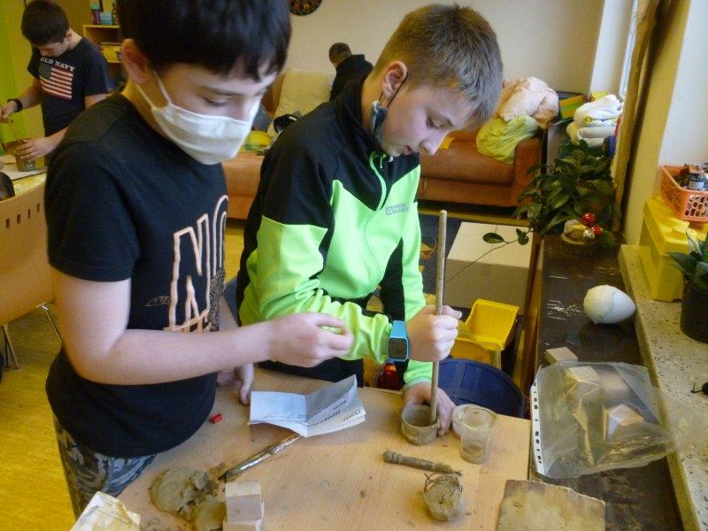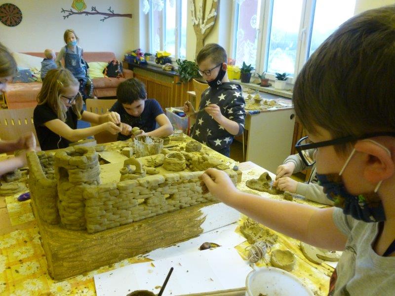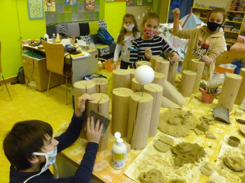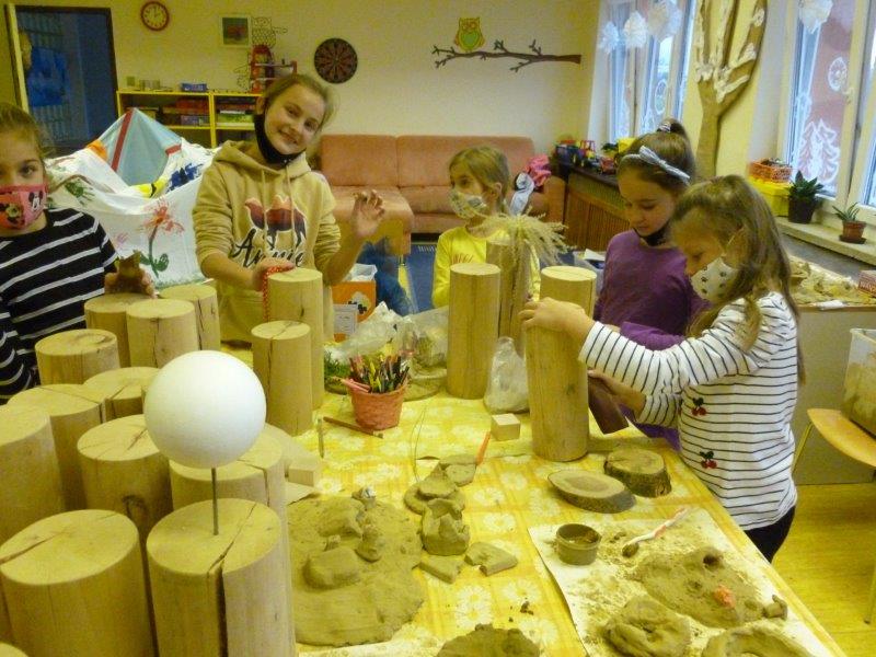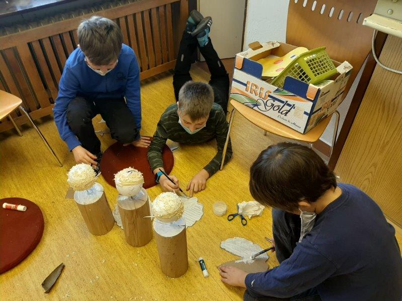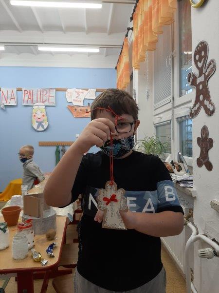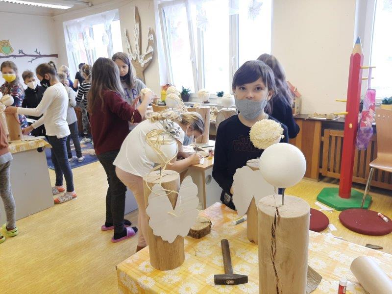 Také se nám velmi líbilo zdobení vánočního stromku. Naši „horňáci“ ( horní družinka) i letos připravili krásný hliněný Betlém. Také se pustili do výroby originálních andělů z dřevěných polínek.