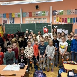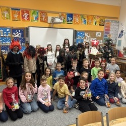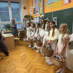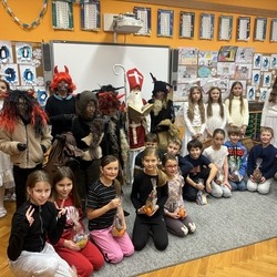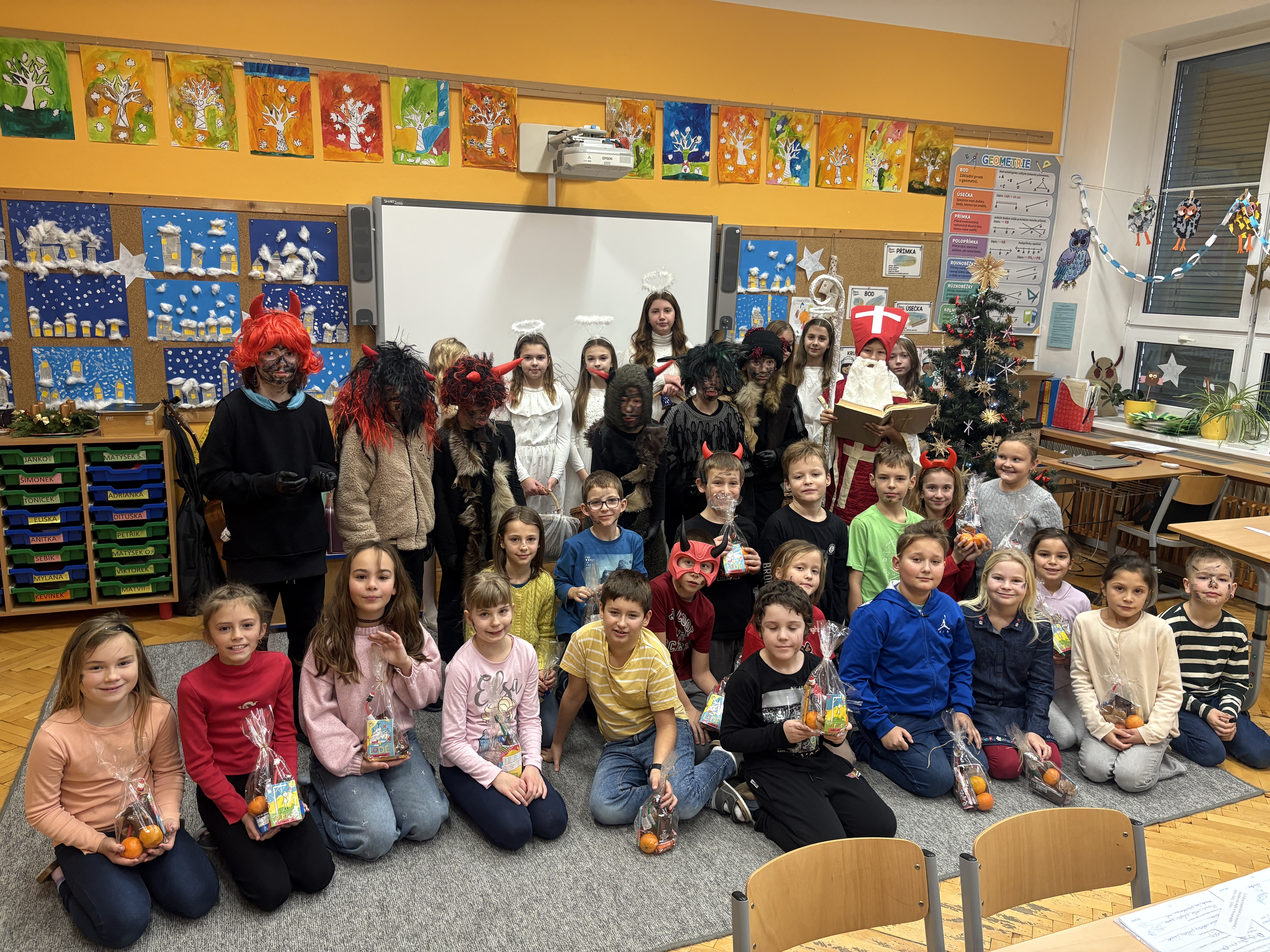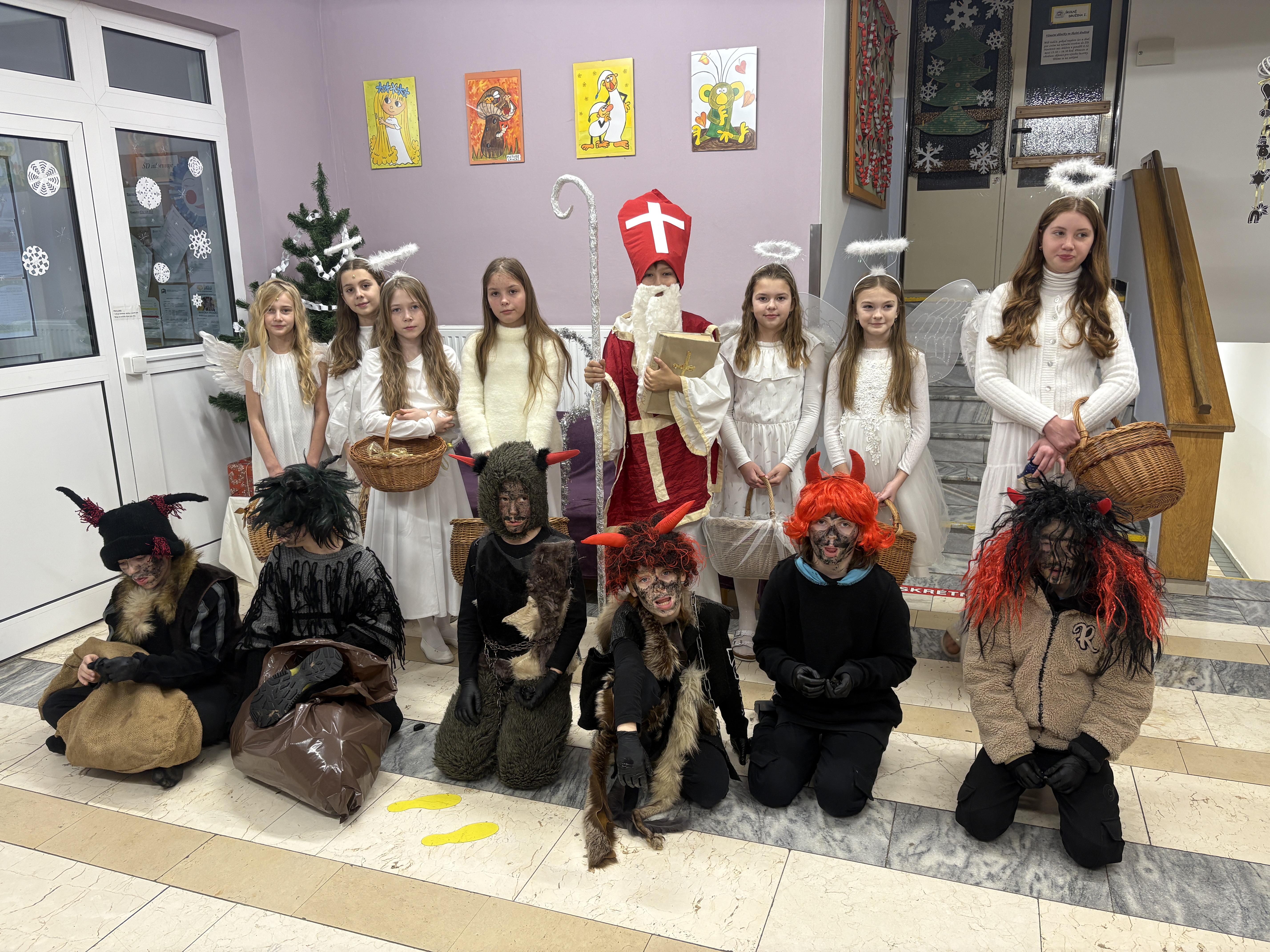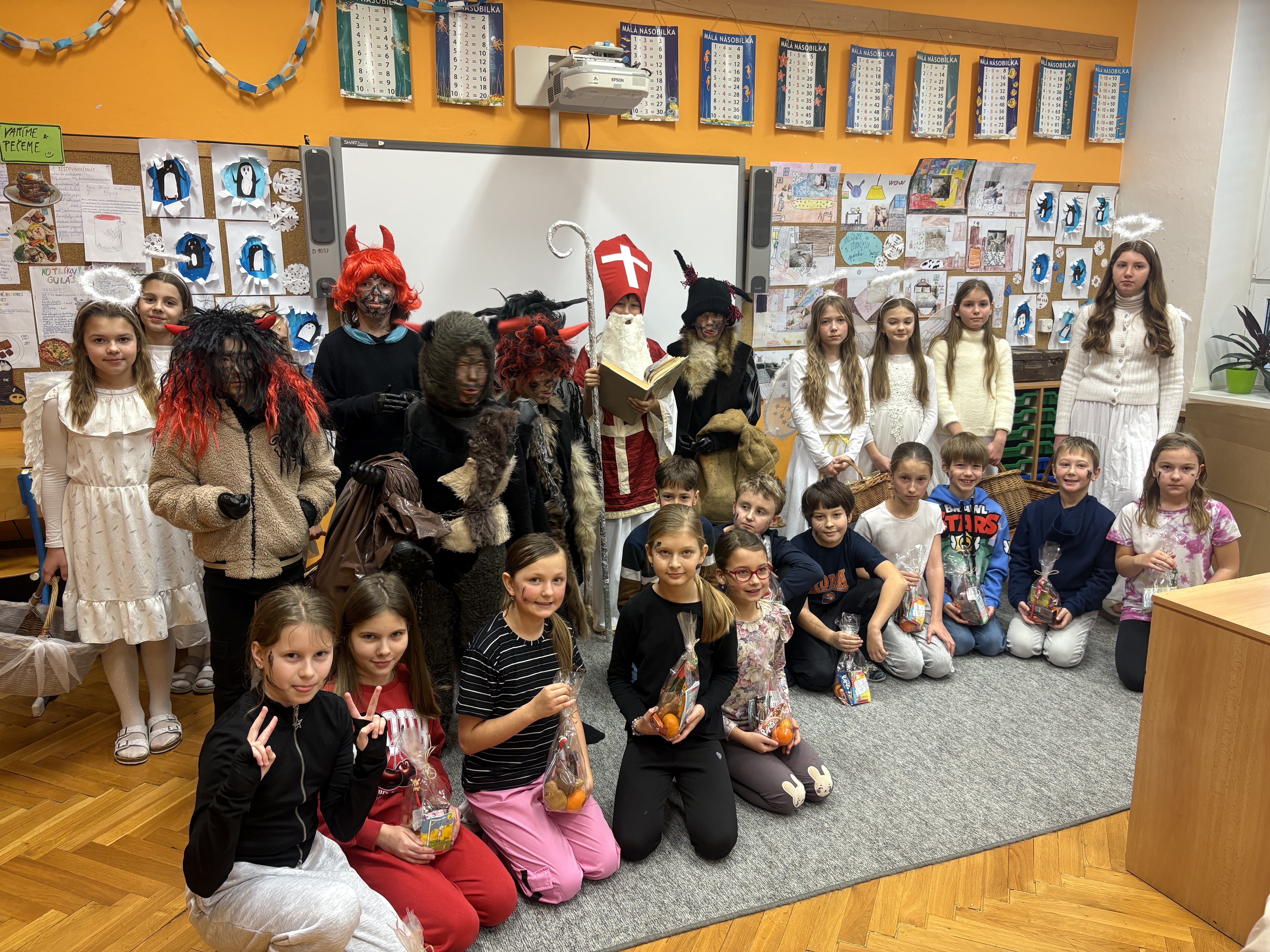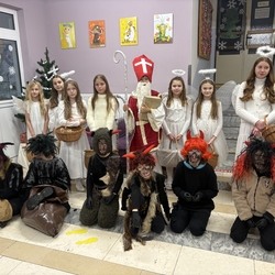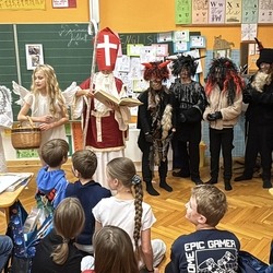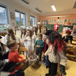 Čerti naše žáky pořádně pozlobili a postrašili. Kolik bylo hříšníků, tolik bylo i uhlíků ve třídách či v botách. Rozpustilé čerty museli odhánět andílci. Vše urovnal až Mikuláš svým klidným a přísným hlasem. Přečetl všechny "přešlapy" našich hříšníků z Knihy hříchů. Zlobivci slíbili polepšení a omluvili se hezkou písničkou. Mikuláš všechny moc pochválil. A tak nakonec sladkou nadílku dostali opravdu všichni.