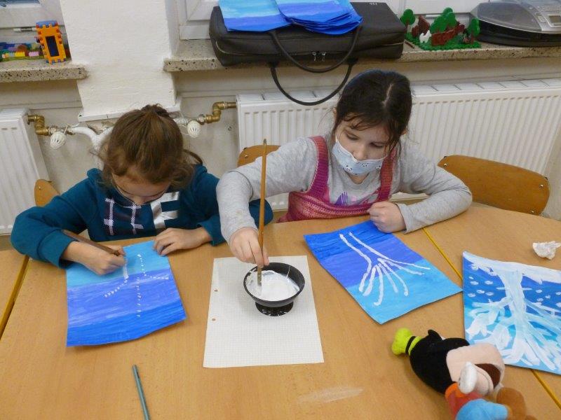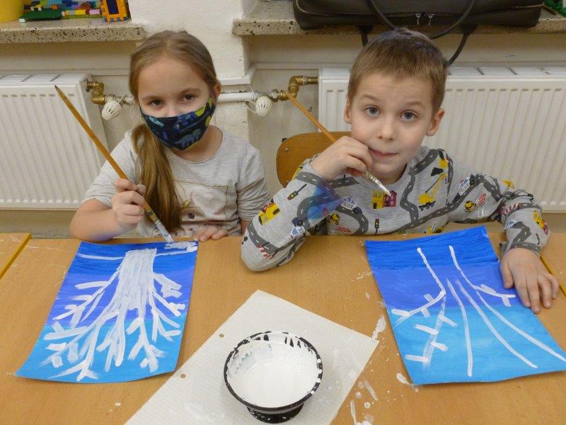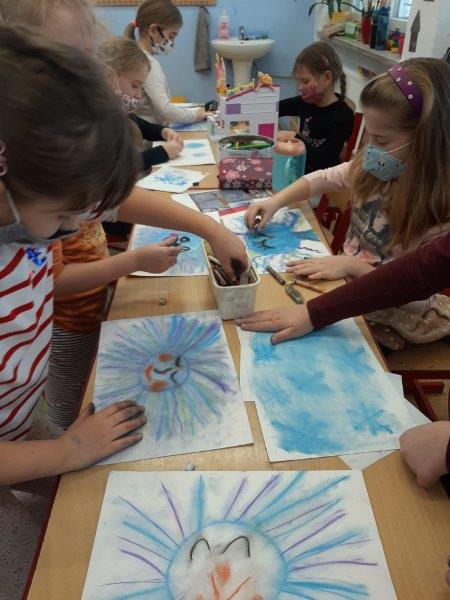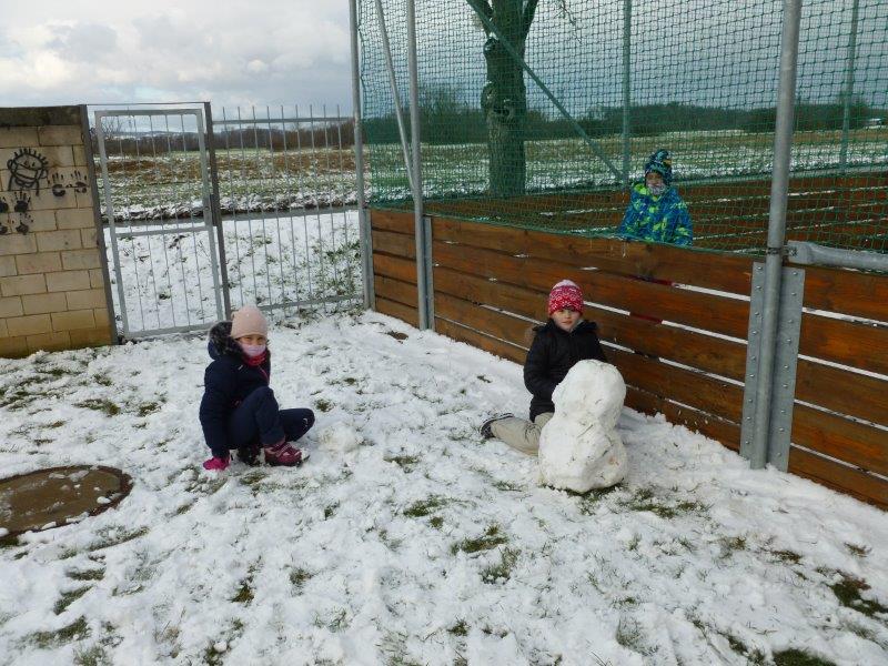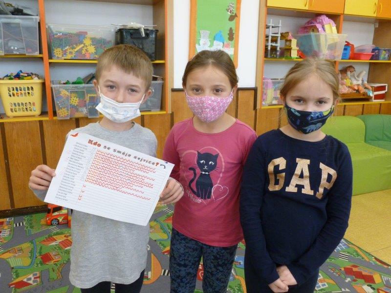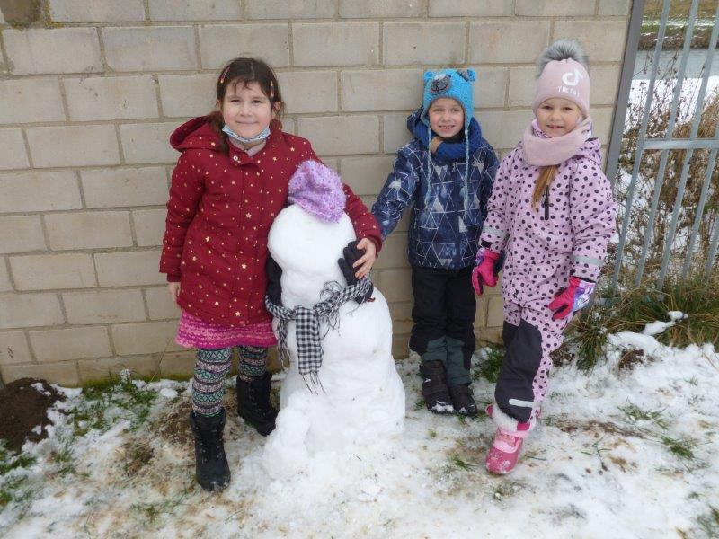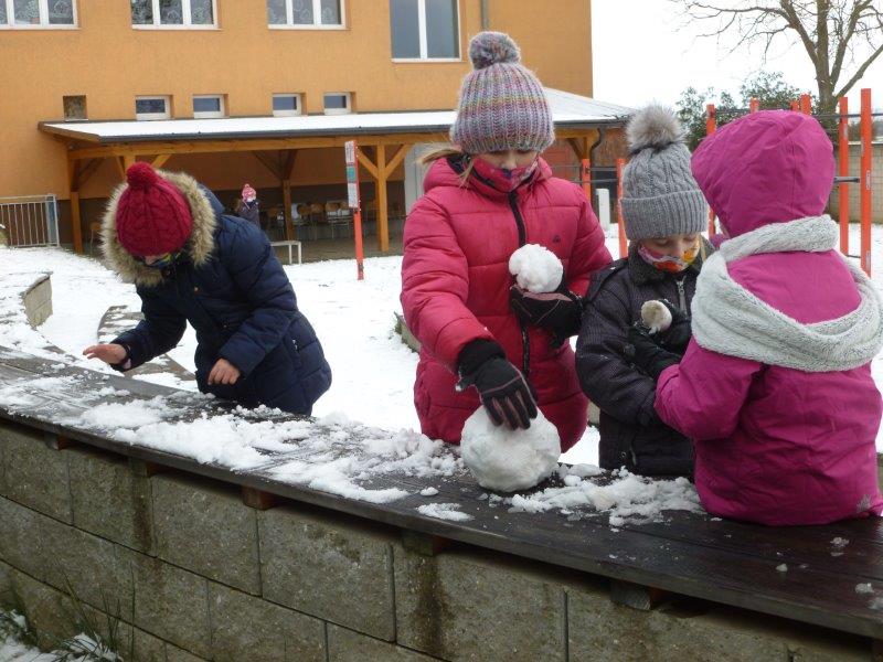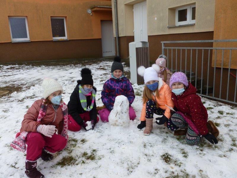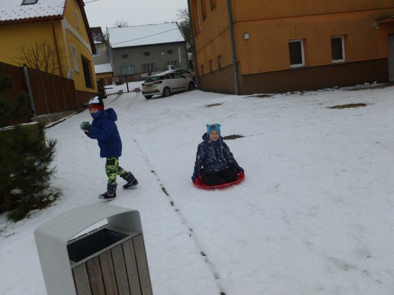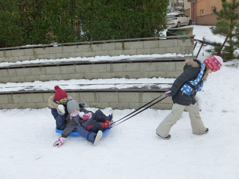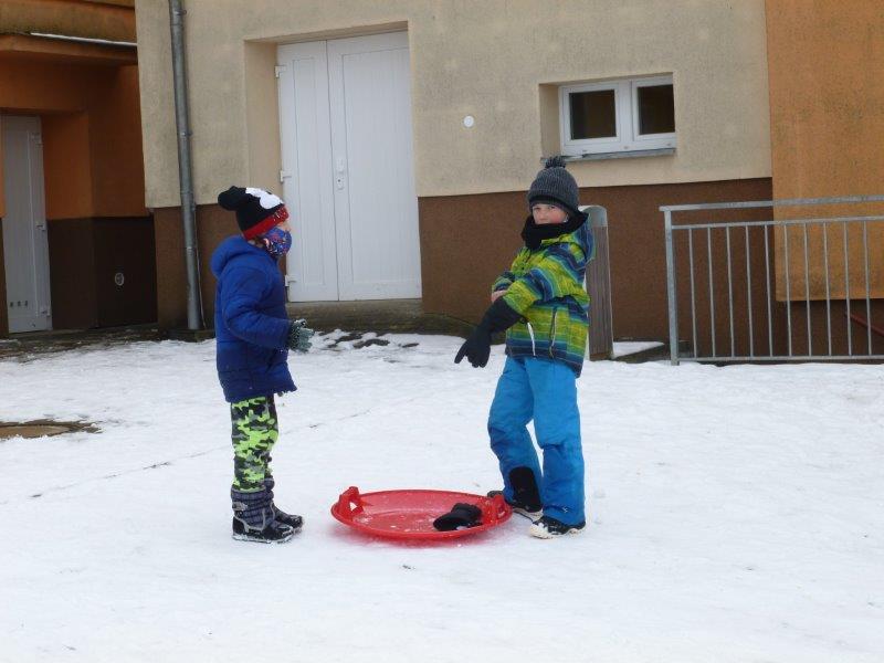Počasí bylo skutečně lednové, mohli jsme si užívat hry na sněhu. Ty mokré kalhoty byly od zimního fotbalu a bobování. Také jsme vytvořili spoustu pěkných výrobků. Zimní slunce malované křídou, brusle, zasněžený strom, čepice a rukavice nebo práce na hliněném hradu. Často jsme se chodili protáhnout a vyřádit do tělocvičny. Zde je spoustu materiálu i pro stavbu domečků. V našem improvizovaném divadle jsme si zahráli pohádku. Společně s pololetním vysvědčením jsme vyhodnotili a odměnili tři nejlepší v naší „úsměvové“ soutěži.