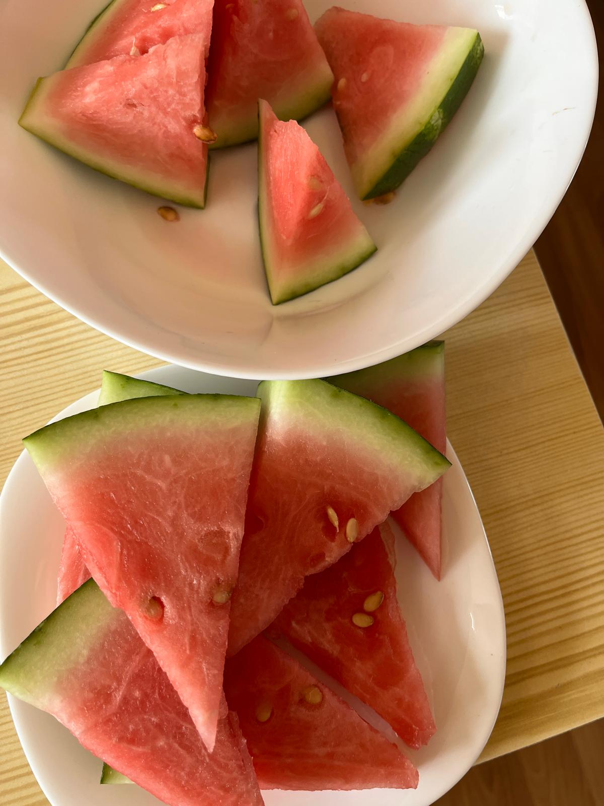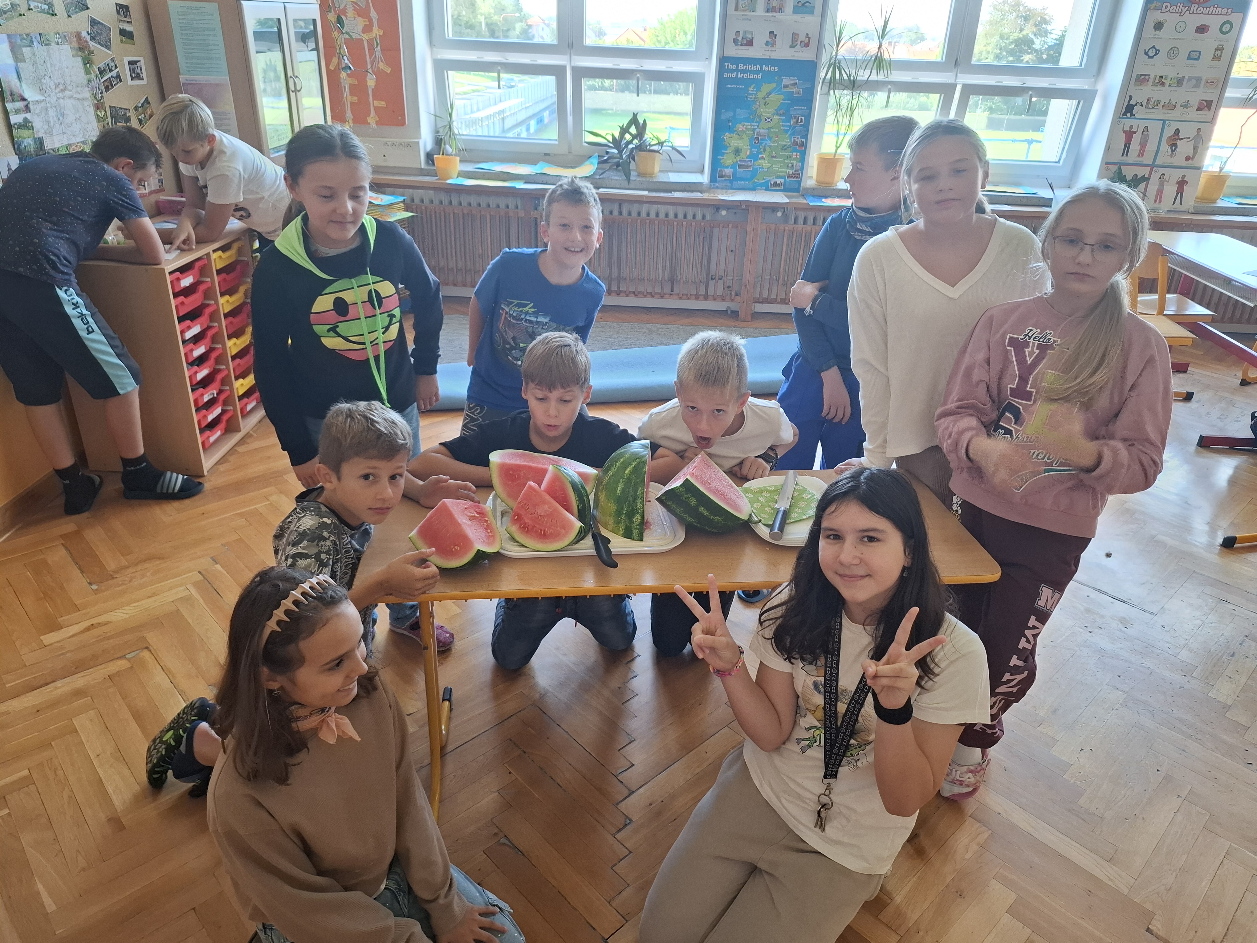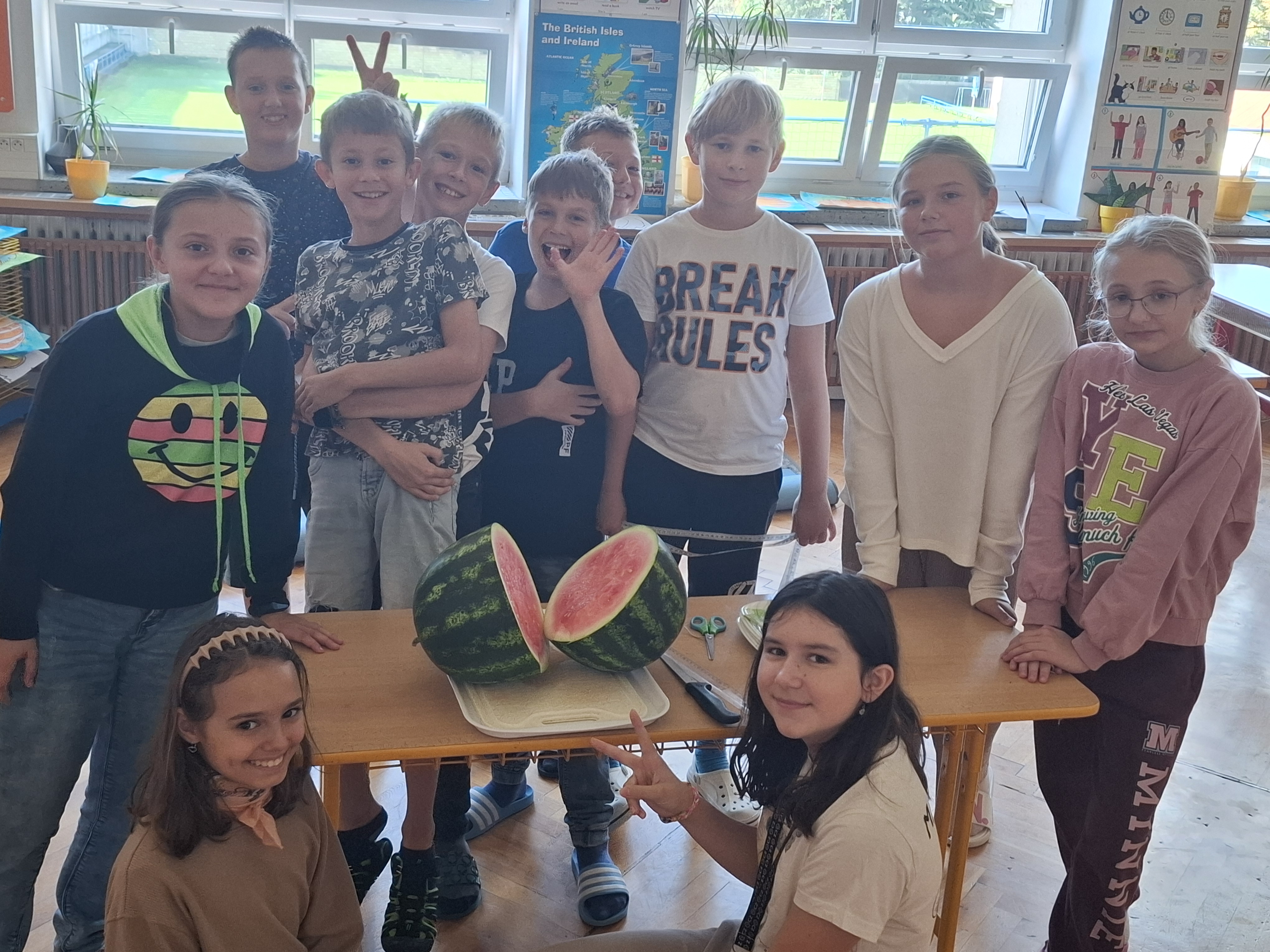 Poté jsme meloun umyli a začali ho porcovat. Po prvním řezu nám vznikly něco jako dvě polokoule s podstavou tvaru kruhu. Byla by škoda nevzít metr a neměřit. Zjistili jsme, že průměr kruhu je 24 cm a vypočítali i jeho poloměr. Při porcování jsme si zopakovali zlomky - poloviny, čtvrtiny, osminy, šestnáctiny... Nakrájeli jsme přibližně 100 dílků, každý vypadal jako trojúhelník. Každý žák školy tak mohl ochutnat zázrak, který nám vyrostl v našem dětském parku. Byl velice dobrý!