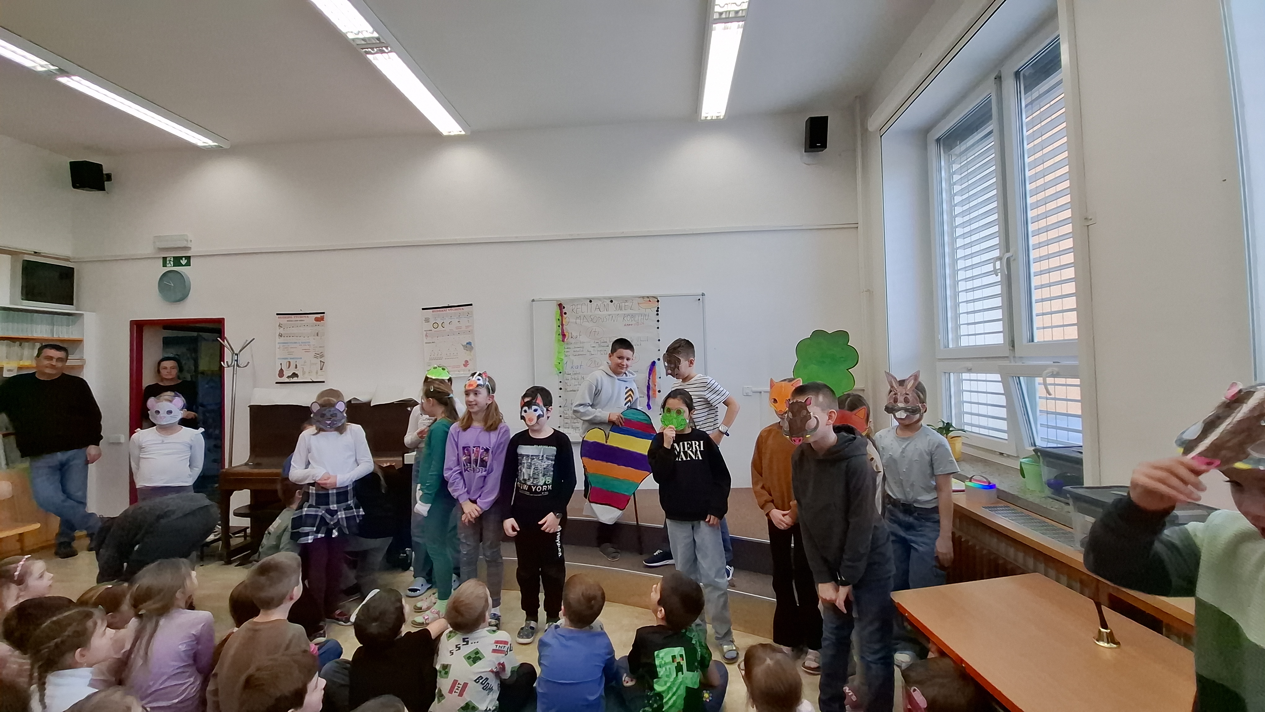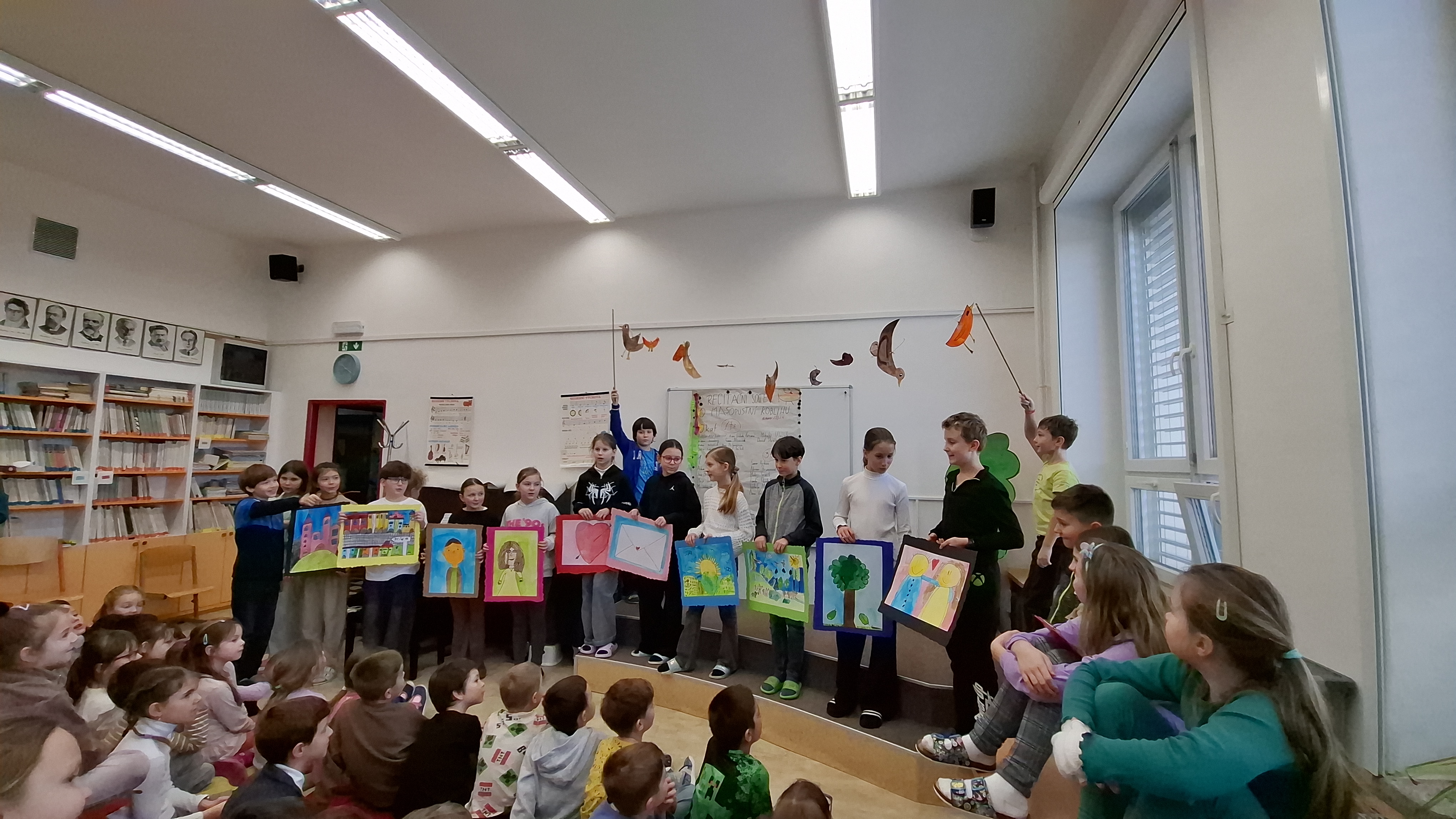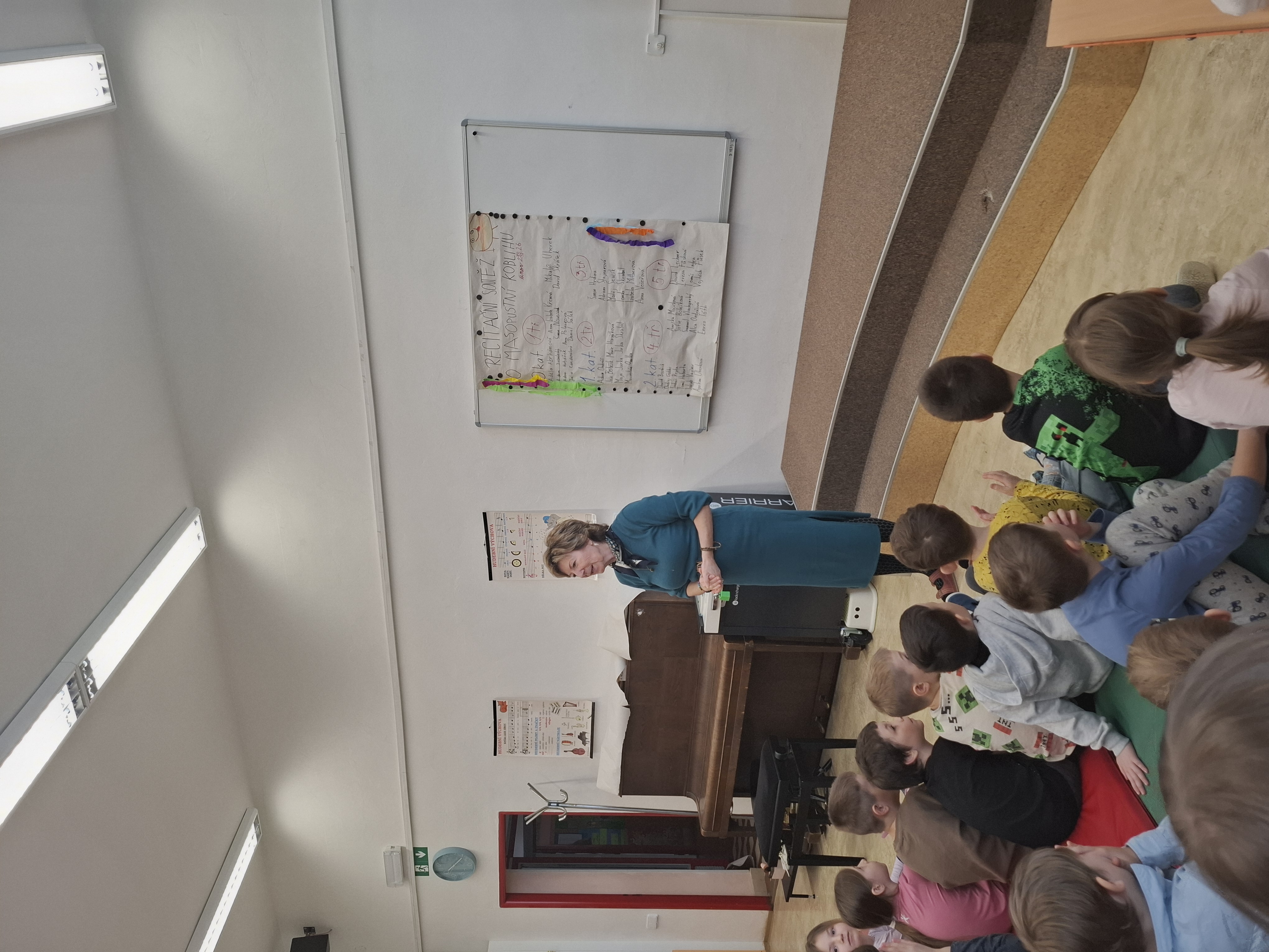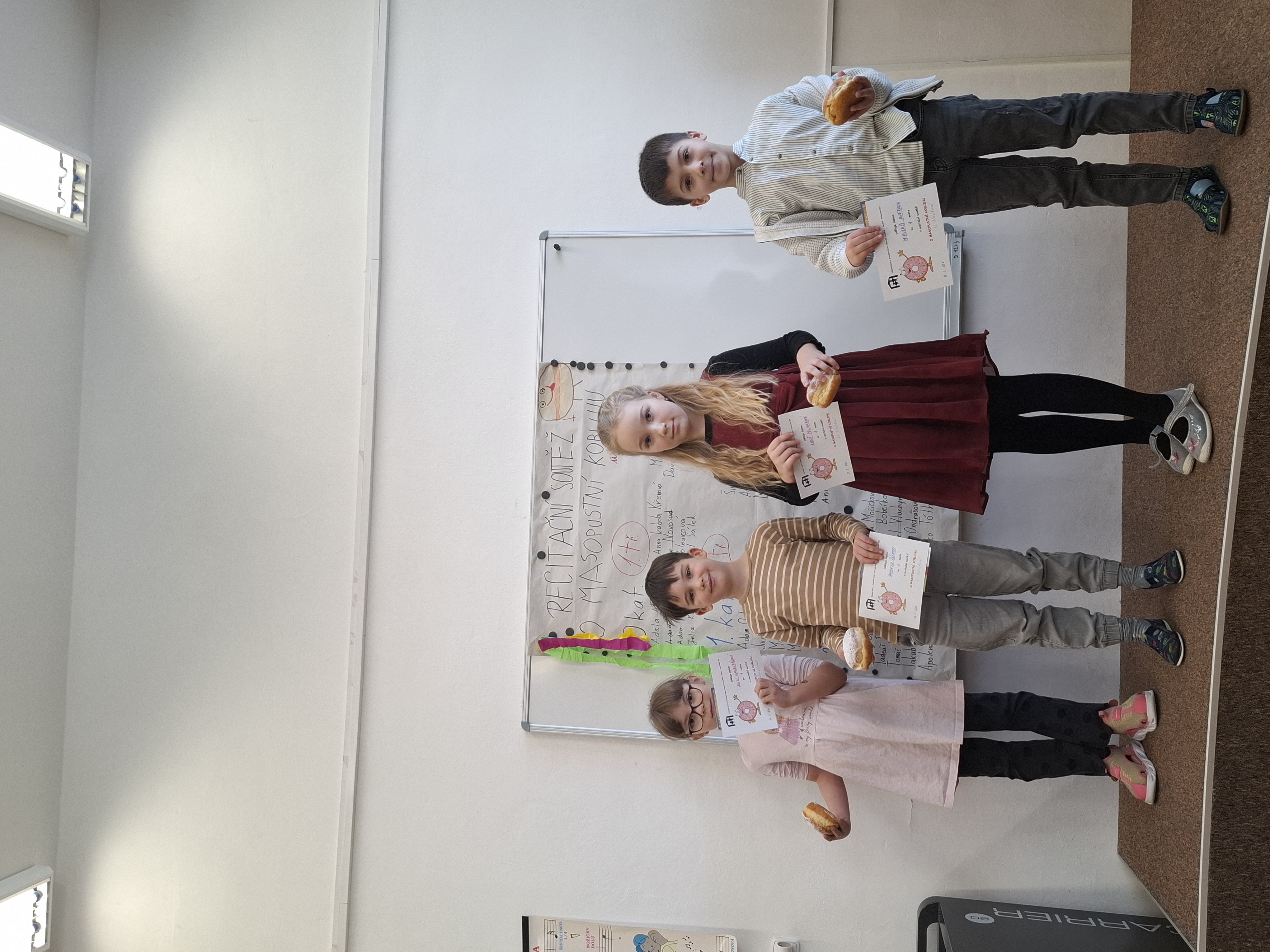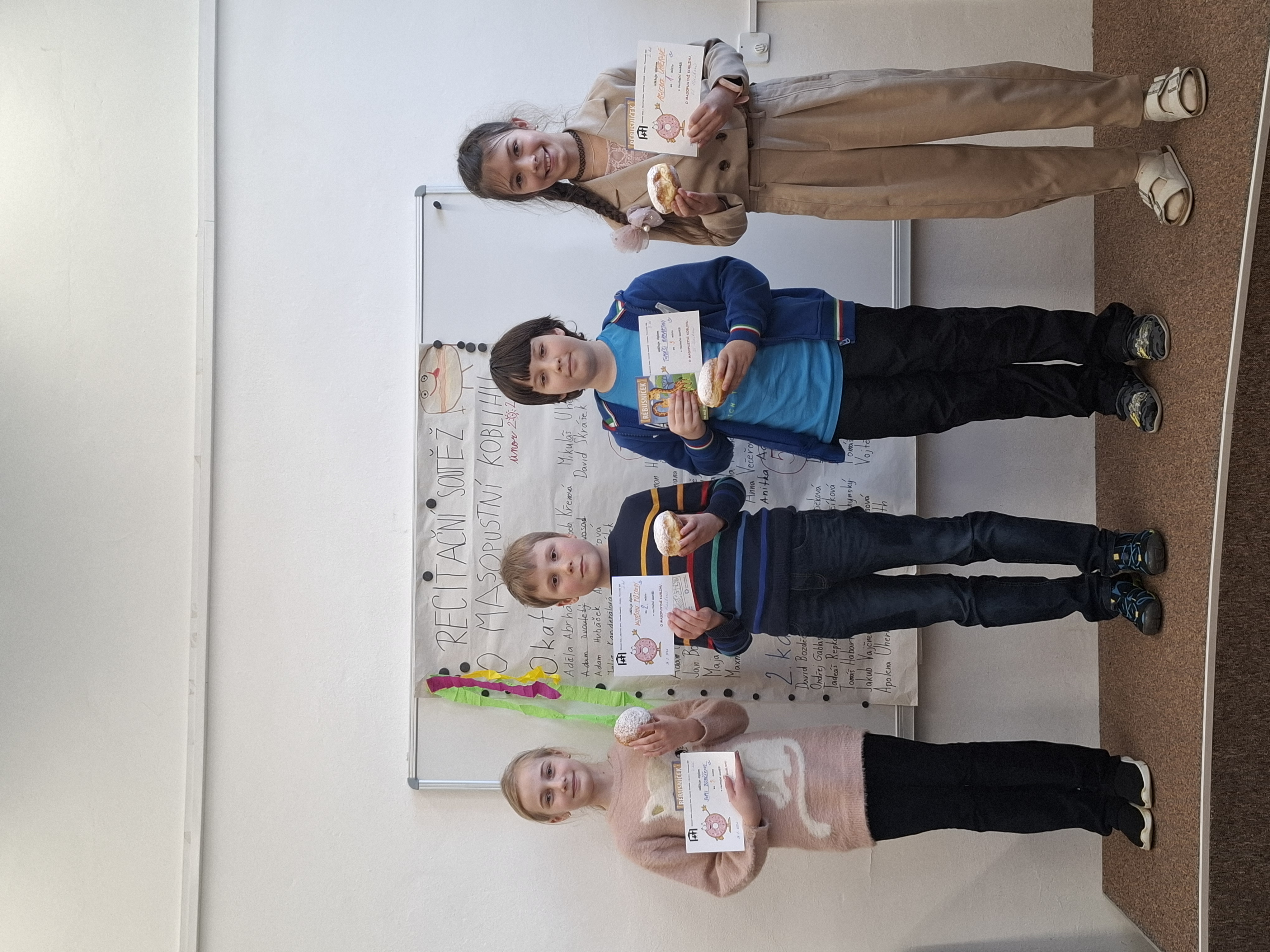 Paní učitelky po těžkém rozhodování vybraly nejlepší recitátory, kteří se dnes utkali ve 3 kategoriích. Těžce vybírala porota ty nejlepší. Stali se jimi v 0. kategorii Anička Polnarová a Mikuláš Uherek z 1. třídy, v 1. kategorii (2. a 3. třída) Anička Večeřová ze 3. třídy a ve 2. kategorii (4. a 5. třída) Apolenka Uherková ze 4. třídy. Anička Večeřová se zároveň stala se svým textem o fintivém císaři absolutní vítězkou celé školy. Soutěž doplnili čtvrťáci s krásnou výtvarnou písničkou, třeťáci obohatili přestávku dramatizací „O ztracené rukavičce“ a s p. ředitelem jsme si s chutí zazpívali u klavíru.