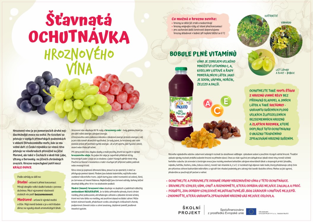 V týdnu 14 -18.11. obdrží žáci zdravé produkty ze školního projektu v podobě ovocné kapsičky Kubík, sýrových tyčinek, a také šťavnatou ochutnávku hroznového vína, s doplňkovým sortimentem.