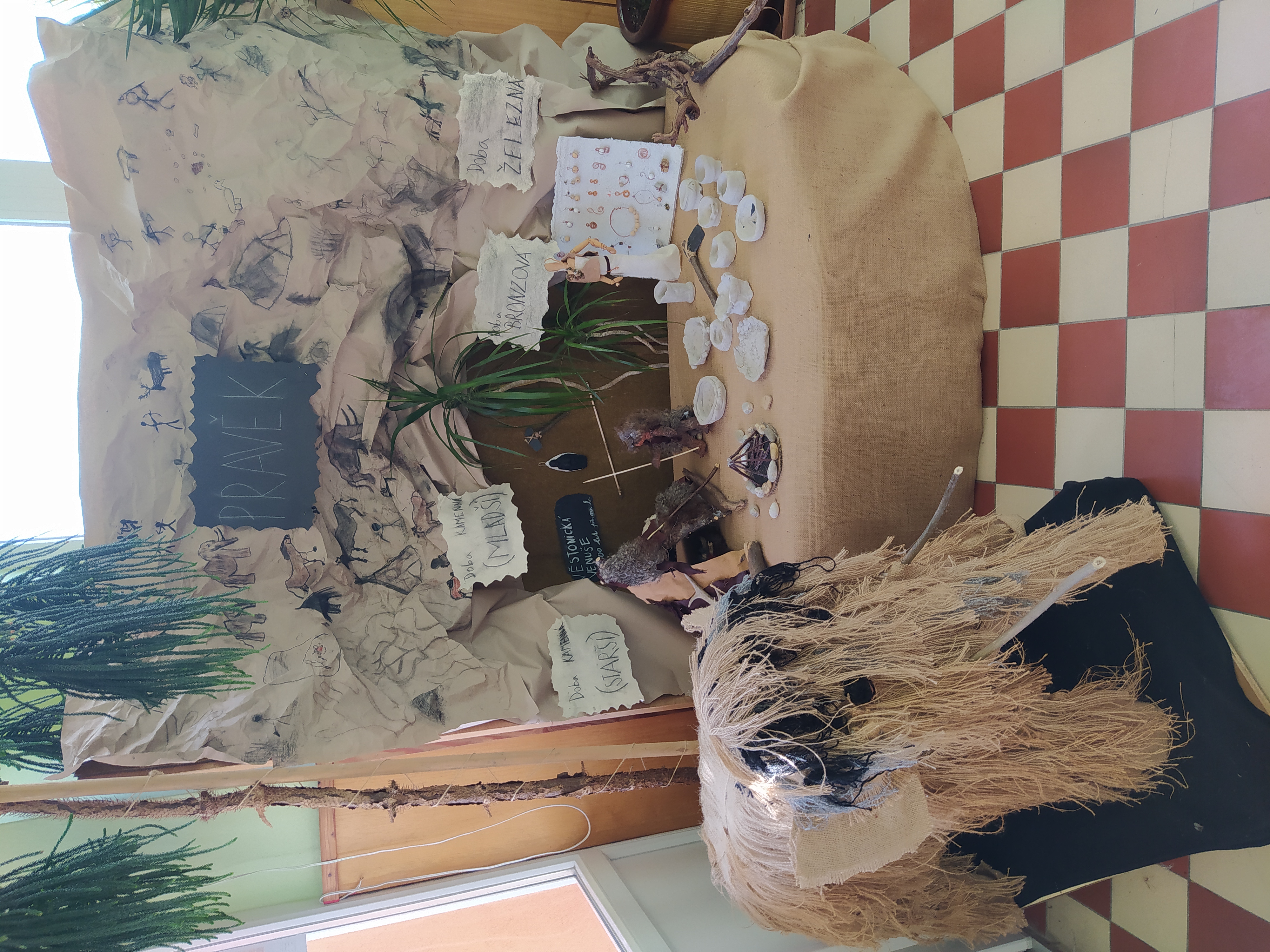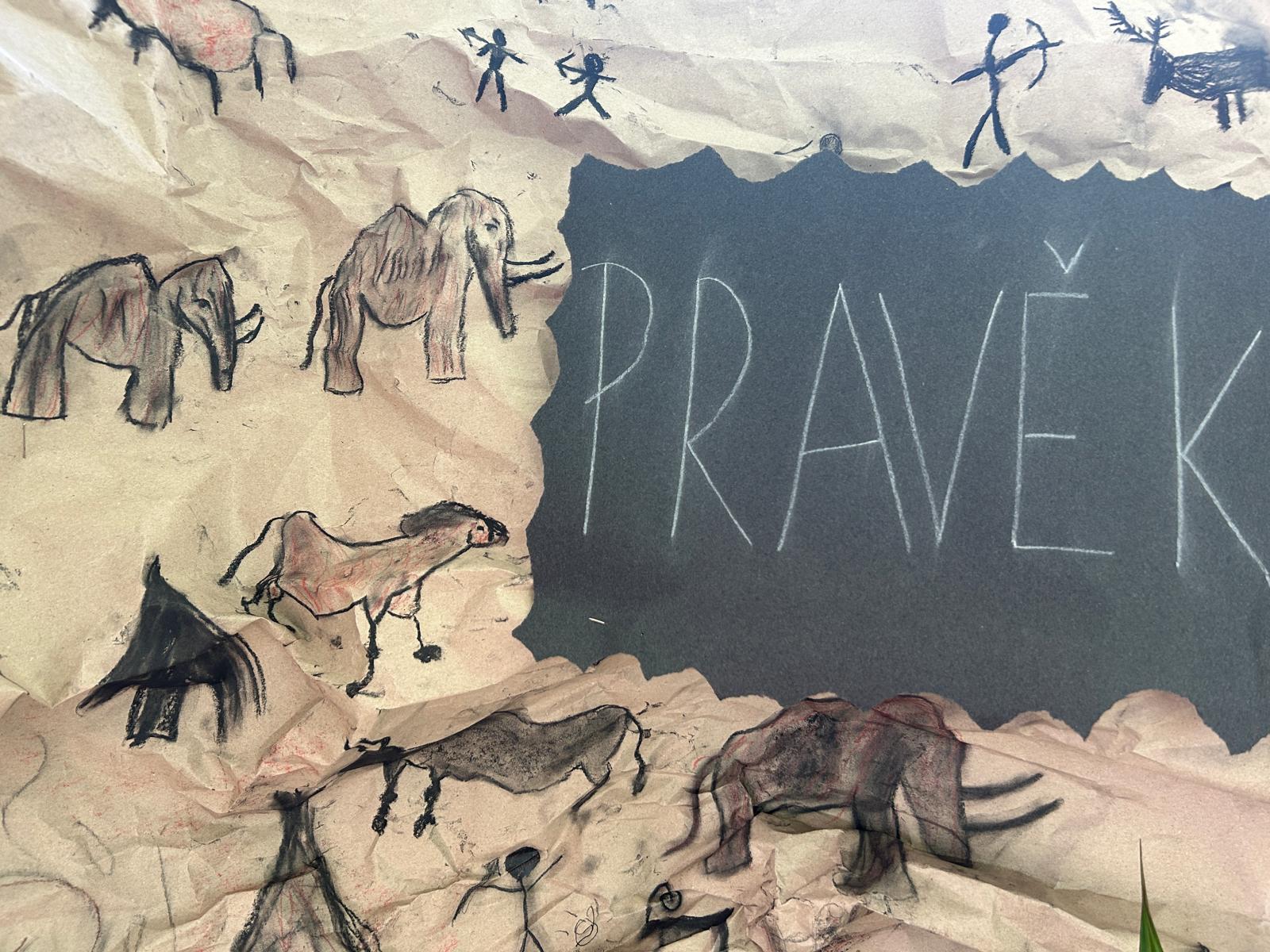 Ve škole je koutek na téma pravěk. Můžete tam zahlédnout vyrobeného mamuta a taky Věstonickou venuši, kterou jsme vyrobili ze sádry. Je tam i jeskyně s pravěkým lovcem. Ještě můžete vidět hliněné misky, jeskynní malby, malou sekeru nebo ženu v modernějším oblečení a různé šperky.