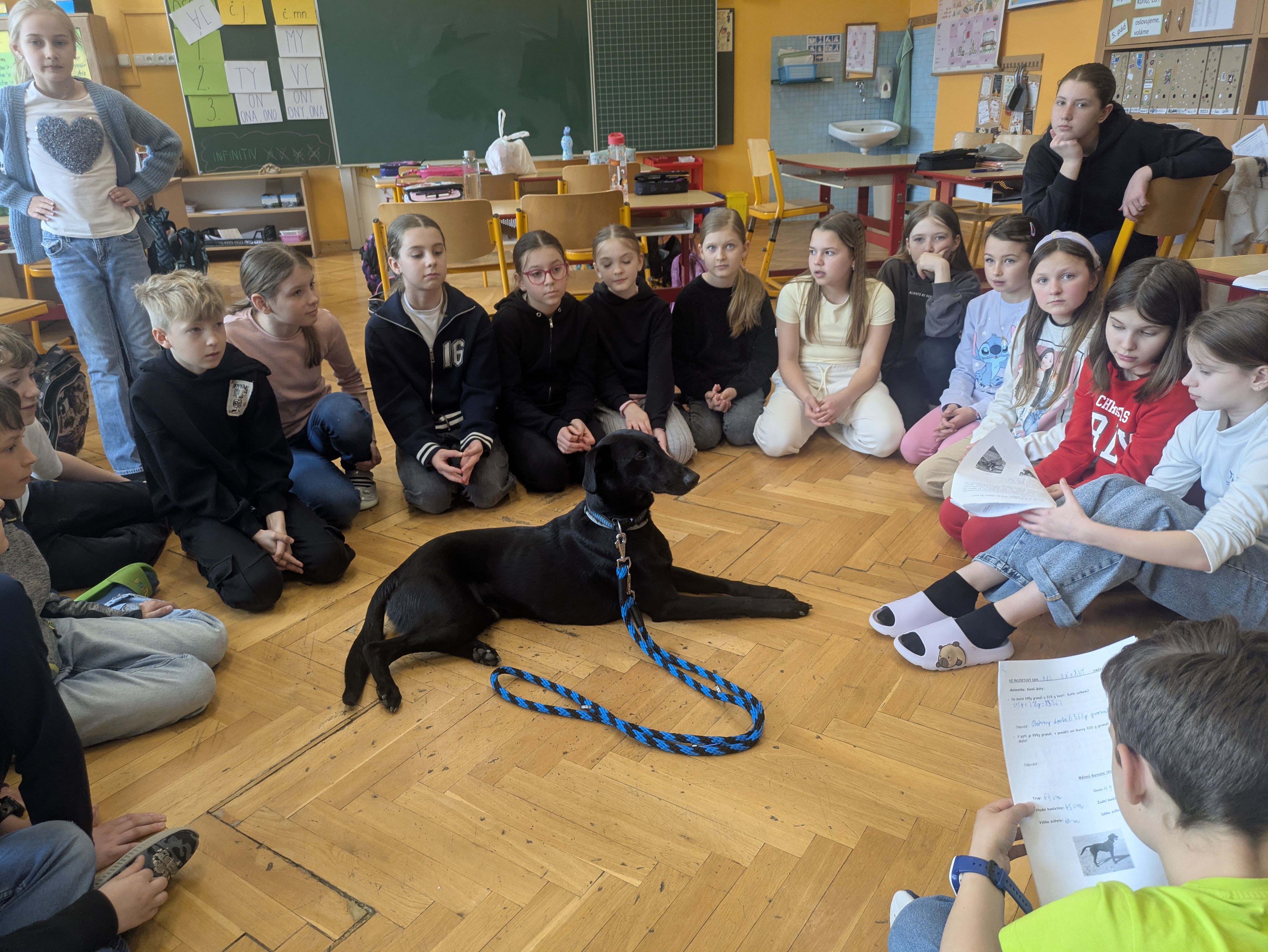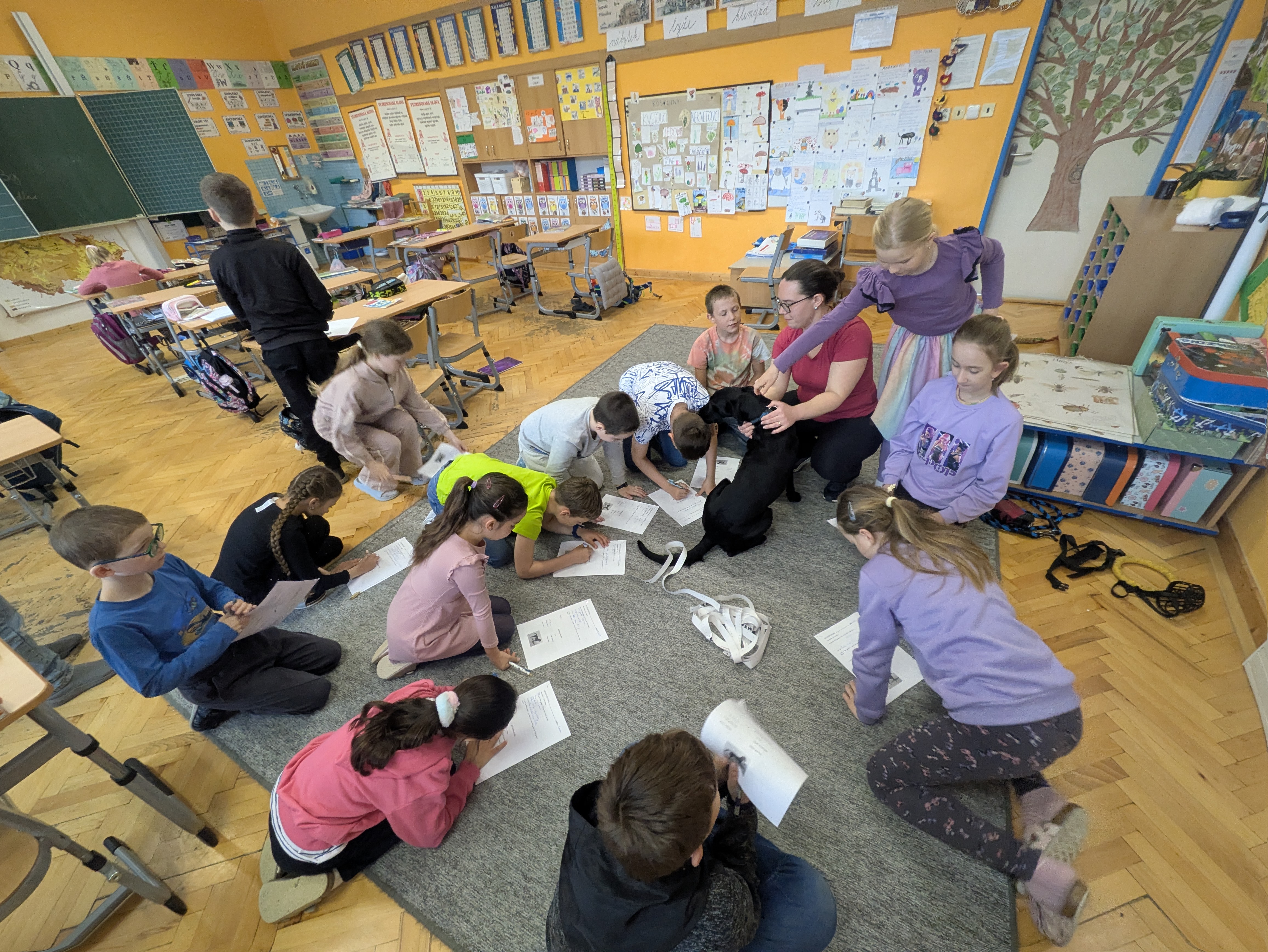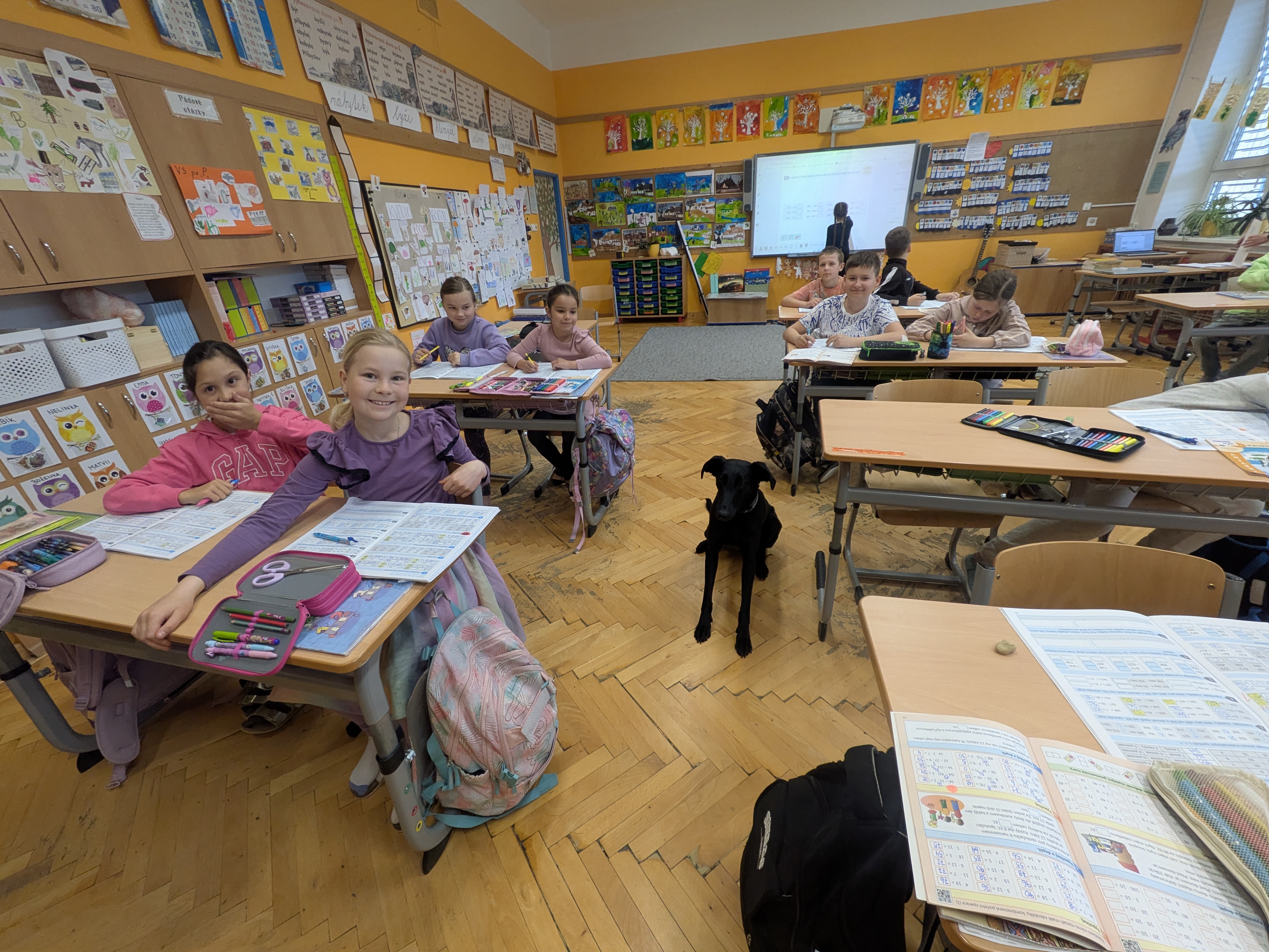 Dne 15. 4. 2026 proběhl ve třetí třídě projektový den s pejskem paní asistentky Veroniky Waidingerové – Barnym. Děti byly velmi zvídavé, nenechaly se dalším "žákem ve třídě" rozptylovat :-)