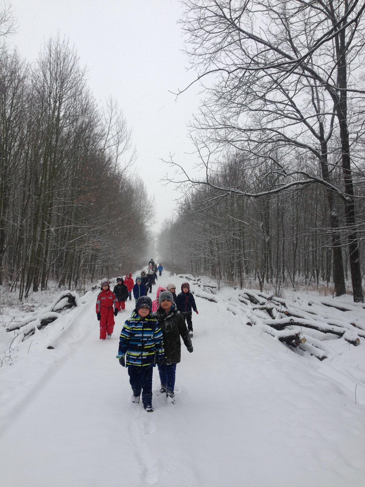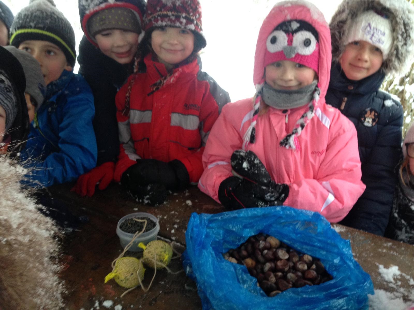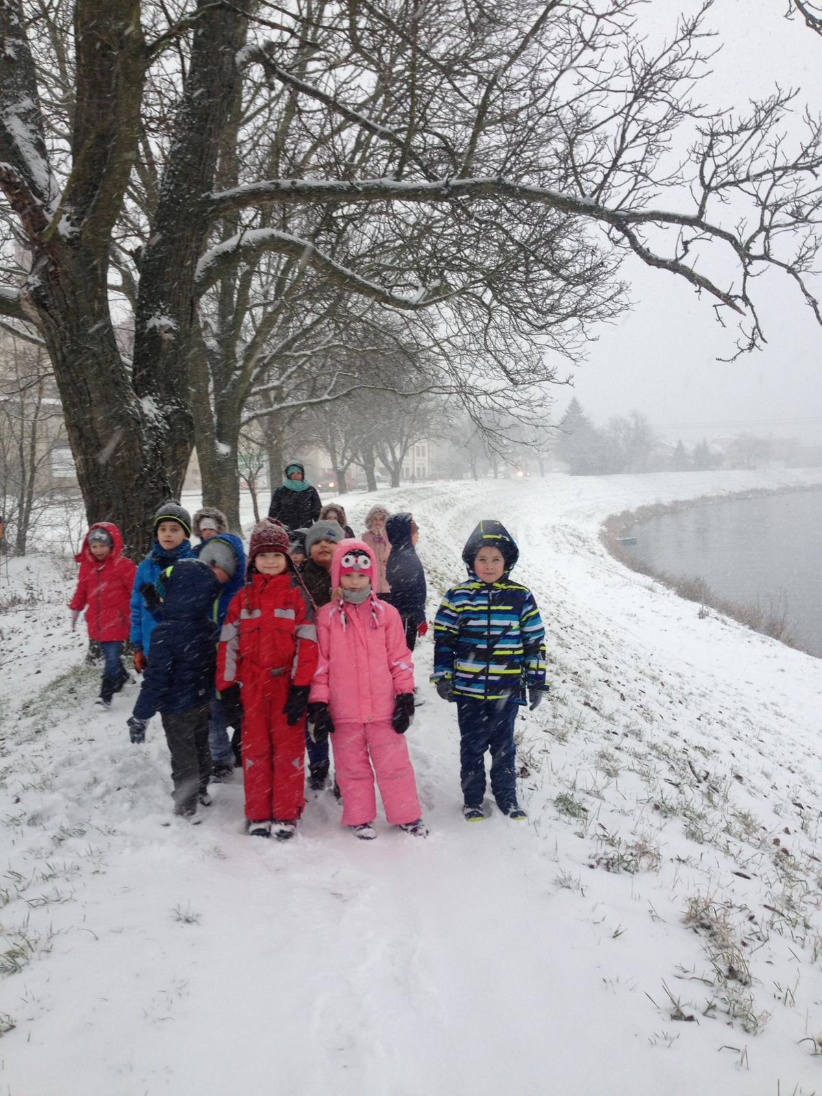 Pravou zimní "ladovskou" výpravu zažili naši prváčci. Na podzim nasbírali kaštany a ořechy, vyrobili baštu pro ptáčky a všechno si vzali s sebou do sněhem zasypaného kněžpolského lesa, kde krmení pro zvířátka rozmístili. Cesta zpět v chumelenici byla náročnější, ale naši nejmenší ji zvládli a na závěr uspořádali i pořádnou koulovačku.