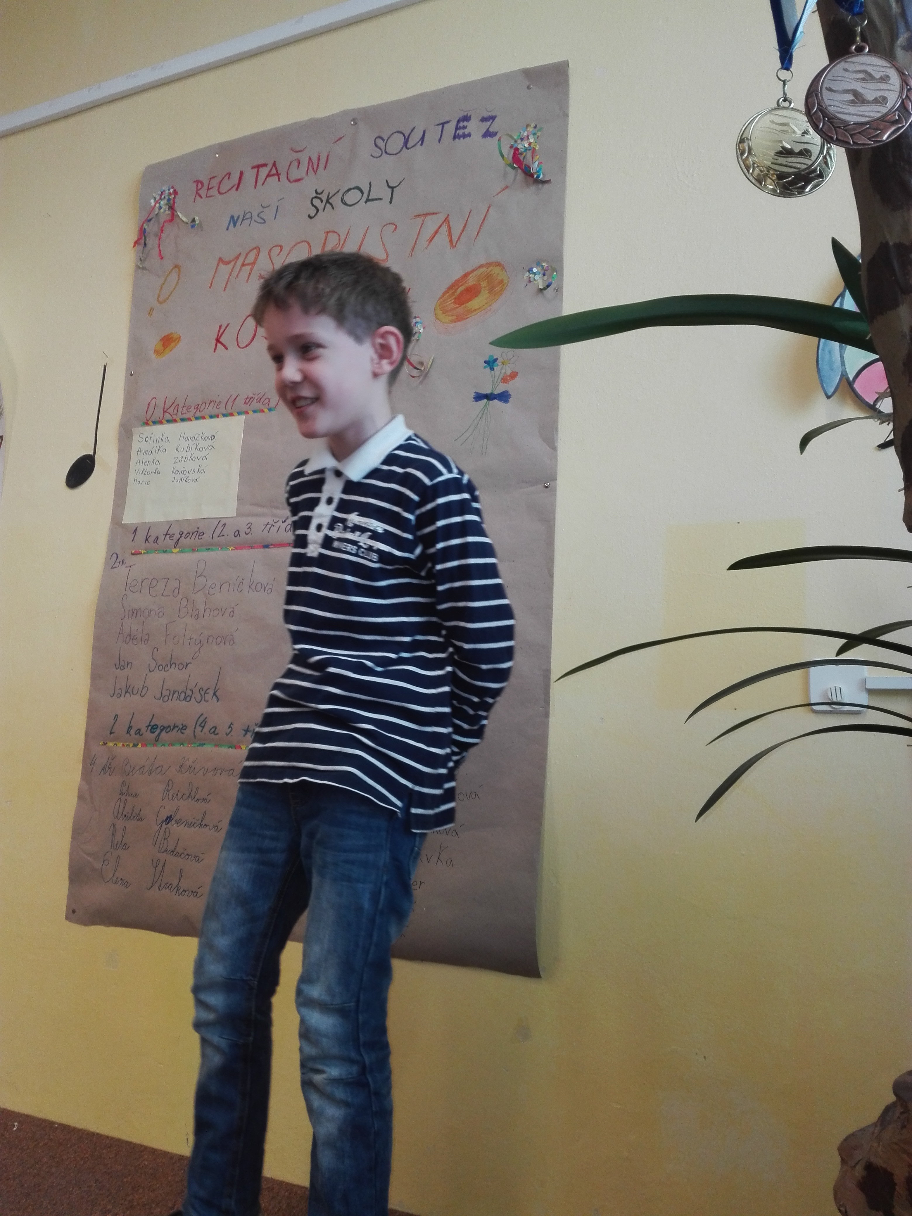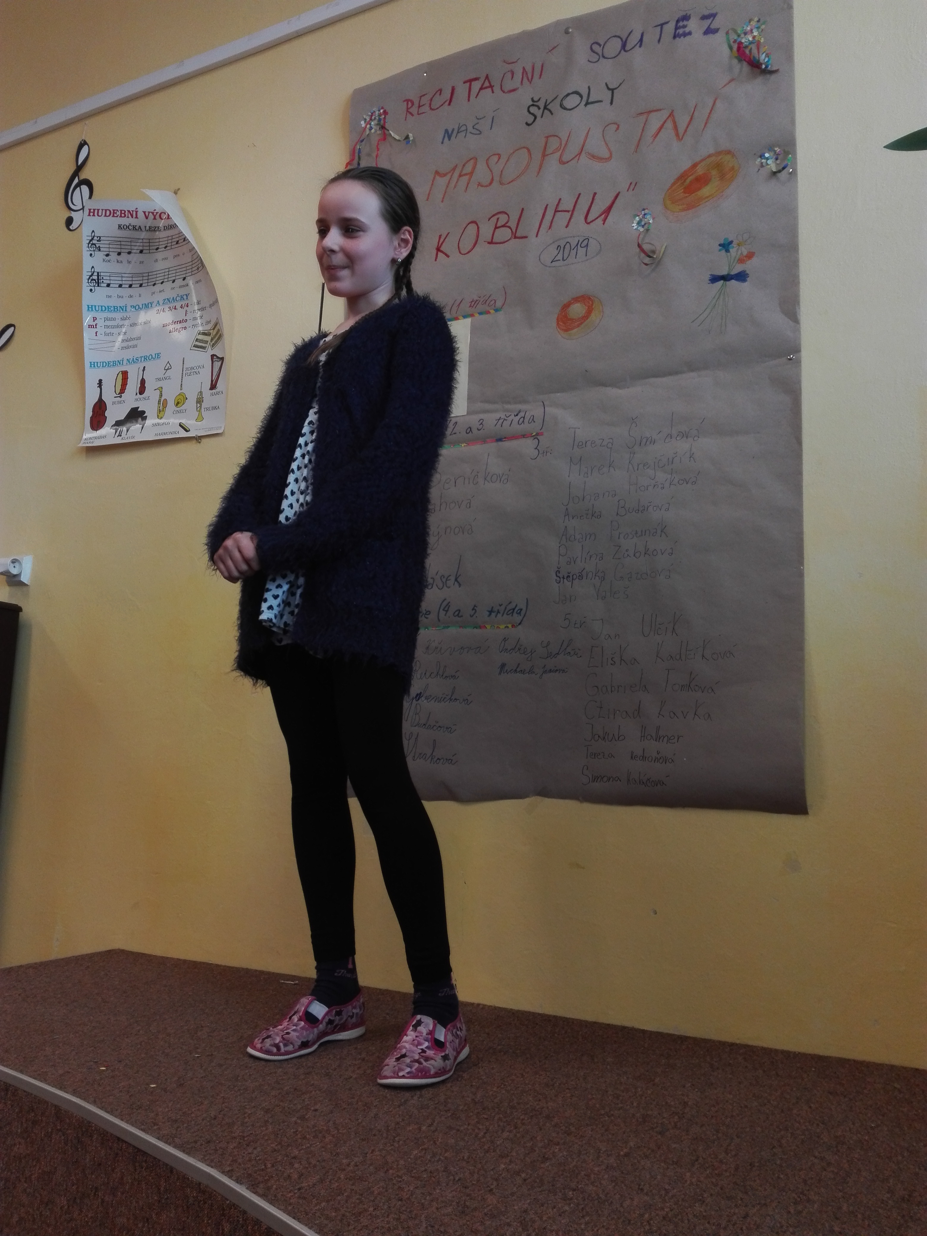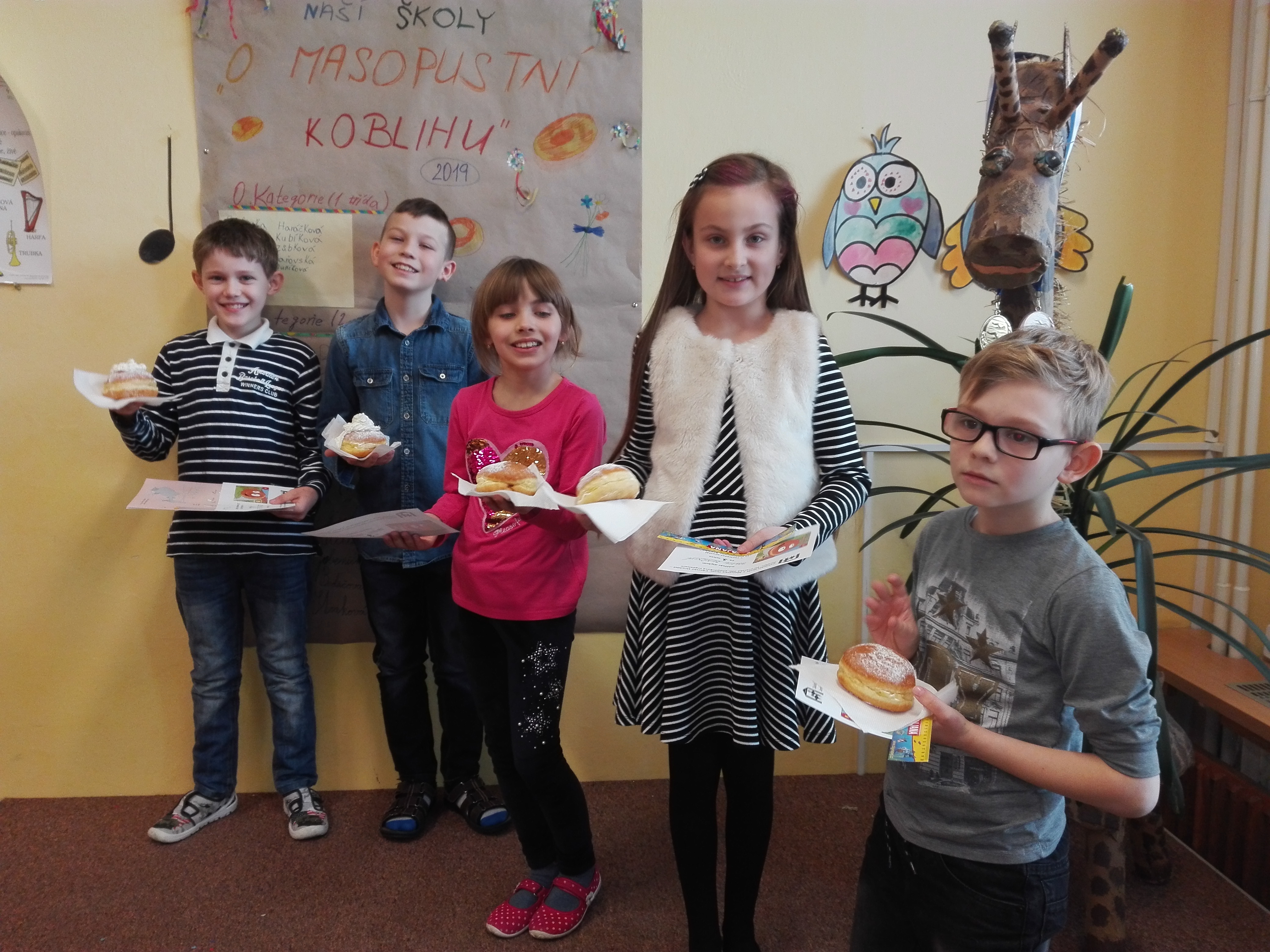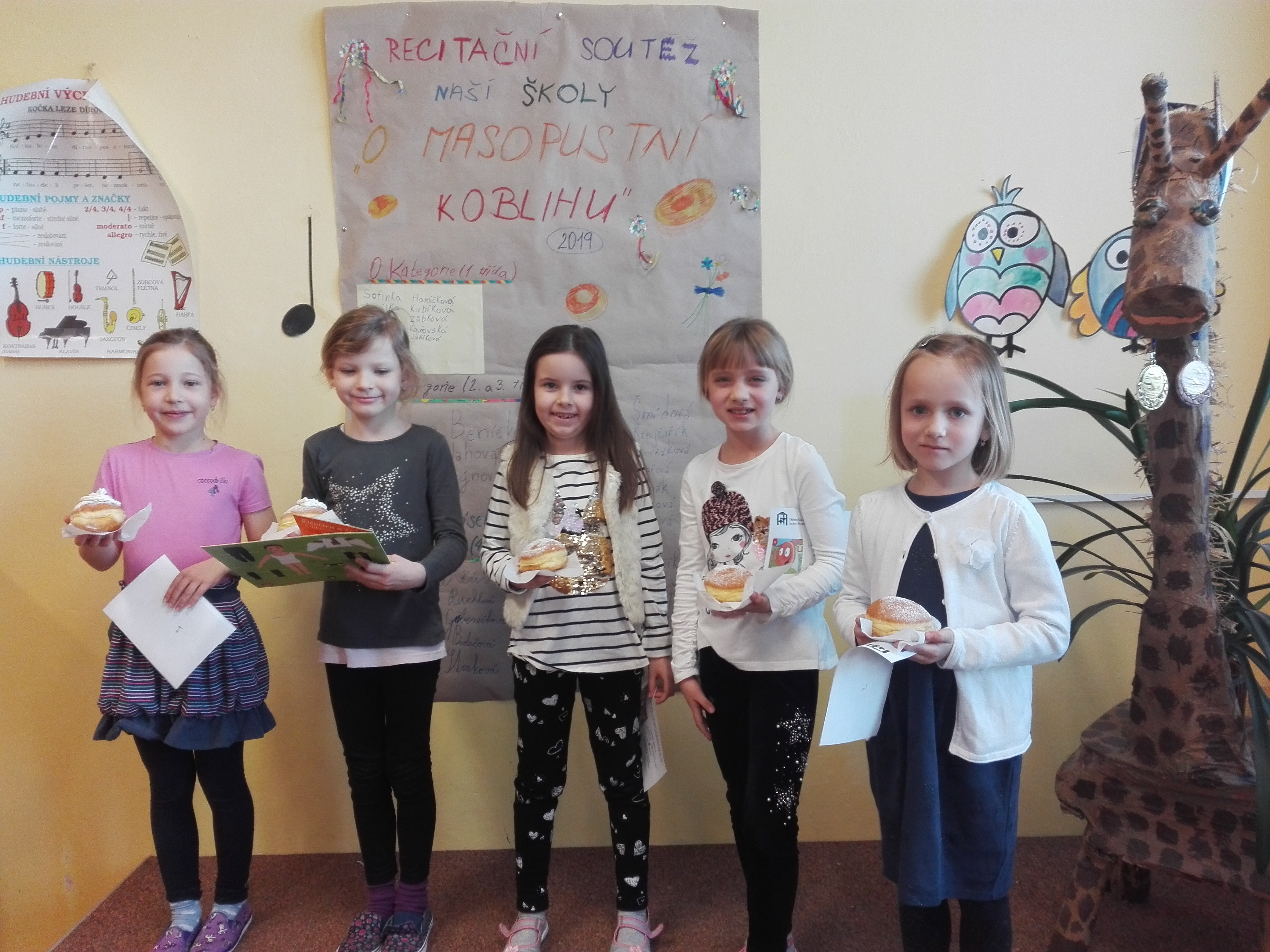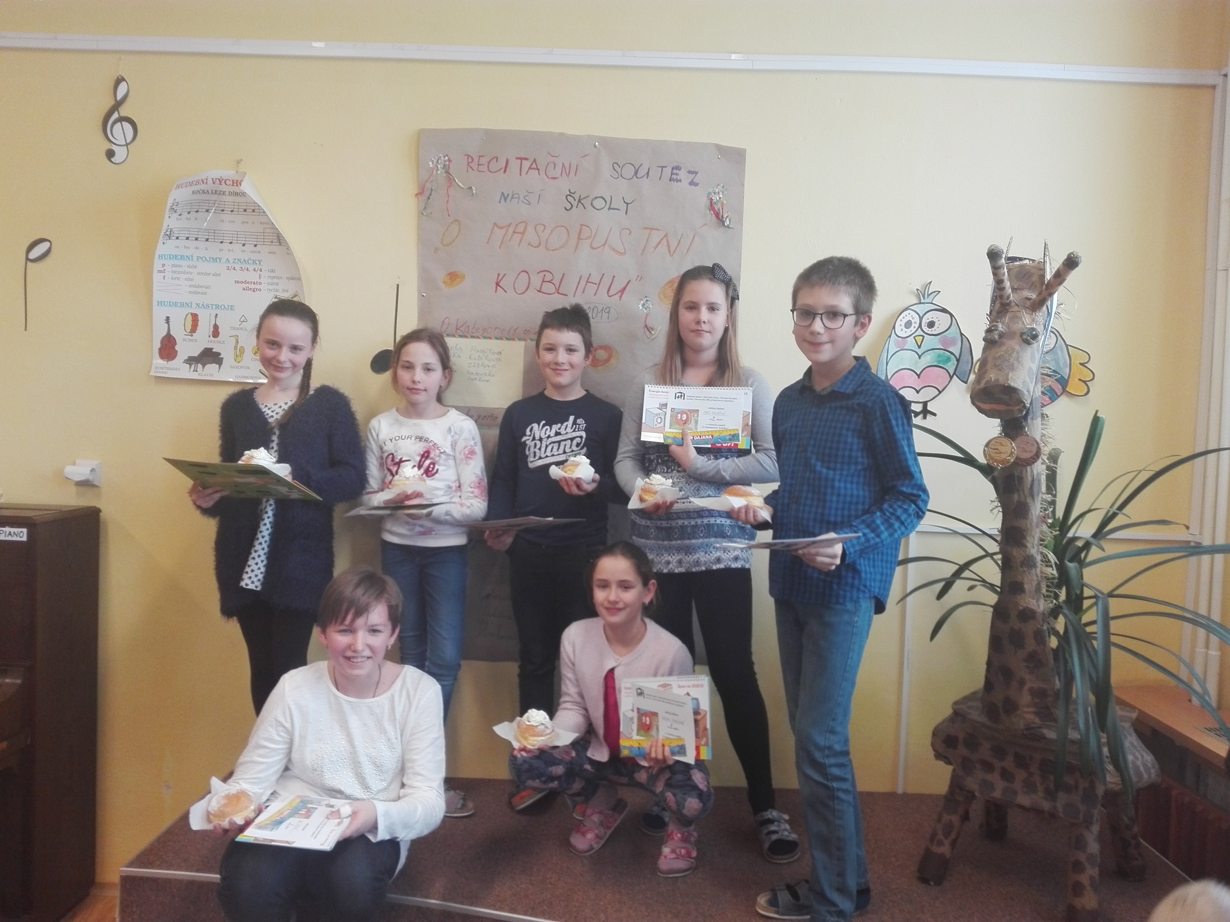 Tradiční recitační soutěže "O masopustní koblihu" se v pátek 15. března zúčastnilo 31 žáků. Soutěžilo se ve třech věkových kategoriích. Mnozí předvedli obdivuhodné výkony a vybrat nejlepší bylo opravdu tvrdým oříškem.