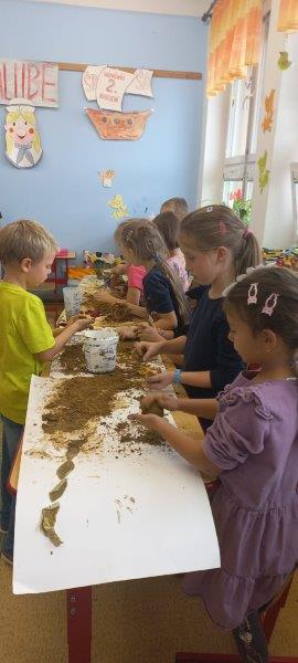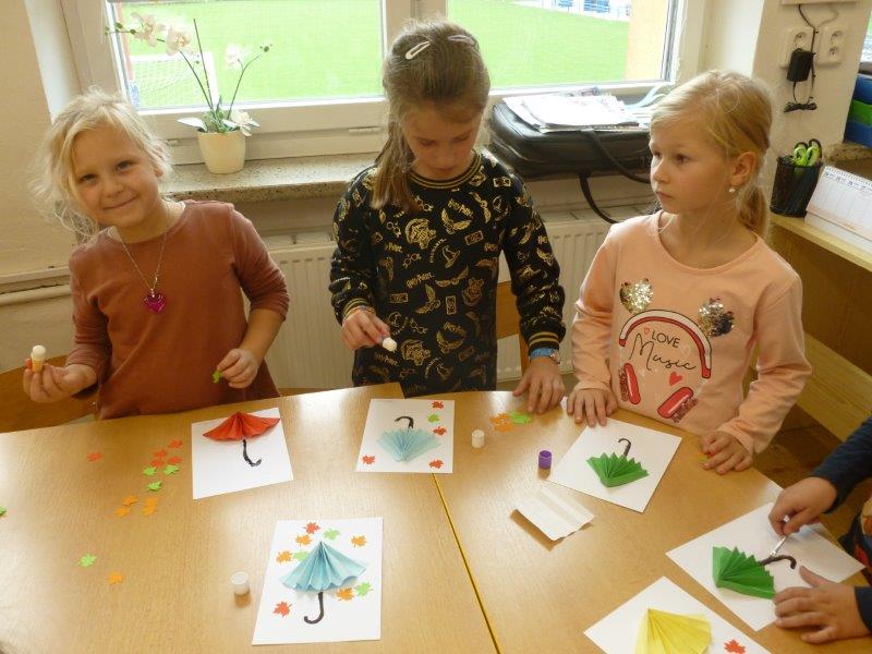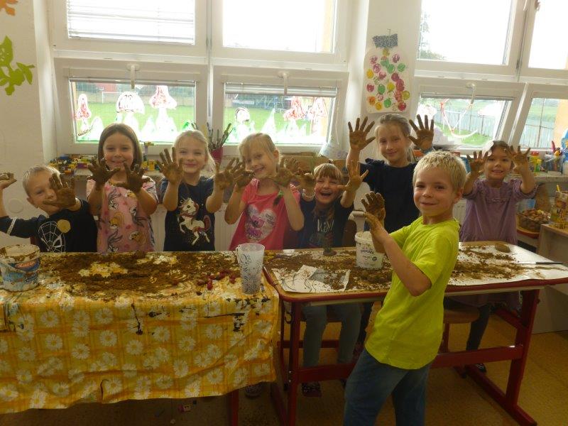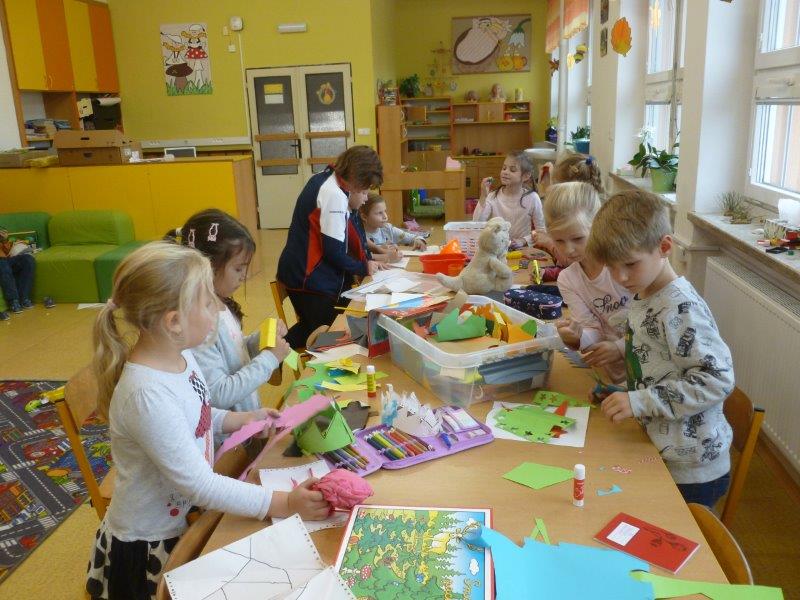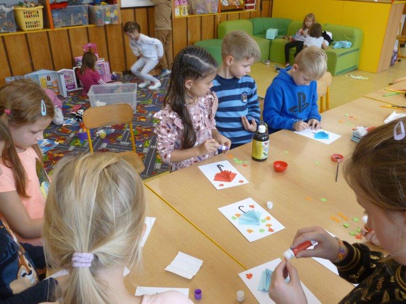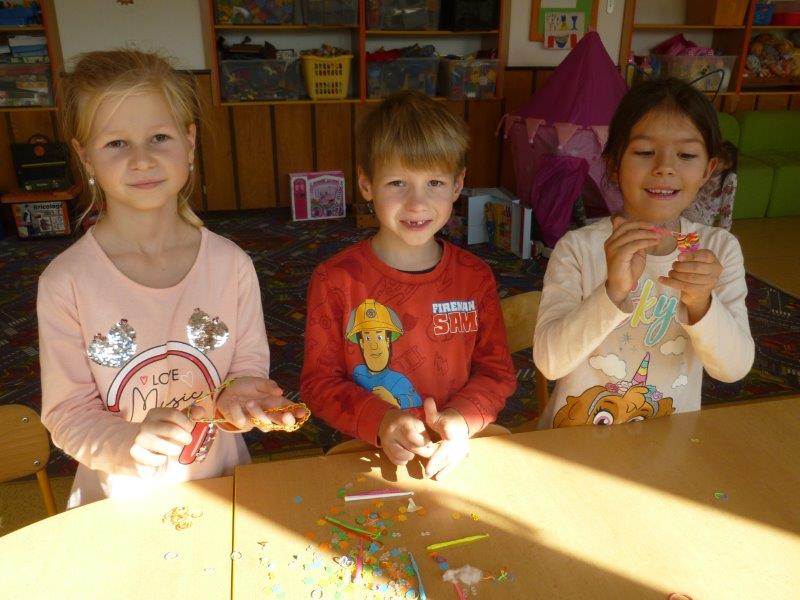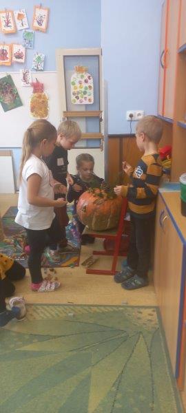 Písně o strašidlech jsme nacvičovali s nadšením. Dýni jsme si vystřihli papírovou a další vydlabali a nazdobili. Tím naše aktivita neskončila. Vytvořili jsme spoustu hliněných staveb, vymodelovali ježky, malovali obrázky, vystřihovali koruny pro princezny, sportovali v tělocvičně. Také jsme zvládli vyrobit obří i menší deštníky. V nastávajícím období dešťů se budou jistě hodit. Opět se k nám vrátilo zaplétání gumiček - upletené náramky, řetízky i prsteny nám moc sluší. Pokud počasí dovolilo, nezapomněli jsme si vyběhnout na hřiště.
