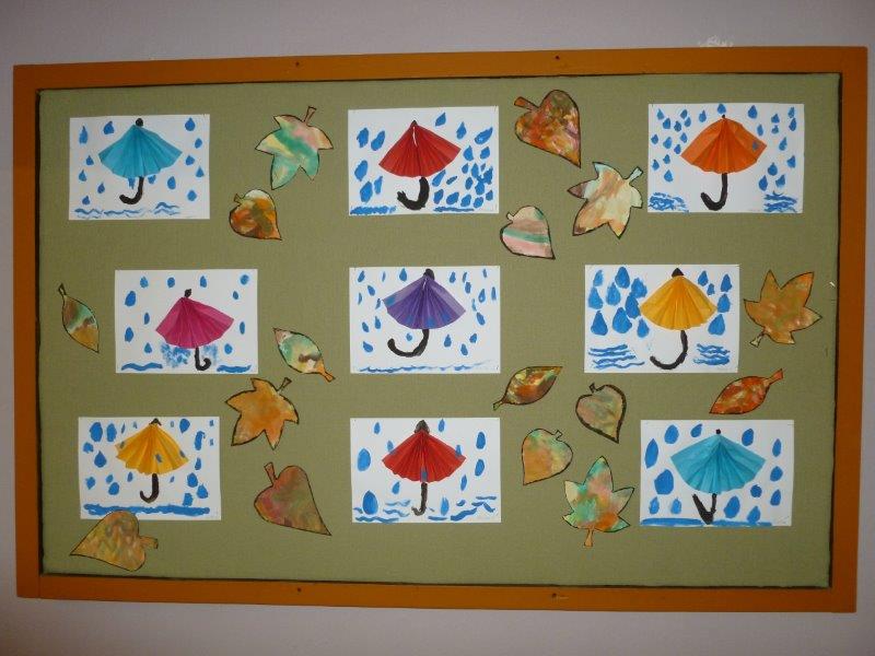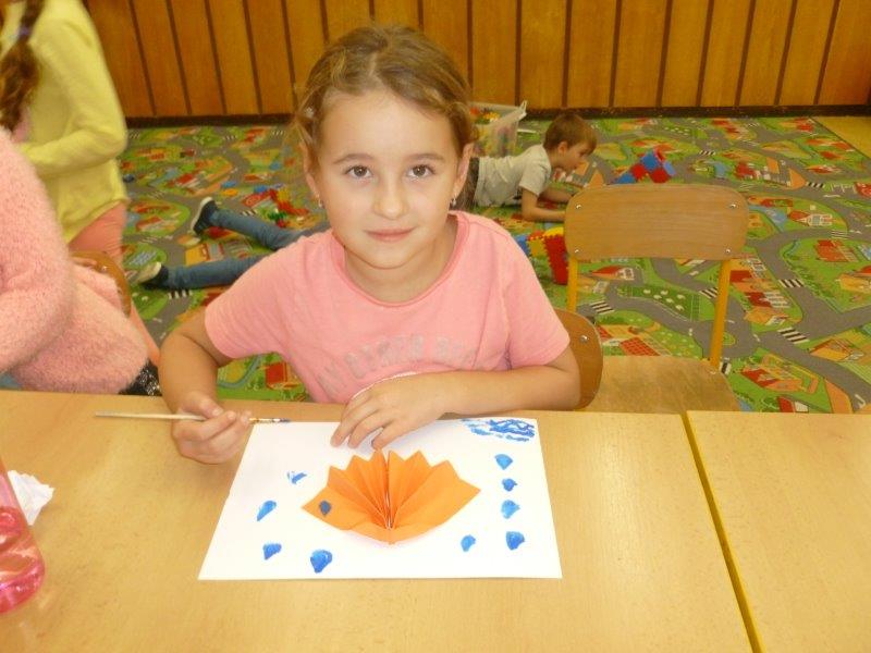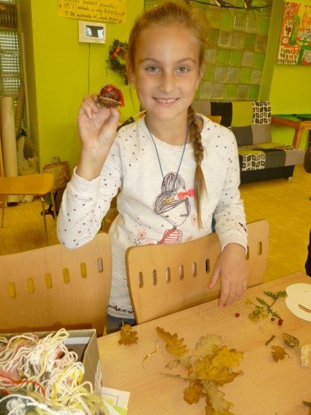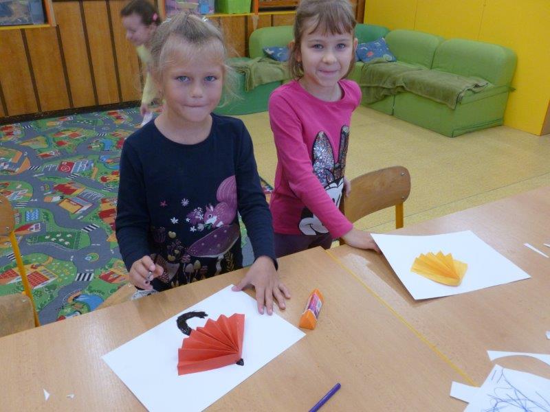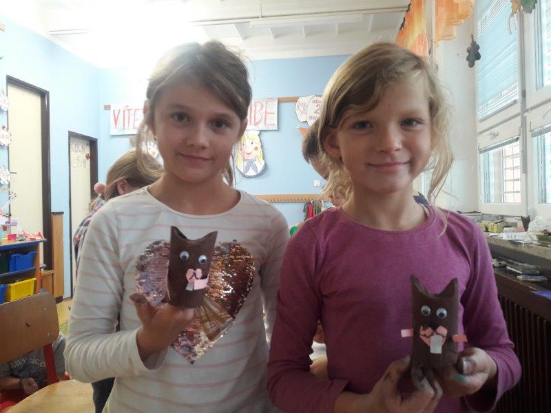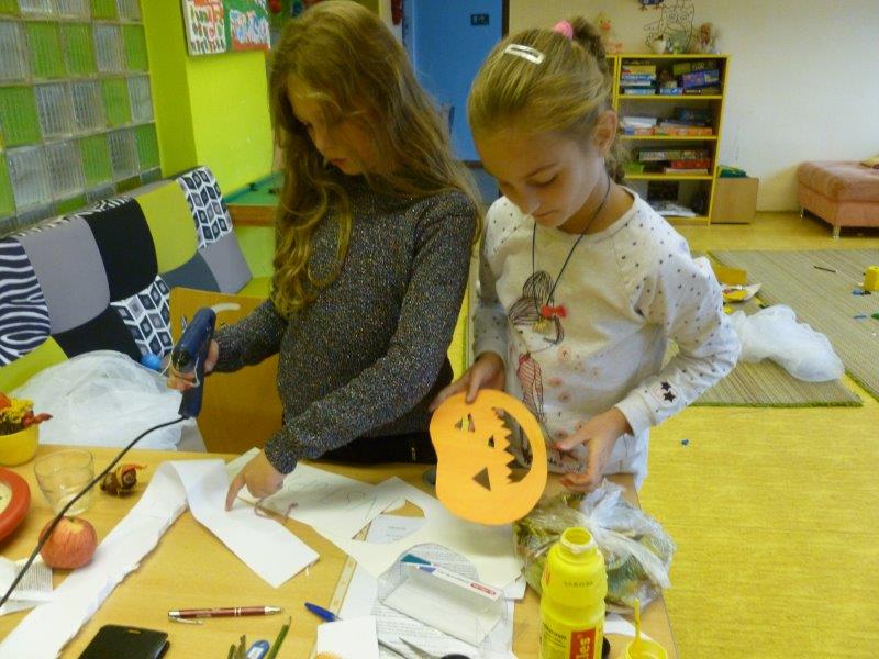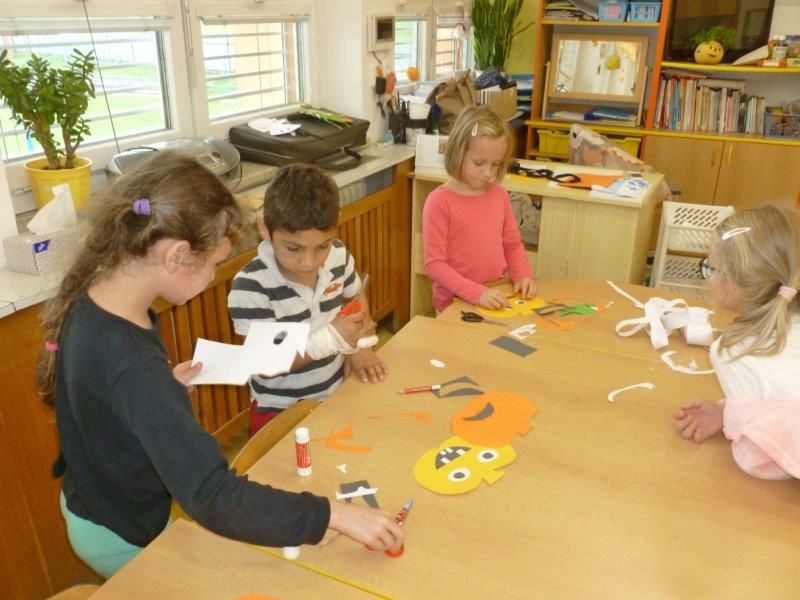 Dále jsme vyrobili zvířátka z ruliček, papírové ježky, dlabali dýně a tvořili z přírodnin. Na nově sestavené nástěnce jste viděli potřebné deštníčky a spadané listí. Hodně nás bavili halloweenské převleky.