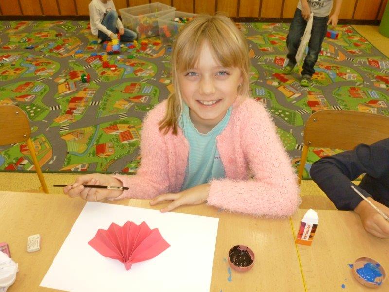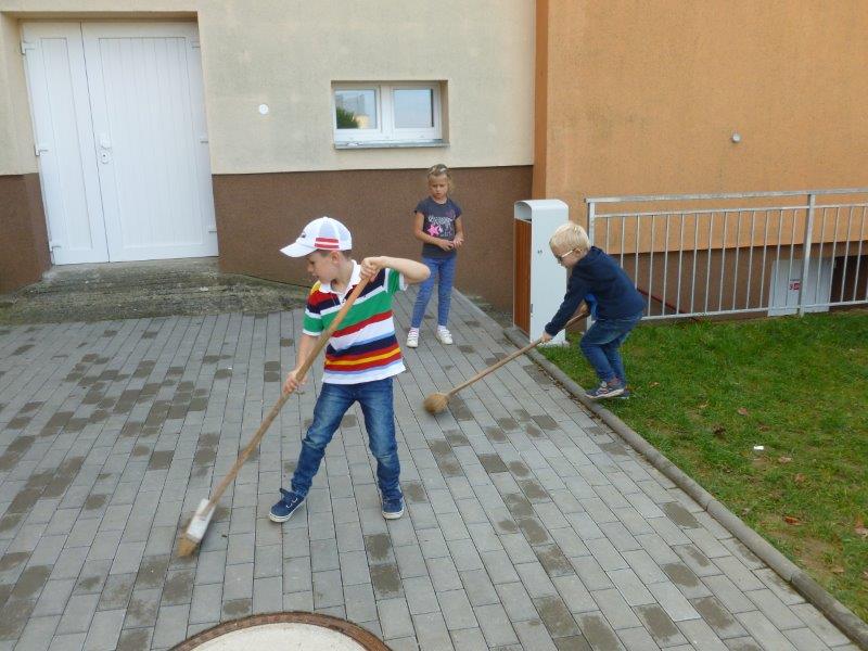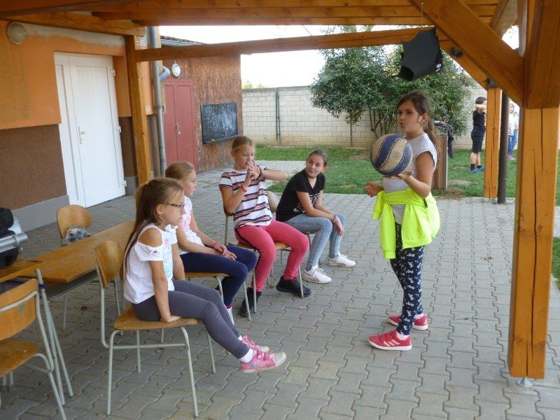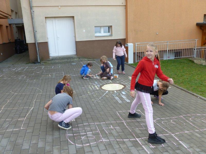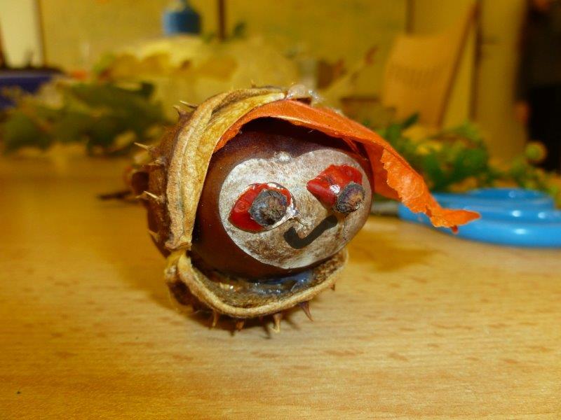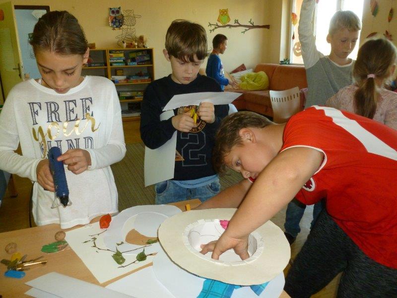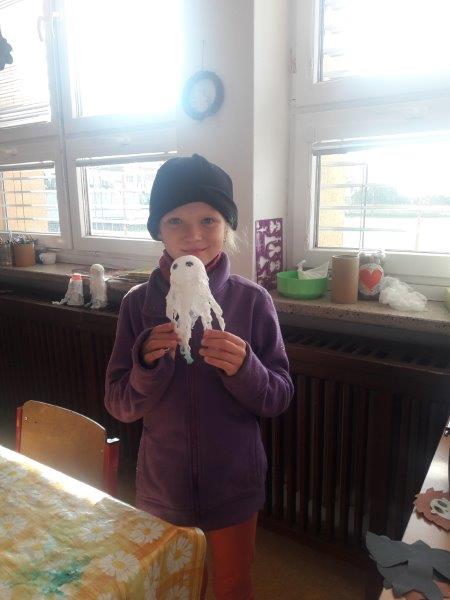 Dále jsme vyrobili zvířátka z ruliček, papírové ježky, dlabali dýně a tvořili z přírodnin. Na nově sestavené nástěnce jste viděli potřebné deštníčky a spadané listí. Hodně nás bavili halloweenské převleky.