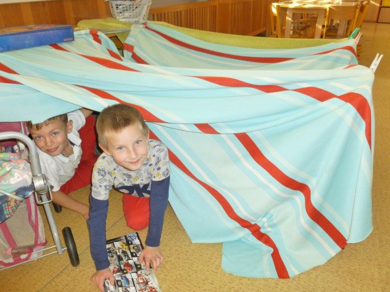 Spoustu času jsme při slunečných a nezvykle teplých dnech mohli trávit hraním na hřišti. Ve třídě jsme objevili novou zábavu – stavbu domečků z dek. Domečky jsme si udělali i z krabic. A jak nám sluší originální podzimní klobouček? Moc!