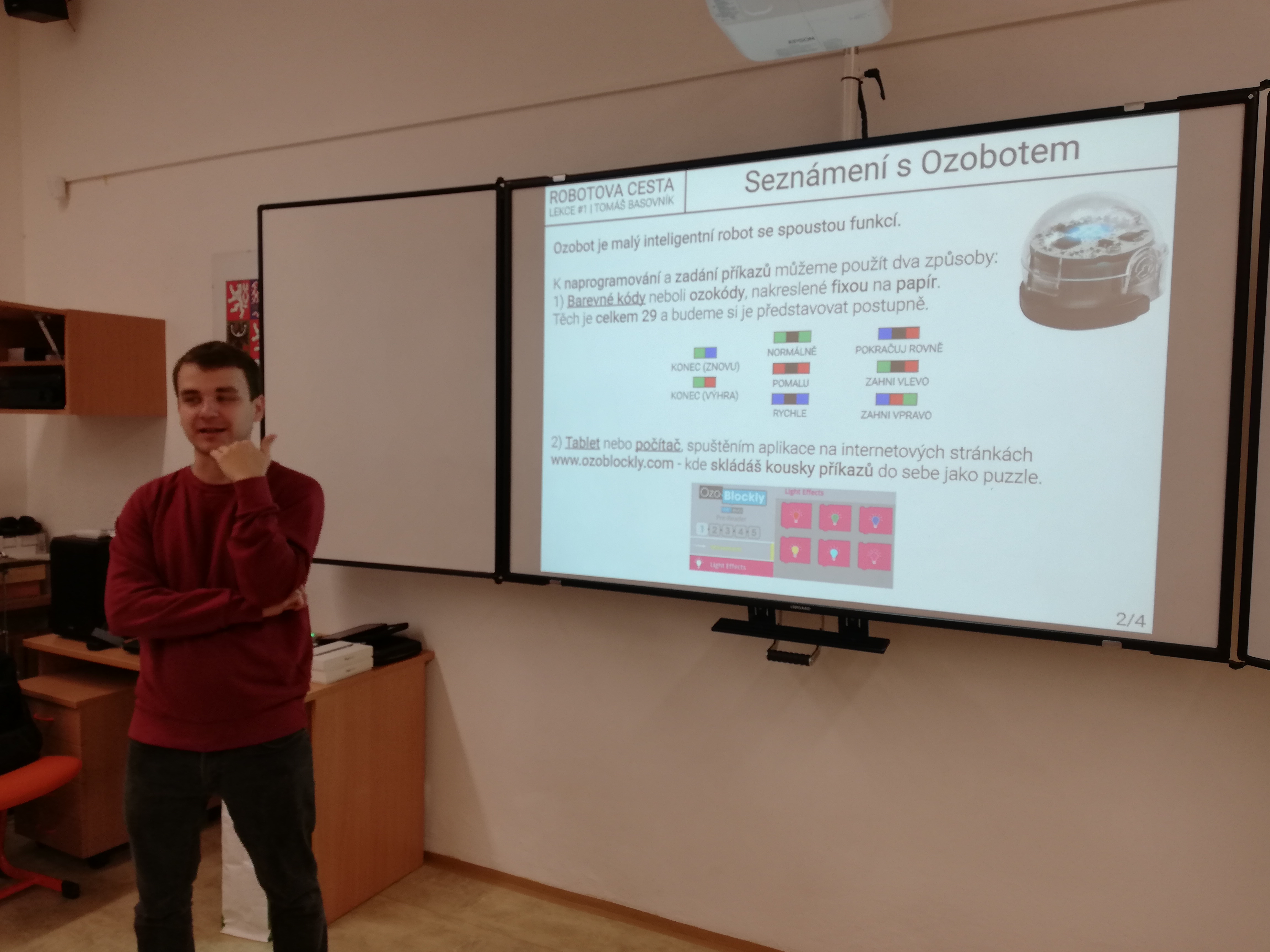 V pondělí 10.10. 22 navštívil žáky 3. -5. tř. pan Bc. Tomáš Basovník, který zahájil projektový den na téma Robotika. Projektový den byl zaměřen na základy informatického myšlení, robotiky, programování a automatizace. Pan lektor použil spoustu teoretických i praktických ukázek programování robotů pomocí barevných kódů nakreslených fixou na papír. Děti se učily zadávat robotovi příkazy, ovládat jeho rychlost, speciální pohyby, měnit barvu světel apod. Závěrečnou aktivitou byla ukázka programovatelného létajícího dronu, který všechny děti nadchnul.