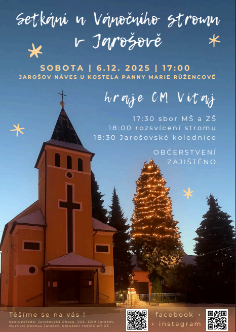 Jarošovské spolky zvou všechny na Setkání u vánočního stromu v Jarošově u kostela. Přijďte si v 17 hodin zazpívat společně s Jarošovskými kolednicemi, cimbálovkou i se sborem ZŠ a MŠ Jarošov. Těšit se můžete na krásný rozsvícený strom a dobré občerstvení.