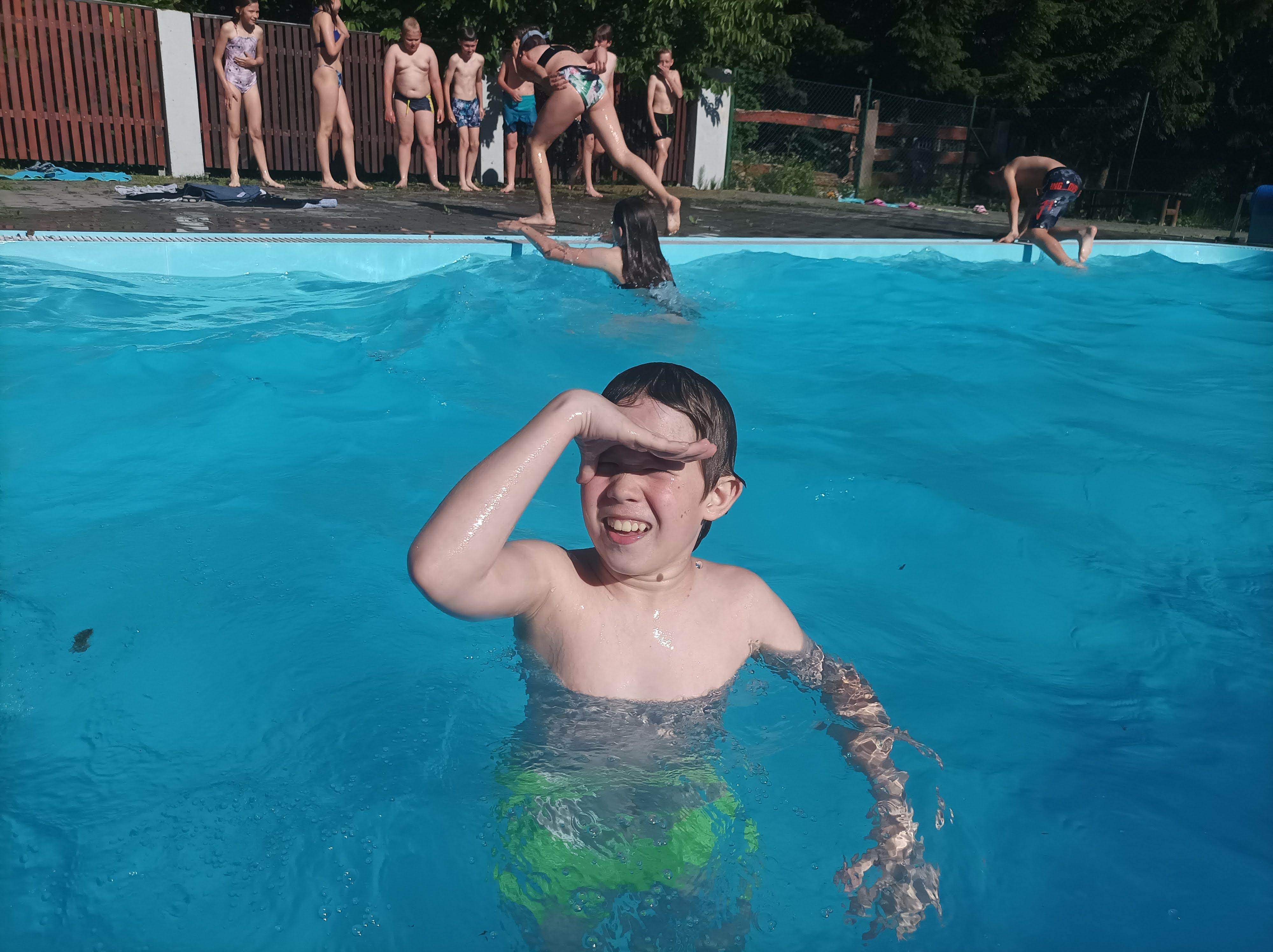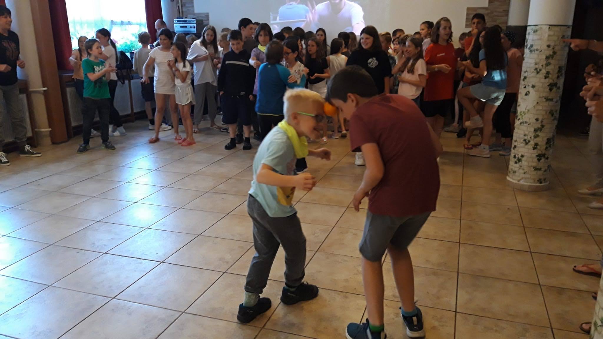A když už k nám naši partneři vážili dalekou cestu letadly, byla by škoda jim neukázat jarošovskou školu. Ve čtvrtek jsme tak prožili hezké dopoledne v tělocvičně. Tam na všechny čekal Jirka Sadila se spoustou cirkusového náčiní a zábavným programem. Žonglovali jsme, jezdili na netradičních kolech, rozpohybovávali jsme různé předměty a hlavně sebe. Poté už byly na řadě prohlídky školy, tříd, dětského parku a na závěr i samotného Uherského Hradiště. Po perném dni tak všichni nadšeně uvítali možnost ovlažení se v bazénku. Kopánkami se tak nesl radostný výskot dětí.