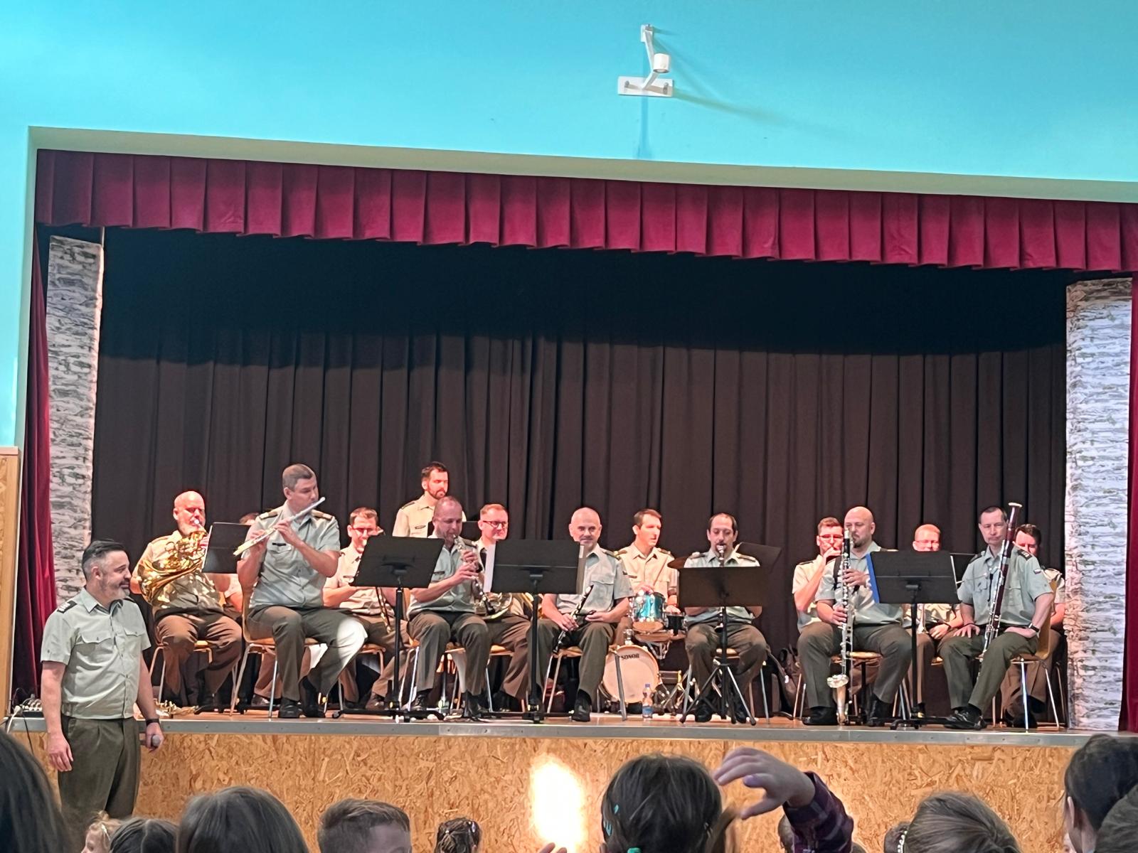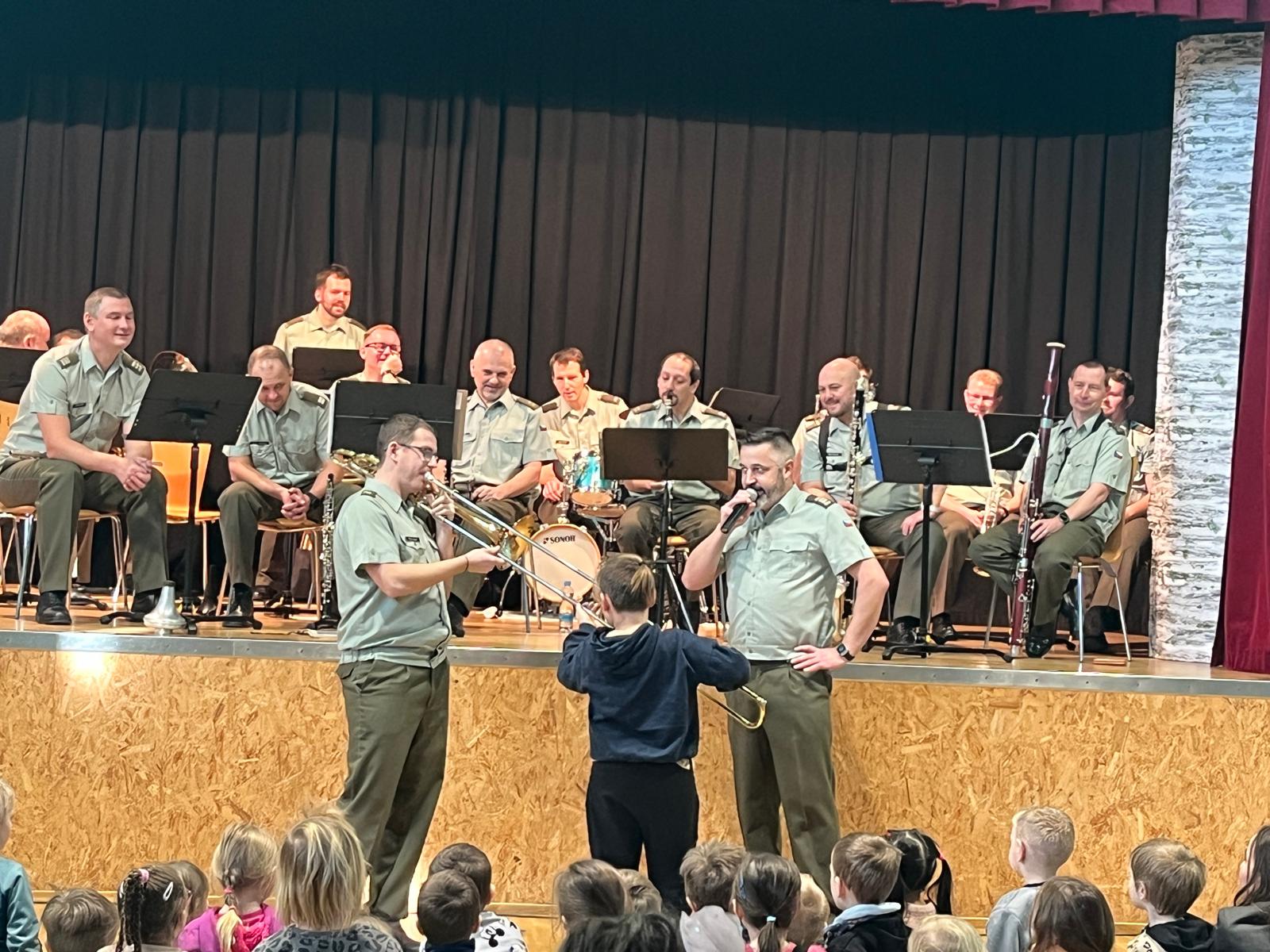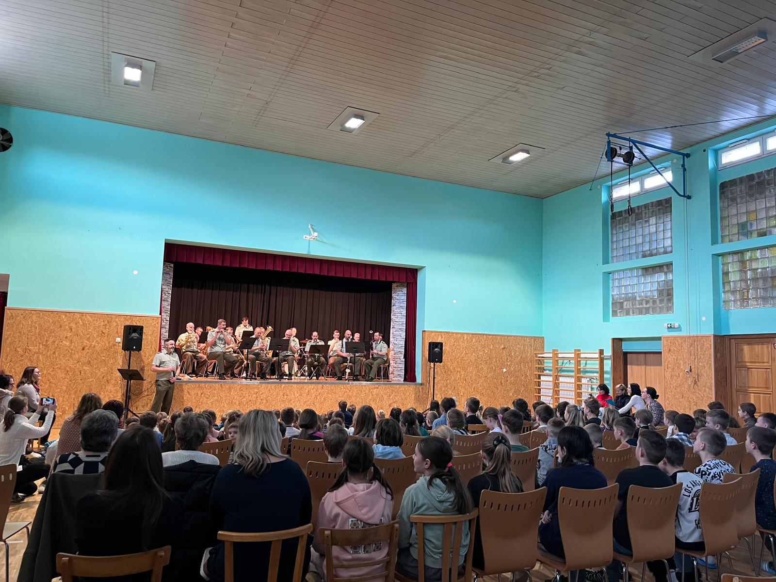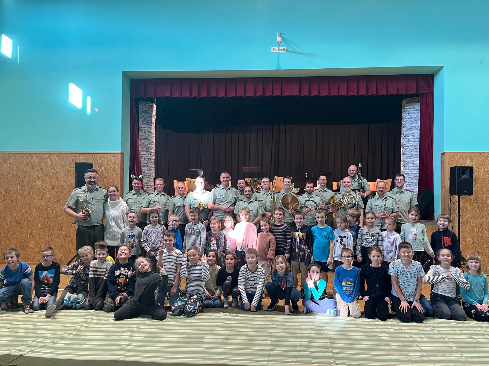 Nevšední kulturní zážitek jsme si užili v úterý 14. 1. 2025 v naší základní škole. Koncert „v zeleném“ – Vojenské Hudby Olomouc – byl nejen poslechový, ale i soutěžní. 17 vojáků – muzikantů – část VHO – nám předvedlo své nástroje, poznávali jsme také melodie ze známých pohádek a filmů, děti z MŠ se naučily pochodovat a my „starší“ žáci jsme si zazpívali i zařádili. Vojáci byli veselí a bylo vidět i slyšet, že je to s námi baví. A nás to bavilo také – viz. fotogalerie :-)