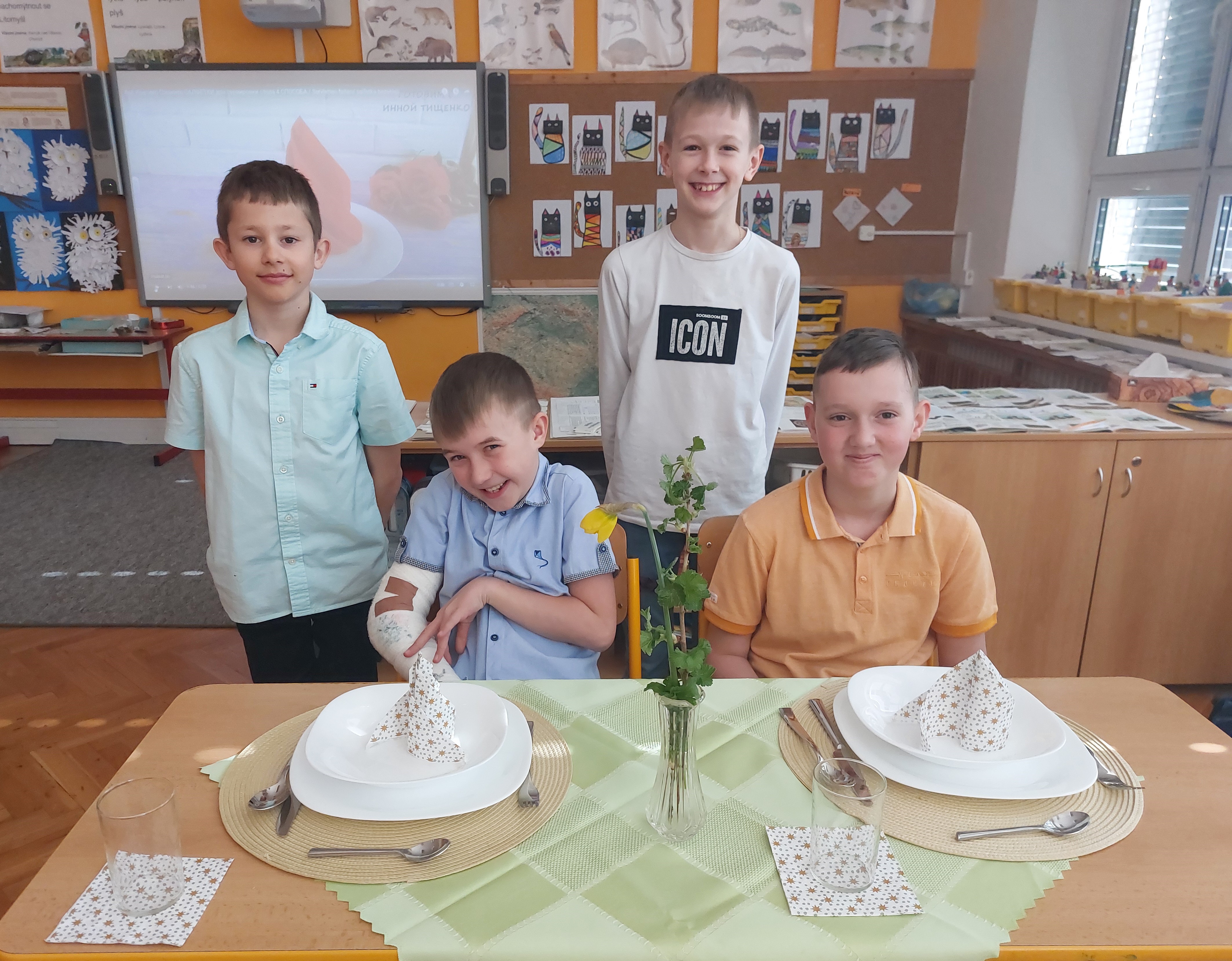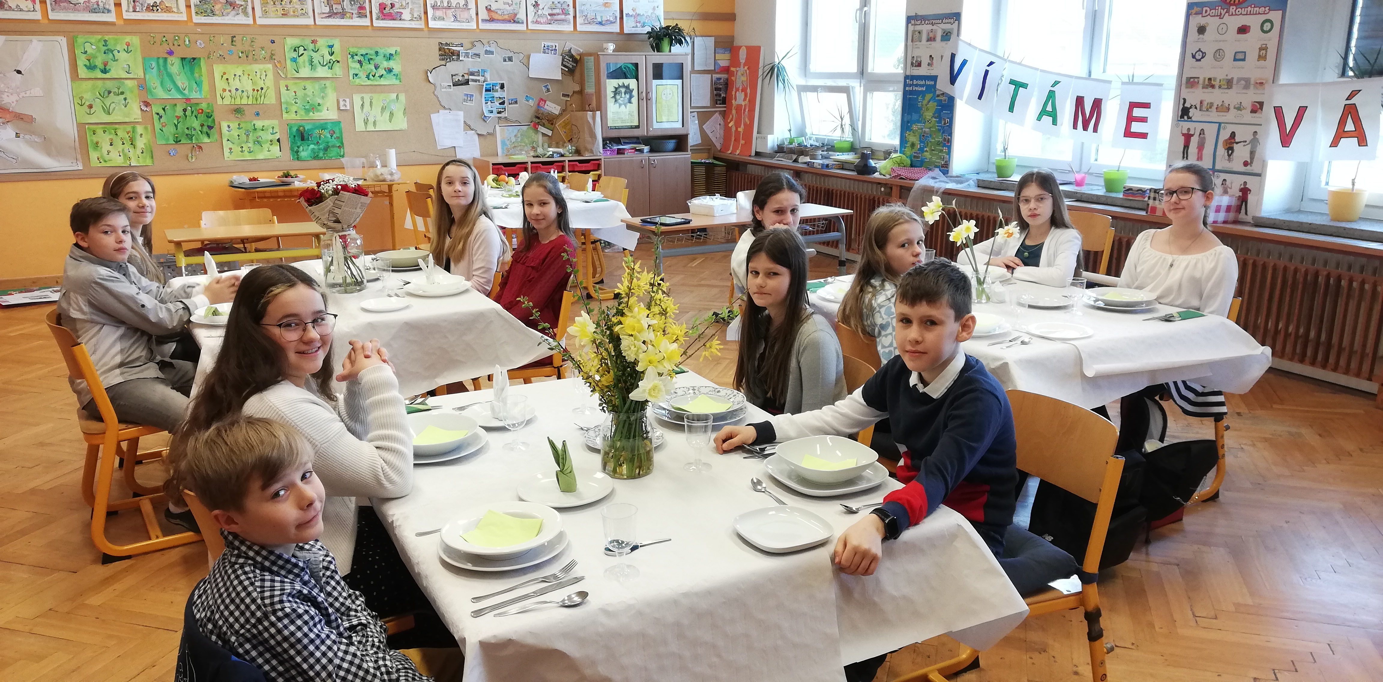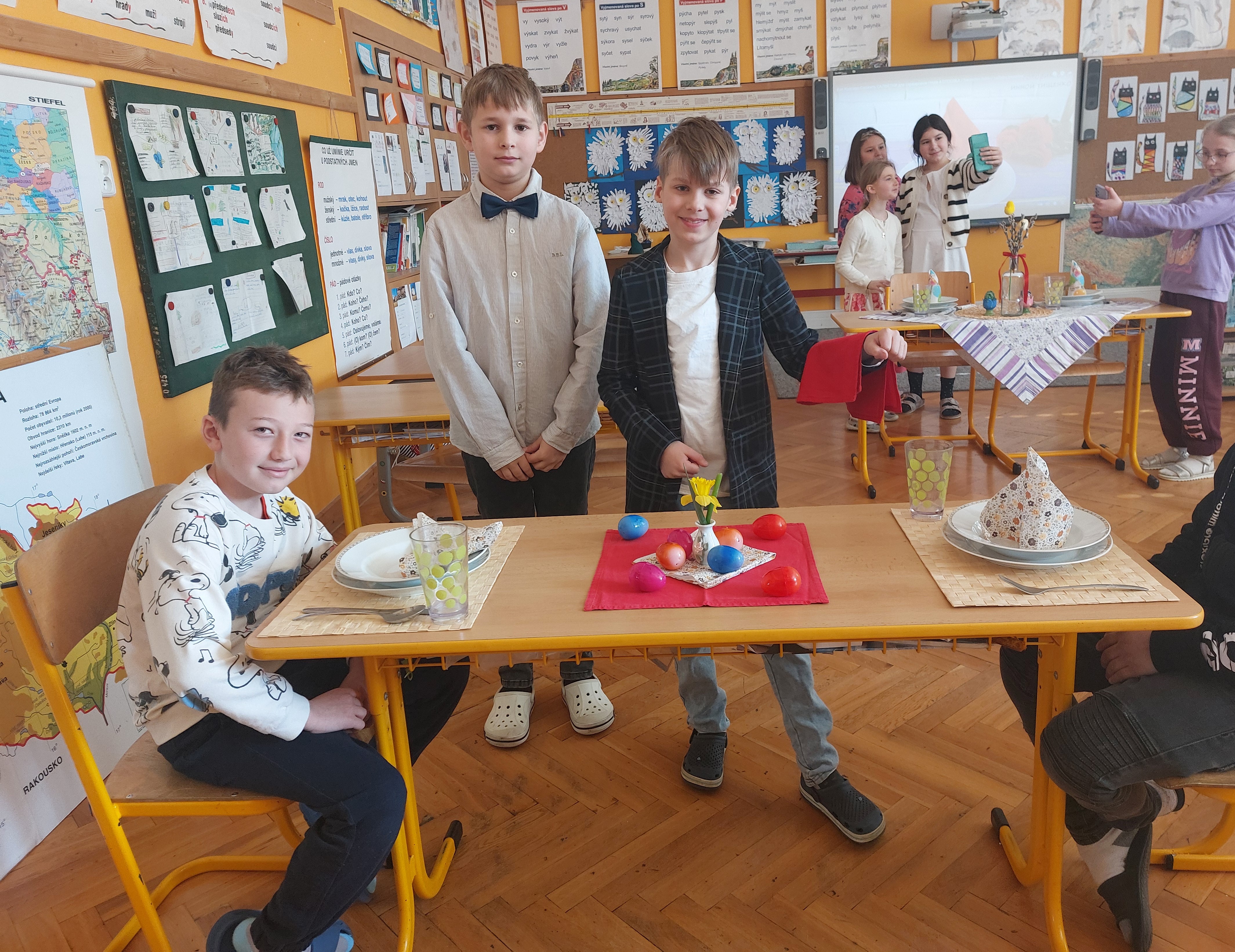 Slušivé oblečení bylo samozřejmostí a celé dopoledne se neslo v duchu etikety. Velké téma bylo stolování a příprava sváteční tabule. Děti se v rámci projektového vyučování seznámily s tím, co je vhodné i nevhodné nosit do společnosti, na svatbu, o svátcích či při dalších společenských příležitostech. Někteří si dokonce zkusili vázat kravatu. V jiných třídách probíhala příprava slavnostních pokrmů a nápojů. Chystání slavnostní tabule tak mají děti již nyní v malíčku a pan Špaček by měl určitě z našich žáků radost.