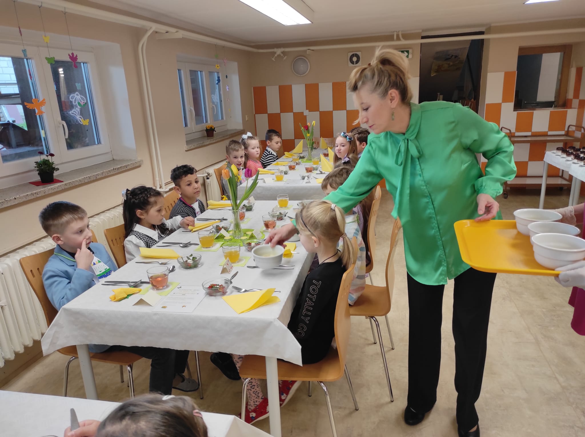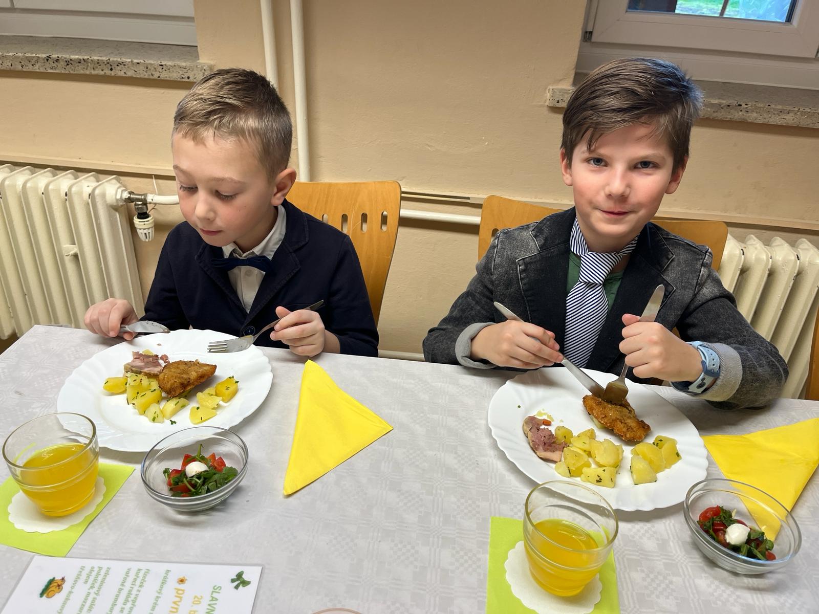 Paní psycholožka v každé třídě prezentovala etiketu slušného chování a žáci si mohli vyrobit malý dárek v podobě papírové kravaty nebo hezké dámské kabelky. Na závěr dne se postupně všichni přesunuli do školní jídelny, která byla vskutku neobyčejná. Vše vypadalo jako v noblesní restauraci, a to díky paní kuchařkám. Ty měly přichystaný slavnostní oběd s dezertem. Vkusně přichystané stoly, květinové dekorace a obsluha jako v restauraci už byla jen krásnou tečkou za neobyčejným, noblesním, školním dnem.