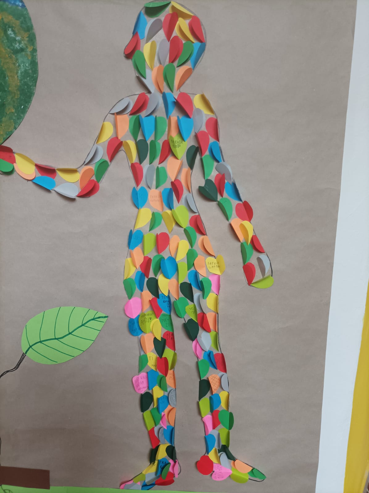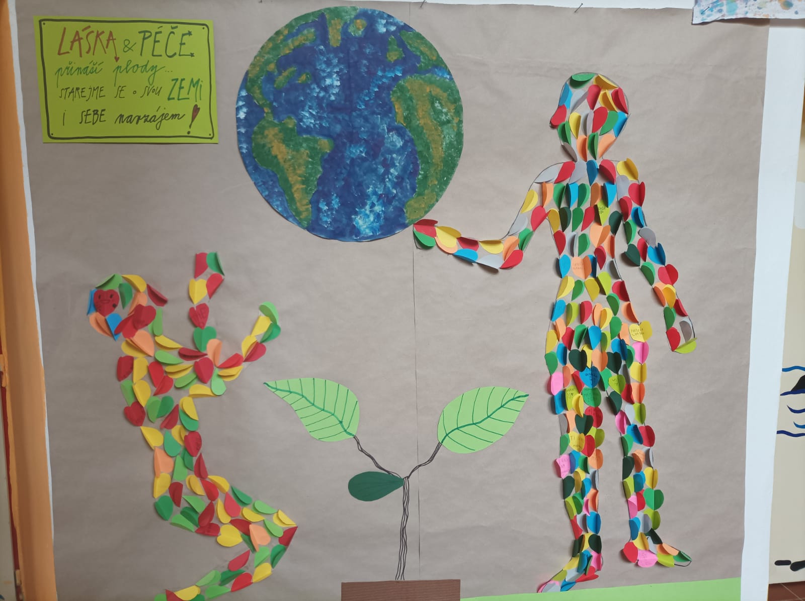 První a druhá třída – vzít do ruky nůžky, soustředit se a vystřihnout co nejvíce pěkných barevných srdíček. Potom do nich napsat vzkaz naší nádherné Zemi. A pak lepit a lepit, až vznikne krásné 3D prostorové výtvarné dílo. Osvěžilo naše chodby – děkujeme!
