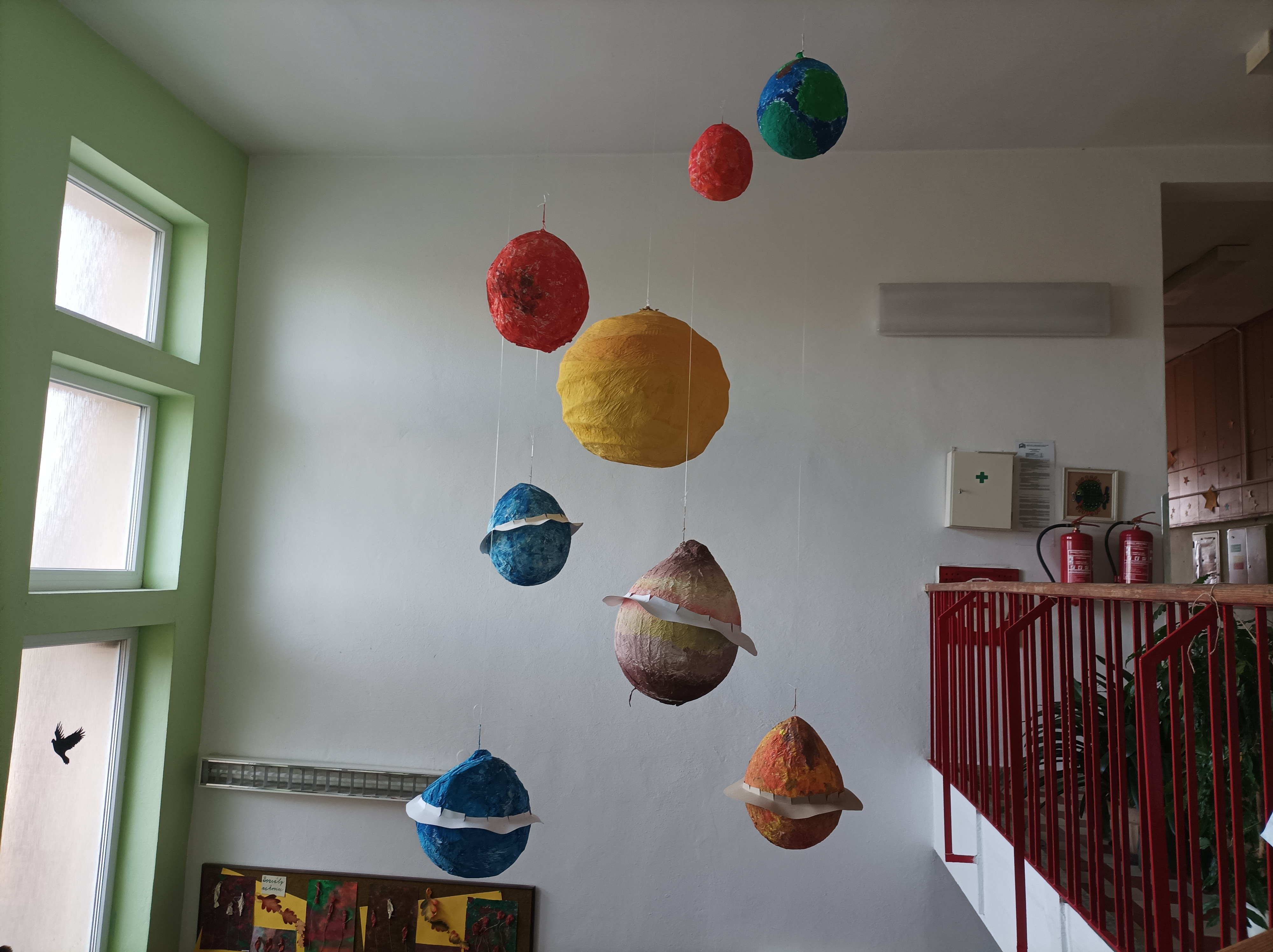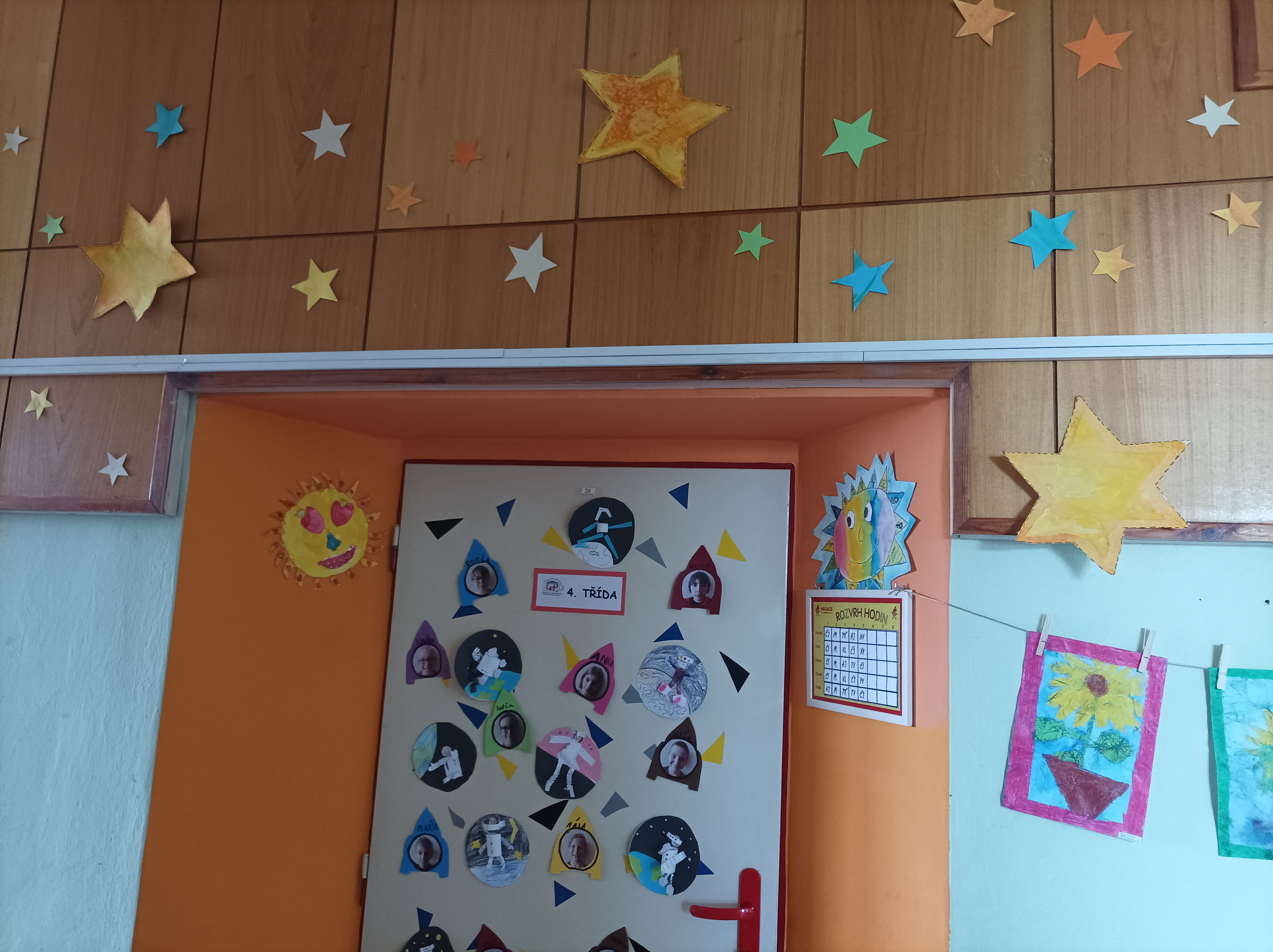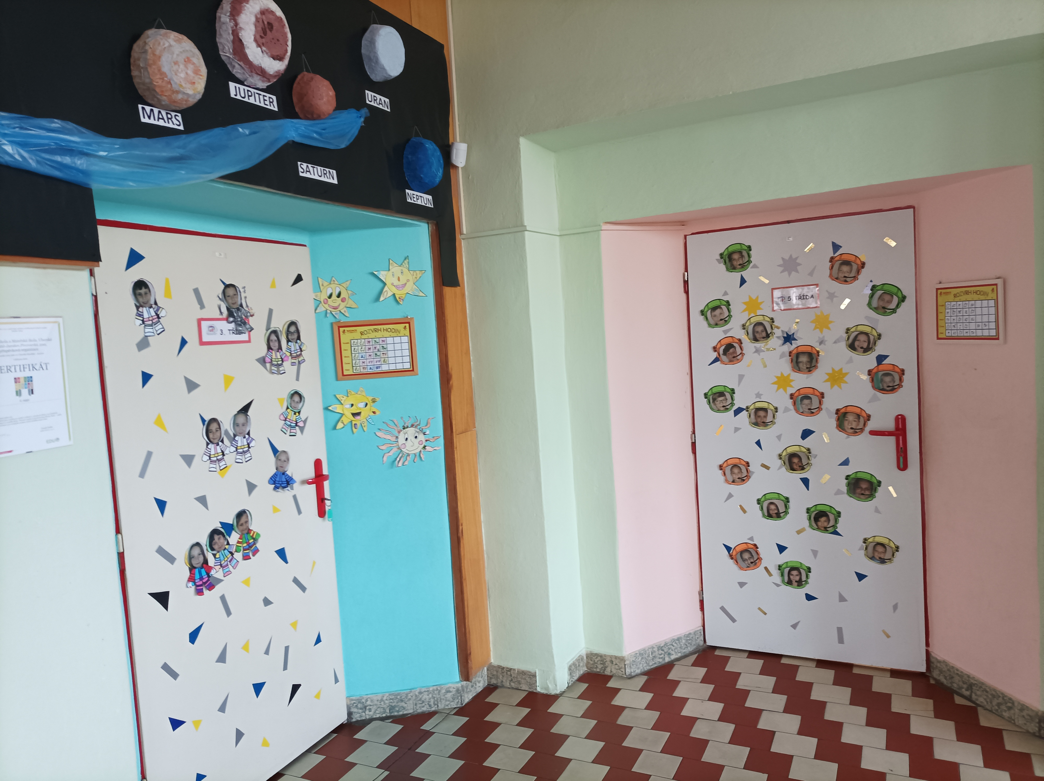 Do vesmíru se dostanete, když vystoupáte do prvního patra školy. Starší žáci se postupně zapojili do vytváření výzdob a teď tu máme krásný 3D model Sluneční soustavy, mléčnou dráhu a dveře třídy zdobí kosmonauti – portréty našich dětí. Moc hezky se tak propojily pomůcky pro výuku v přírodovědě a osvěžující přístup k nové výzdobě chodeb. Děkujeme třeťákům, čtvrťákům i páťákům!