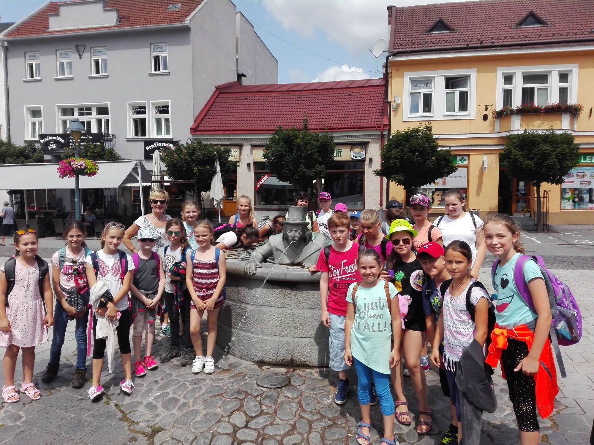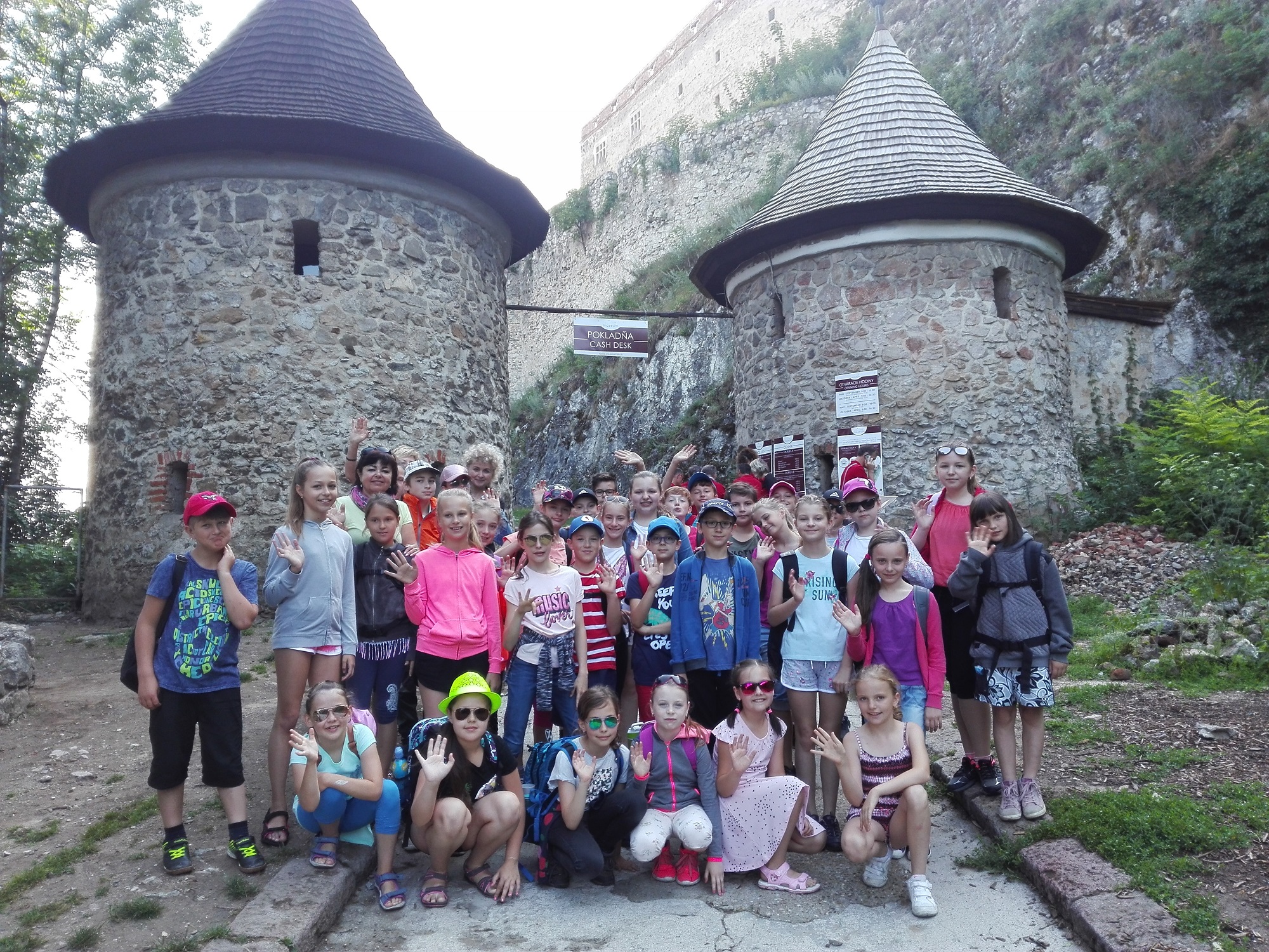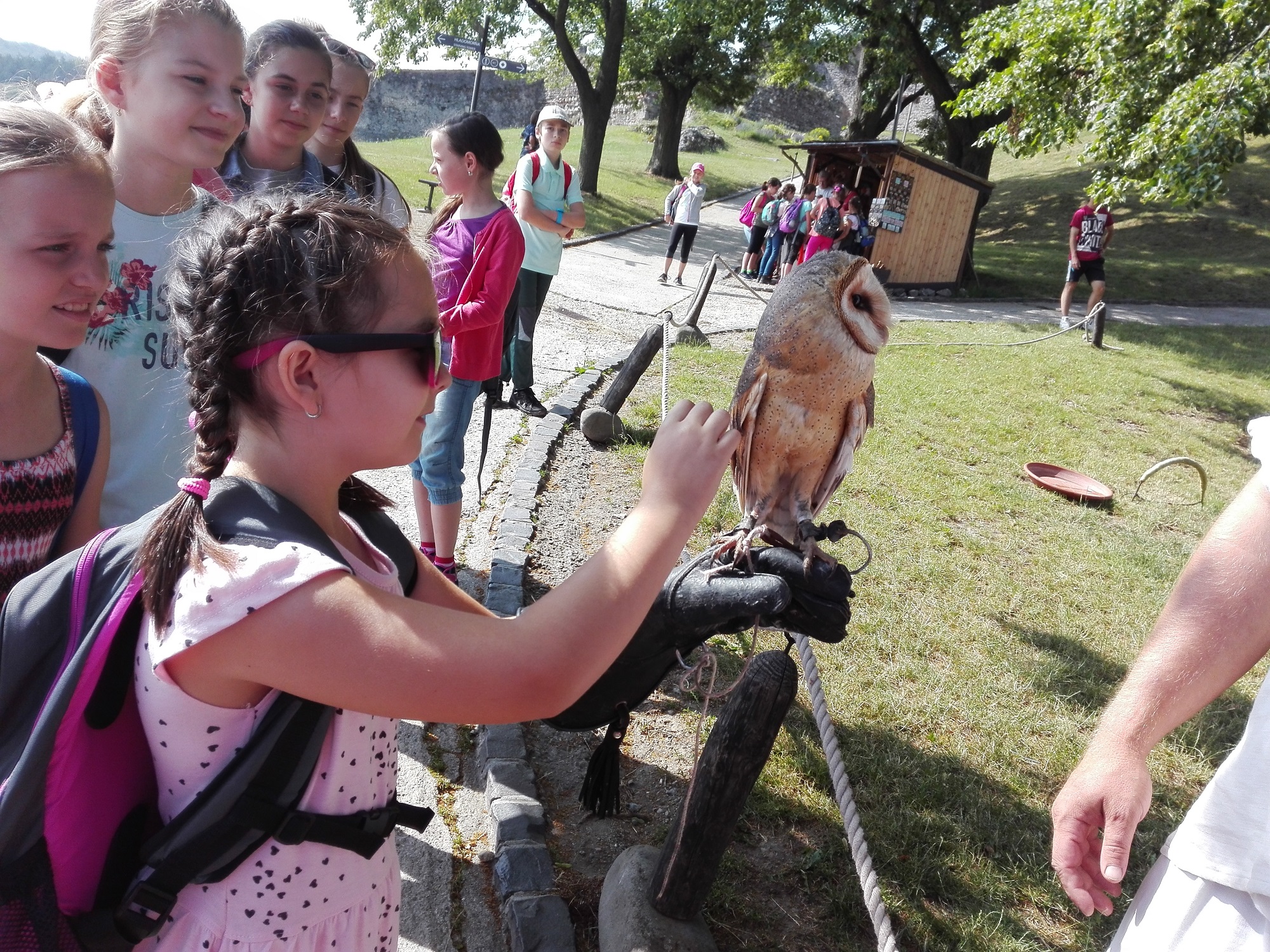 Na Trenčianský hrad a do Trenčianských Teplic se vydali žáci z páté, čtvrté a třetí třídy. Za celý výlet vděčíme Nadaci SYNOT. Děkujeme. Po příjezdu k hotelu Elizabeth v Trenčíně jsme se vydali malebnou cestou na zdejší středověký hrad, kde pro nás bylo nachystáno i několik aktivit a stánek se suvenýry. Mohli jsme si dokonce ponosit na ruce živou sovičku. Součástí hradu je i hladomorna a Matyášova věž. Tu jsme zdolali po zajímavých schodech, každý byl totiž jinak vysoký a jinak široký. Museli jsme si dávat pozor. Cesta vzhůru se vyplatila. Naskytl se nám totiž nádherný výhled na řeku Váh a blízké i vzdálené okolí. Po sestupu dolů nás čekalo vystoupení herců v dobových kostýmech v amfiteátru na nádvoří. A protože nám zbyla ještě chvilka do odjezdu, vydali jsme se na náměstí k fontáně, kterou tvořila socha vodníka. Kdo by odolal příjemnému ovlažení?