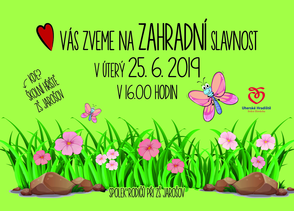 Milí předškoláci, současní a bývalí školáci, vážení rodiče, srdečně Vás zveme na Zahradní slavnost ZŠ Jarošov, která se uskuteční v úterý 25. června 2019 od 16.00 na školním hřišti. Proběhne rozloučení s našimi páťáky a navodíme si prázdninovou atmosféru… Pro děti budou připraveny soutěže, skákací hrad, opékání špekáčků. Raut bude tak bohatý, jak do něj sami přispějete, pitný režim pro děti i dospělé je zajištěn. Budeme připraveni Vám zodpovědět případné dotazy týkající se vstupu dětí do školy či průběhu vzdělávání v naší škole. Současně proběhne první třídní schůzka s paní učitelkou 1. třídy. Těší se na Vás Spolek rodičů při ZŠ Jarošov a zaměstnanci školy.