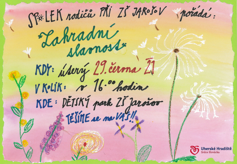 Zveme Vás na ZAHRADNÍ SLAVNOST, která se uskuteční v úterý 29. června 2021 od 16 hodin v Dětském parku ZŠ Jarošov.